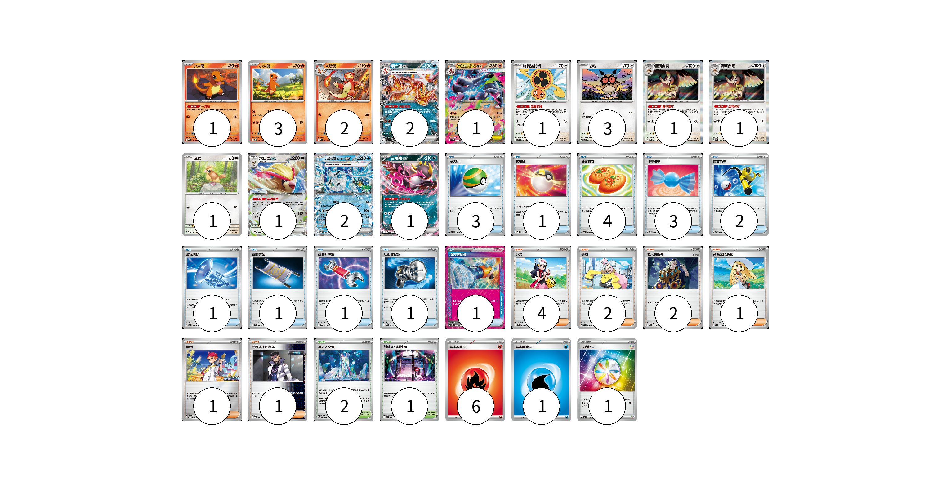 牌組構築方案 以此牌組為基礎新構築牌組 顯示卡面 顯示列表 寶可夢卡(20) 1 3 2 2 1 1 3 1 1 1 1 2 1 物品卡(18) 3 1 4 3 2 1 1 1 1 1 支援者卡(11) 4 2 2 1 1 1 競技場卡(3) 2 1 能量卡(8) 6 1 1 寶可夢卡(20) 卡牌名稱 張數 卡牌名稱 張數 小火龍 M2 011/080 01 小火龍 SVTL 001/021 03 火恐龍 M2 012/080 02 噴火龍ex SVTL 006/021 02 超級噴火龍Xex M2 013/080 01 旋轉洛托姆 SV7 080/102 01 咕咕 SV7 076/102 03 貓頭夜鷹 SV7 077/102 01 貓頭夜鷹 SV8a 128/187 01 波波 SV3 087/108 01 大比鳥ex SV4a 139/190 01 厄鬼椪 水井面具ex SV6 038/101 02 吉雉雞ex SV8a 104/187 01 物品卡(18) 卡牌名稱 張數 卡牌名稱 張數 巢穴球 SVK 016/042 03 高級球 MBG 012/022 01 好友寶芬 MBG 011/022 04 神奇糖果 SVTG 014/019 03 厲害釣竿 SVTG 009/019 02 玻璃喇叭 SV7 089/102 01 夜間擔架 SV8a 151/187 01 道具拆除器 SV11W 080/086 01 反擊捕捉器 SV8a 139/187 01 頂尖捕捉器 SV5M 062/071 01 支援者卡(11) 卡牌名稱 張數 卡牌名稱 張數 小光 M2 077/080 04 奇樹 SVTR 017/021 02 老大的指令 MBG 021/022 02 莉莉艾的決意 M1L 062/063 01 赤松 SV-P 150/SV-P 01 弗圖博士的劇本 SV8a 175/187 01 競技場卡(3) 卡牌名稱 張數 卡牌名稱 張數 零之大空洞 SV7 102/102 02 對戰圓形競技場 M2 079/080 01 能量卡(8) 卡牌名稱 張數 卡牌名稱 張數 基本火能量 sv-p FIR 06 基本水能量 sv-p WAT 01 夜光能量 SV4a 190/190 01 以此牌組為基礎新構築牌組 牌組編碼 OpPpsL-EsmZCc-SrjSlH copy 列印牌組單 牌組編碼已複製 分享至SNS