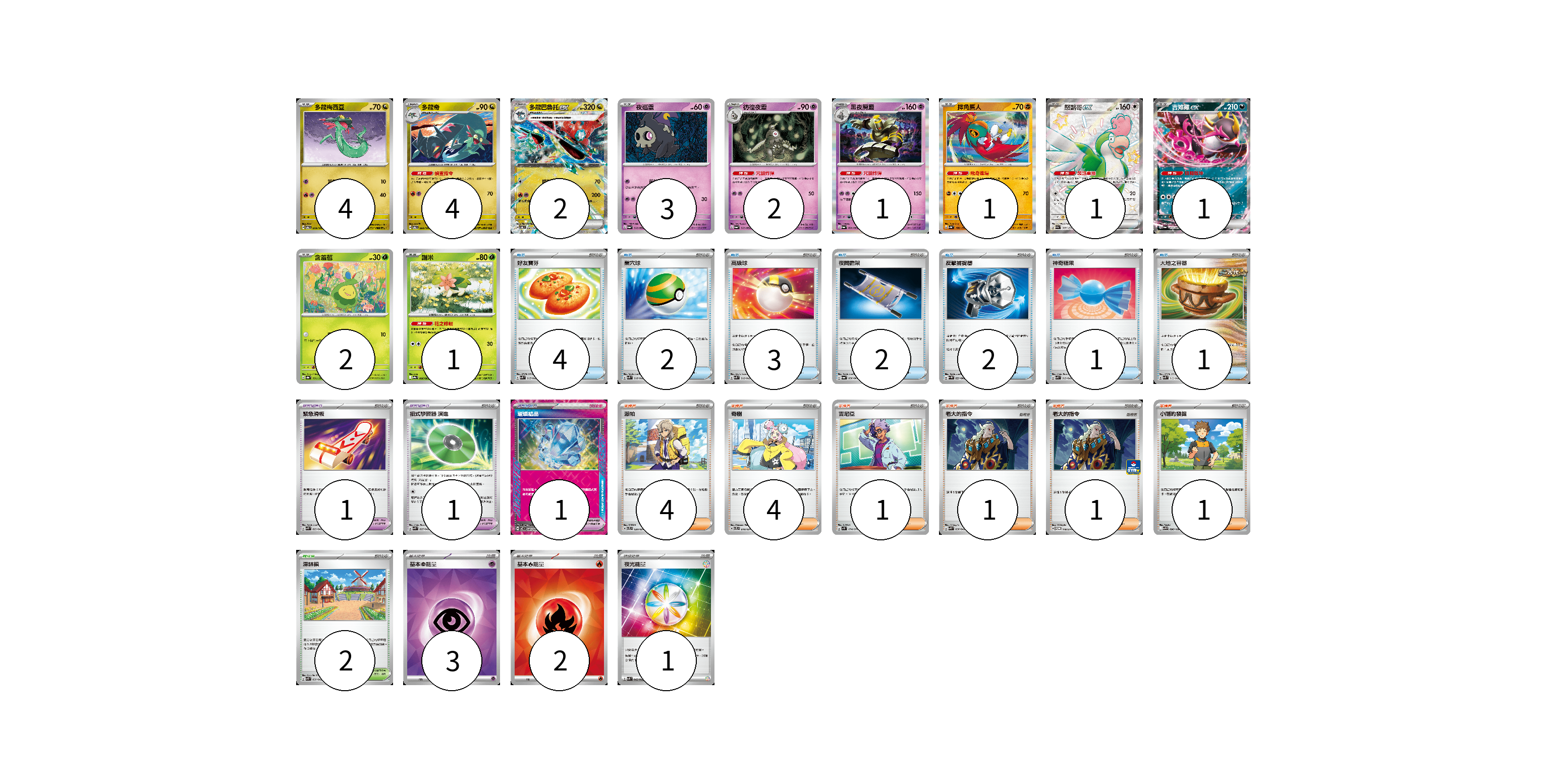 牌組構築方案 以此牌組為基礎新構築牌組 顯示卡面 顯示列表 寶可夢卡(22) 4 4 2 3 2 1 1 1 1 2 1 寶可夢道具(7) 1 1 1 4 物品卡(15) 4 2 3 2 2 1 1 支援者卡(8) 4 1 1 1 1 競技場卡(2) 2 能量卡(6) 3 2 1 寶可夢卡(22) 卡牌名稱 張數 卡牌名稱 張數 多龍梅西亞 SV6 079/101 04 多龍奇 SV6 080/101 04 多龍巴魯托ex SV6 081/101 02 夜巡靈 SV6a 018/064 03 彷徨夜靈 SV6a 019/064 02 黑夜魔靈 SV6a 020/064 01 摔角鷹人 SV4a 106/190 01 怒鸚哥ex SV4a 337/190 01 吉雉雞ex SV6a 038/064 01 含羞苞 SV8a 001/187 02 謝米 SV9a 006/063 01 寶可夢道具(7) 卡牌名稱 張數 卡牌名稱 張數 緊急滑板 SVK 023/042 01 招式學習器 演進 SVK 025/042 01 璀璨結晶 SV7 094/102 01 奇樹 SVTL 018/021 04 物品卡(15) 卡牌名稱 張數 卡牌名稱 張數 好友寶芬 SVK 015/042 04 巢穴球 SVK 016/042 02 高級球 SVK 018/042 03 夜間擔架 SV6a 056/064 02 反擊捕捉器 SV4M 059/066 02 神奇糖果 SVK 019/042 01 大地之容器 SVK 012/042 01 支援者卡(8) 卡牌名稱 張數 卡牌名稱 張數 派帕 SVTL 020/021 04 吉尼亞 SV1S 074/078 01 老大的指令 SVK 036/042 01 老大的指令 SV-P 178/SV-P 01 小剛的發掘 SV9 096/100 01 競技場卡(2) 卡牌名稱 張數 卡牌名稱 張數 深缽鎮 SVK 039/042 02 能量卡(6) 卡牌名稱 張數 卡牌名稱 張數 基本【超】能量 SVK PSY 03 基本【火】能量 SVK FIR 02 夜光能量 SVK 042/042 01 以此牌組為基礎新構築牌組 牌組編碼 OqfpLH-gVwdkb-ITiBBg copy 列印牌組單 牌組編碼已複製 分享至SNS
