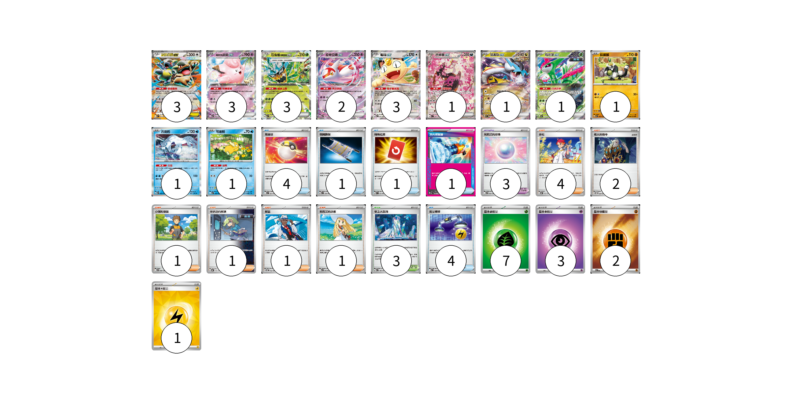 牌組構築方案 以此牌組為基礎新構築牌組 顯示卡面 顯示列表 寶可夢卡(20) 3 3 3 2 3 1 1 1 1 1 1 寶可夢道具(3) 3 物品卡(11) 4 1 1 1 4 支援者卡(10) 4 2 1 1 1 1 競技場卡(3) 3 能量卡(13) 7 3 2 1 寶可夢卡(20) 卡牌名稱 張數 卡牌名稱 張數 超級袋獸ex M1S 051/063 03 莉莉艾的皮皮ex M2a 060/193 03 厄鬼椪 碧草面具ex M2a 017/193 03 拉帝亞斯ex M2a 075/193 02 喵喵ex M3 061/080 03 吉雉雞ex M2a 244/193 01 猛雷鼓ex SV5K 053/071 01 鐵斑葉ex SV5M 016/071 01 投擲猴 MC 407/742 01 古劍豹 M2a 043/193 01 可達鴨 M2a 032/193 01 寶可夢道具(3) 卡牌名稱 張數 卡牌名稱 張數 莉莉艾的珍珠 SV9 093/100 03 物品卡(11) 卡牌名稱 張數 卡牌名稱 張數 高級球 MC 651/742 04 夜間擔架 MC 670/742 01 特殊紅牌 M4 072/083 01 頂尖捕捉器 MC 656/742 01 能量轉移 MC 638/742 04 支援者卡(10) 卡牌名稱 張數 卡牌名稱 張數 赤松 SV8a 163/187 04 老大的指令 SVOM 020/021 02 小剛的發掘 SV9 096/100 01 暗碼迷的解讀 SV8a 165/187 01 席藍 SV8 102/106 01 莉莉艾的決意 M1L 062/063 01 競技場卡(3) 卡牌名稱 張數 卡牌名稱 張數 零之大空洞 M2a 184/193 03 能量卡(13) 卡牌名稱 張數 卡牌名稱 張數 基本【草】能量 M-P GRA 07 基本【超】能量 M-P PSY 03 基本【鬥】能量 MC FIG 02 基本【雷】能量 SVQP LIG 01 以此牌組為基礎新構築牌組 牌組編碼 OvDYNf-ZwhUHb-dwQiHJ copy 列印牌組單 牌組編碼已複製 分享至SNS