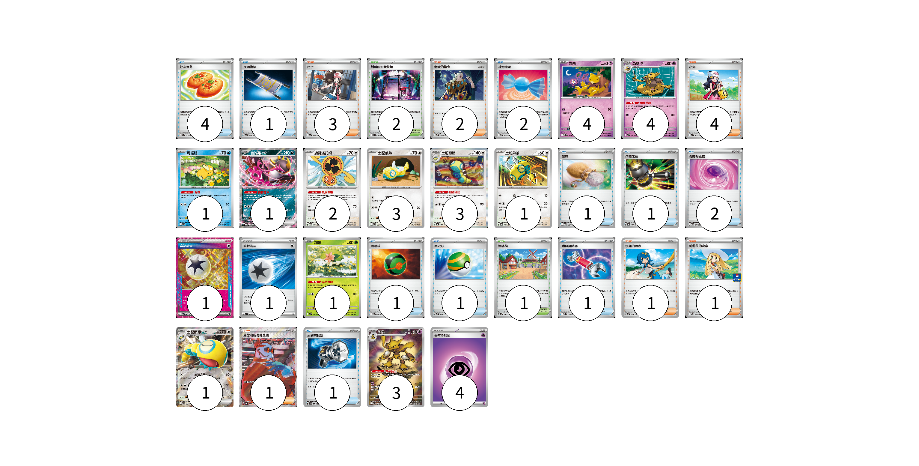 牌組構築方案 以此牌組為基礎新構築牌組 顯示卡面 顯示列表 寶可夢卡(24) 4 4 1 1 2 3 3 1 1 1 3 物品卡(15) 4 1 2 1 1 2 1 1 1 1 支援者卡(12) 3 2 4 1 1 1 競技場卡(3) 2 1 能量卡(6) 1 1 4 寶可夢卡(24) 卡牌名稱 張數 卡牌名稱 張數 凱西 M1S 036/063 04 勇基拉 M1S 037/063 04 可達鴨 M2a 032/193 01 吉雉雞ex M2a 114/193 01 旋轉洛托姆 M2a 139/193 02 土龍弟弟 SV9 078/100 03 土龍節節 SV8a 130/187 03 土龍弟弟 SV8a 129/187 01 謝米 SV9a 006/063 01 土龍節節ex SV9 079/100 01 胡地 M1S 071/063 03 物品卡(15) 卡牌名稱 張數 卡牌名稱 張數 好友寶芬 M2a 153/193 04 夜間擔架 M2a 159/193 01 神奇糖果 MBG 013/022 02 聖灰 SV9a 056/063 01 改造之錘 SV8a 138/187 01 奇跡修正檔 MBD 017/022 02 黑暗球 SV7a 054/064 01 巢穴球 SV1S 070/078 01 道具拆除器 M2a 151/193 01 反擊捕捉器 SV4M 059/066 01 支援者卡(12) 卡牌名稱 張數 卡牌名稱 張數 鬥子 M2a 172/193 03 老大的指令 MBD 020/022 02 小光 M2 077/080 04 水蓮的照顧 SV8a 168/187 01 莉莉艾的決意 M-P 018/M-P 01 庫瑟洛斯奇的企圖 SV6a 086/064 01 競技場卡(3) 卡牌名稱 張數 卡牌名稱 張數 對戰圓形競技場 M2 079/080 02 深缽鎮 SV4a 185/190 01 能量卡(6) 卡牌名稱 張數 卡牌名稱 張數 富裕能量 SV7a 064/064 01 噴射能量 SV1a 072/073 01 基本【超】能量 SVHM PSY 04 以此牌組為基礎新構築牌組 牌組編碼 OwsBhn-OIEvpy-pFspyg copy 列印牌組單 牌組編碼已複製 分享至SNS