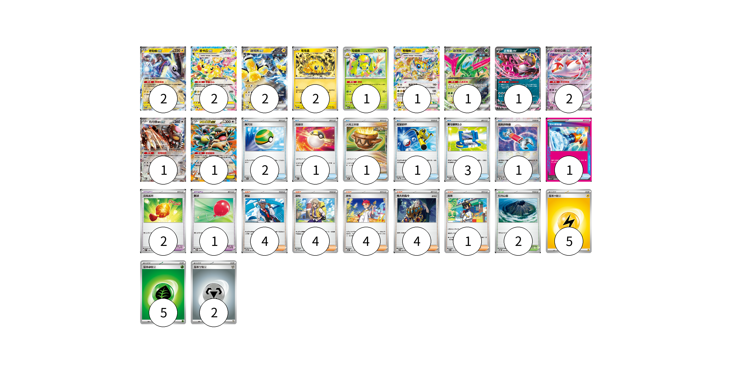牌組構築方案 以此牌組為基礎新構築牌組 顯示卡面 顯示列表 寶可夢卡(16) 2 2 2 2 1 1 1 1 2 1 1 寶可夢道具(2) 2 物品卡(11) 2 1 1 1 3 1 1 1 支援者卡(17) 4 4 4 4 1 競技場卡(2) 2 能量卡(12) 5 5 2 寶可夢卡(16) 卡牌名稱 張數 卡牌名稱 張數 密勒頓ex SVTR 008/021 02 皮卡丘ex SV8 033/106 02 鐵臂膀ex SV8a 054/187 02 電電蟲 SV7 032/102 02 電蜘蛛 SV6a 002/064 01 電蜘蛛ex SV7 033/102 01 鐵斑葉ex SV8a 016/187 01 吉雉雞ex SVOD 004/020 01 拉帝亞斯ex SV7a 019/064 02 月月熊 赫月ex SV8a 134/187 01 超級袋獸ex M1S 051/063 01 寶可夢道具(2) 卡牌名稱 張數 卡牌名稱 張數 勇氣護符 SVM 142/175 02 物品卡(11) 卡牌名稱 張數 卡牌名稱 張數 巢穴球 SVK 016/042 02 高級球 SVK 018/042 01 大地之容器 SV8a 143/187 01 厲害釣竿 SVOD 010/020 01 寶可裝置3.0 SV11B 081/086 03 道具拆除器 SV11W 080/086 01 頂尖捕捉器 MBG 014/022 01 氣球 MBD 018/022 01 支援者卡(17) 卡牌名稱 張數 卡牌名稱 張數 席藍 SV8 102/106 04 派帕 SVOD 018/020 04 赤松 SV8a 163/187 04 老大的指令 MBD 020/022 04 烏栗 SV8a 169/187 01 競技場卡(2) 卡牌名稱 張數 卡牌名稱 張數 引力山岳 SV8 106/106 02 能量卡(12) 卡牌名稱 張數 卡牌名稱 張數 基本【雷】能量 SVTR LIG 05 基本【草】能量 SVTM GRA 05 基本【鋼】能量 SVTH MET 02 以此牌組為基礎新構築牌組 牌組編碼 OxXvSh-HPAFaz-rQgfaH copy 列印牌組單 牌組編碼已複製 分享至SNS