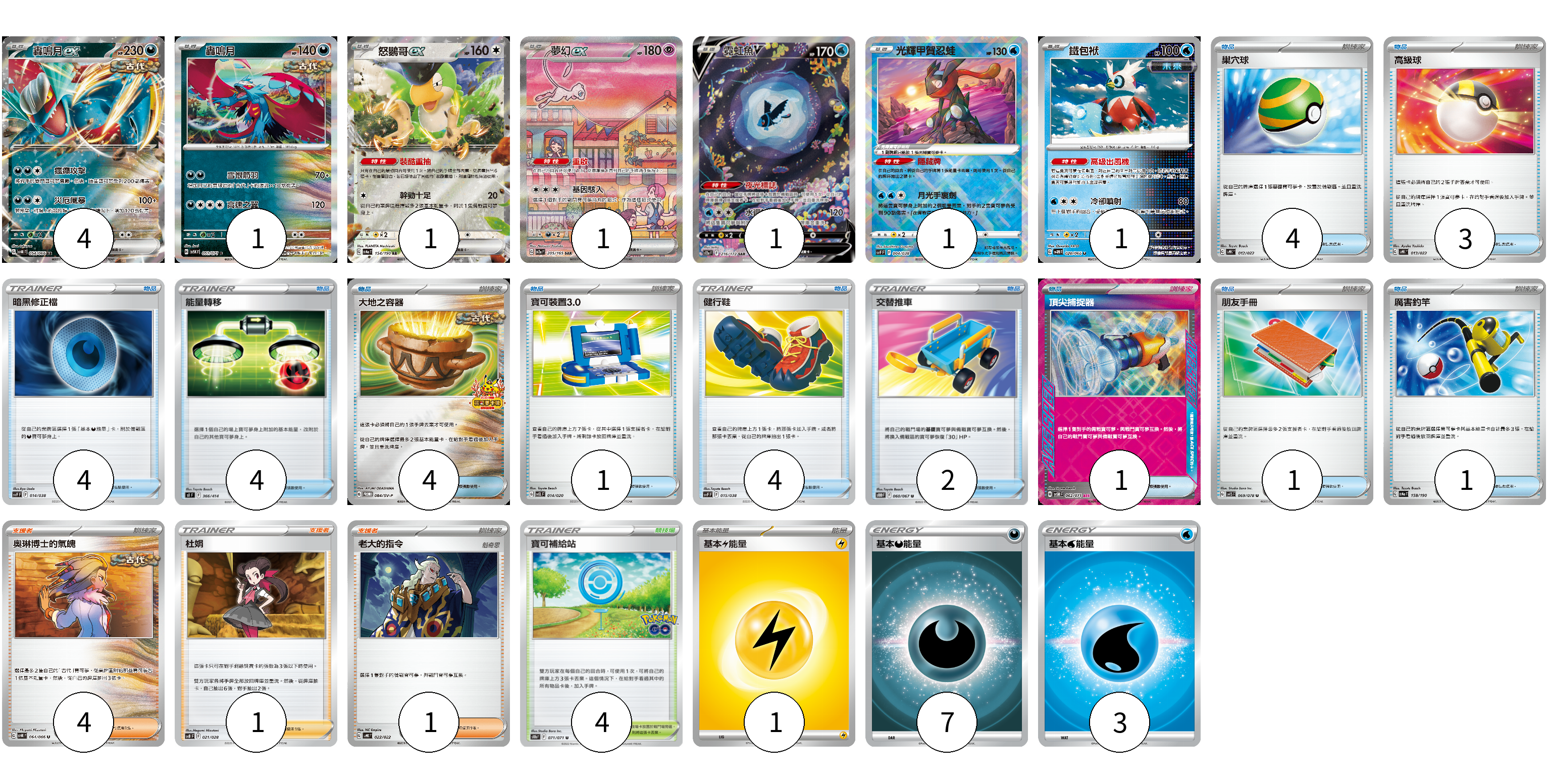 牌組構築方案 以此牌組為基礎新構築牌組 顯示卡面 顯示列表 寶可夢卡(10) 4 1 1 1 1 1 1 物品卡(29) 4 3 4 4 4 1 4 2 1 1 1 支援者卡(6) 4 1 1 競技場卡(4) 4 能量卡(11) 1 7 3 寶可夢卡(10) 卡牌名稱 張數 卡牌名稱 張數 轟鳴月ex SV4K 054/066 04 轟鳴月 SV5K 051/071 01 怒鸚哥ex SV4a 154/190 01 夢幻ex SV2a 205/165 01 霓虹魚V S12a 216/172 01 光輝甲賀忍蛙 SVF 004/038 01 鐵包袱 SV4M 020/066 01 物品卡(29) 卡牌名稱 張數 卡牌名稱 張數 巢穴球 SVHK 012/022 04 高級球 SVHK 013/022 03 暗黑修正檔 SVF 014/038 04 能量轉移 SI 366/414 04 大地之容器 SV-P 084/SV-P 04 寶可裝置3.0 SVEL 014/020 01 健行鞋 SVF 015/038 04 交替推車 S10D 060/067 02 頂尖捕捉器 SV5M 062/071 01 朋友手冊 SV1S 069/078 01 厲害釣竿 SV4a 158/190 01 支援者卡(6) 卡牌名稱 張數 卡牌名稱 張數 奧琳博士的氣魄 SV4K 064/066 04 杜娟 SVB 021/028 01 老大的指令 SVHK 022/022 01 競技場卡(4) 卡牌名稱 張數 卡牌名稱 張數 寶可補給站 S10b 071/071 04 能量卡(11) 卡牌名稱 張數 卡牌名稱 張數 基本【雷】能量 SVHM LIG 01 基本【惡】能量 SI DAR 07 基本【水】能量 SI WAT 03 以此牌組為基礎新構築牌組 牌組編碼 OxoObS-YmRiIZ-sYGMLe copy 列印牌組單 牌組編碼已複製 分享至SNS