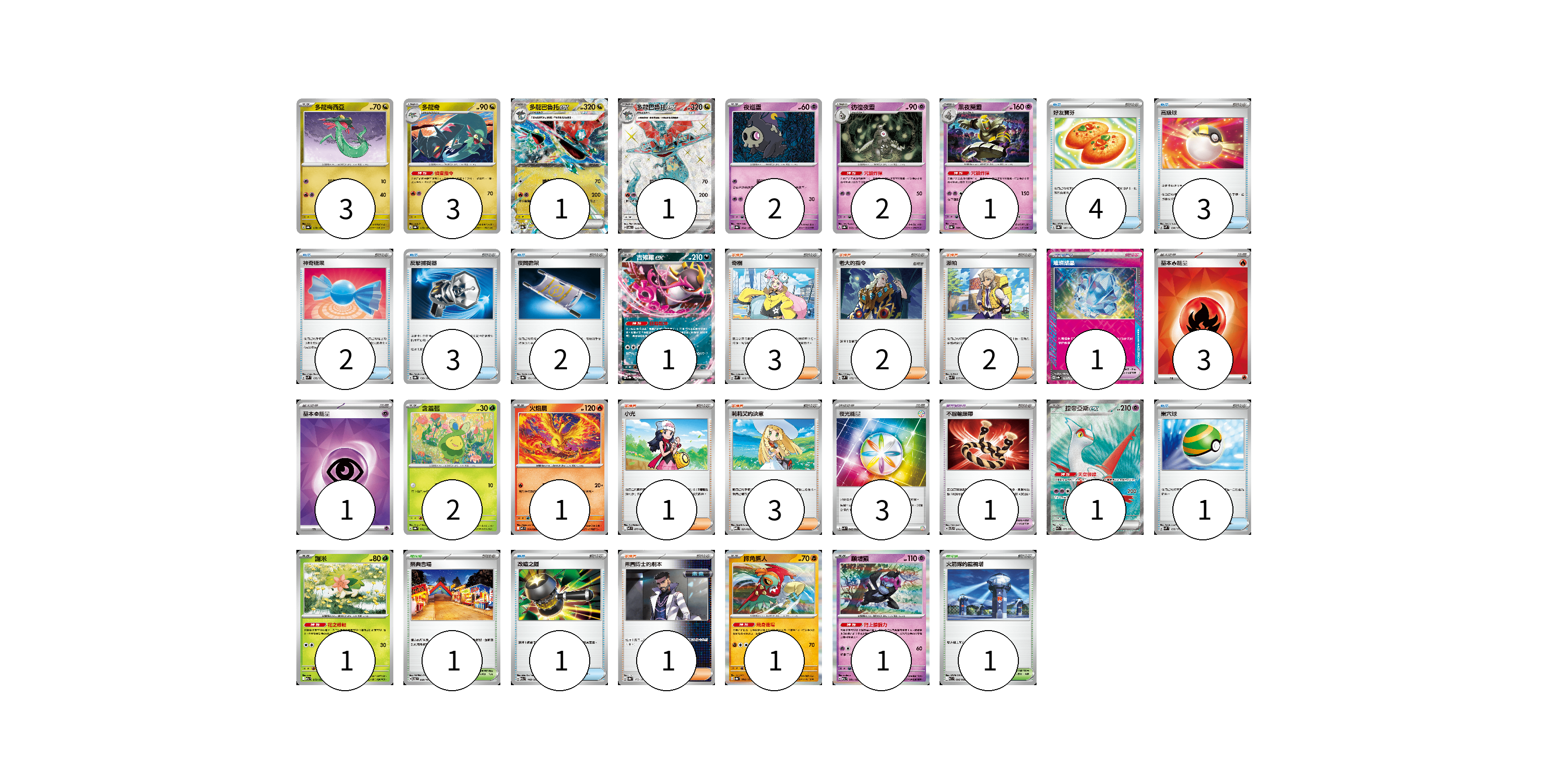 牌組構築方案 以此牌組為基礎新構築牌組 顯示卡面 顯示列表 寶可夢卡(21) 3 3 1 1 2 2 1 1 2 1 1 1 1 1 寶可夢道具(2) 1 1 物品卡(16) 4 3 2 3 2 1 1 支援者卡(12) 3 2 2 1 3 1 競技場卡(2) 1 1 能量卡(7) 3 1 3 寶可夢卡(21) 卡牌名稱 張數 卡牌名稱 張數 多龍梅西亞 SV8a 118/187 03 多龍奇 SV8a 119/187 03 多龍巴魯托ex SV8a 120/187 01 多龍巴魯托ex SV6 120/101 01 夜巡靈 SV8a 064/187 02 彷徨夜靈 SV8a 065/187 02 黑夜魔靈 SV8a 066/187 01 吉雉雞ex SV8a 104/187 01 含羞苞 SV8a 001/187 02 火焰鳥 M2 014/080 01 拉帝亞斯ex SV7a 078/064 01 謝米 M2a 012/193 01 摔角鷹人 SV8a 084/187 01 願增猿 M2a 081/193 01 寶可夢道具(2) 卡牌名稱 張數 卡牌名稱 張數 璀璨結晶 SV8a 152/187 01 不服輸頭帶 SVTL 016/021 01 物品卡(16) 卡牌名稱 張數 卡牌名稱 張數 好友寶芬 SV8a 147/187 04 高級球 SVM 134/175 03 神奇糖果 SVM 135/175 02 反擊捕捉器 SV8a 139/187 03 夜間擔架 SV8a 151/187 02 巢穴球 SVM 133/175 01 改造之錘 M2a 148/193 01 支援者卡(12) 卡牌名稱 張數 卡牌名稱 張數 奇樹 SVM 160/175 03 老大的指令 SVM 172/175 02 派帕 SVK 035/042 02 小光 M2 077/080 01 莉莉艾的決意 MBD 021/022 03 弗圖博士的劇本 SV8a 175/187 01 競技場卡(2) 卡牌名稱 張數 卡牌名稱 張數 祭典會場 SV6 099/101 01 火箭隊的監視塔 SV10 096/098 01 能量卡(7) 卡牌名稱 張數 卡牌名稱 張數 基本【火】能量 SVK FIR 03 基本【超】能量 SVK PSY 01 夜光能量 SVK 042/042 03 以此牌組為基礎新構築牌組 牌組編碼 PAxiwW-DlaocU-BfNlmg copy 列印牌組單 牌組編碼已複製 分享至SNS