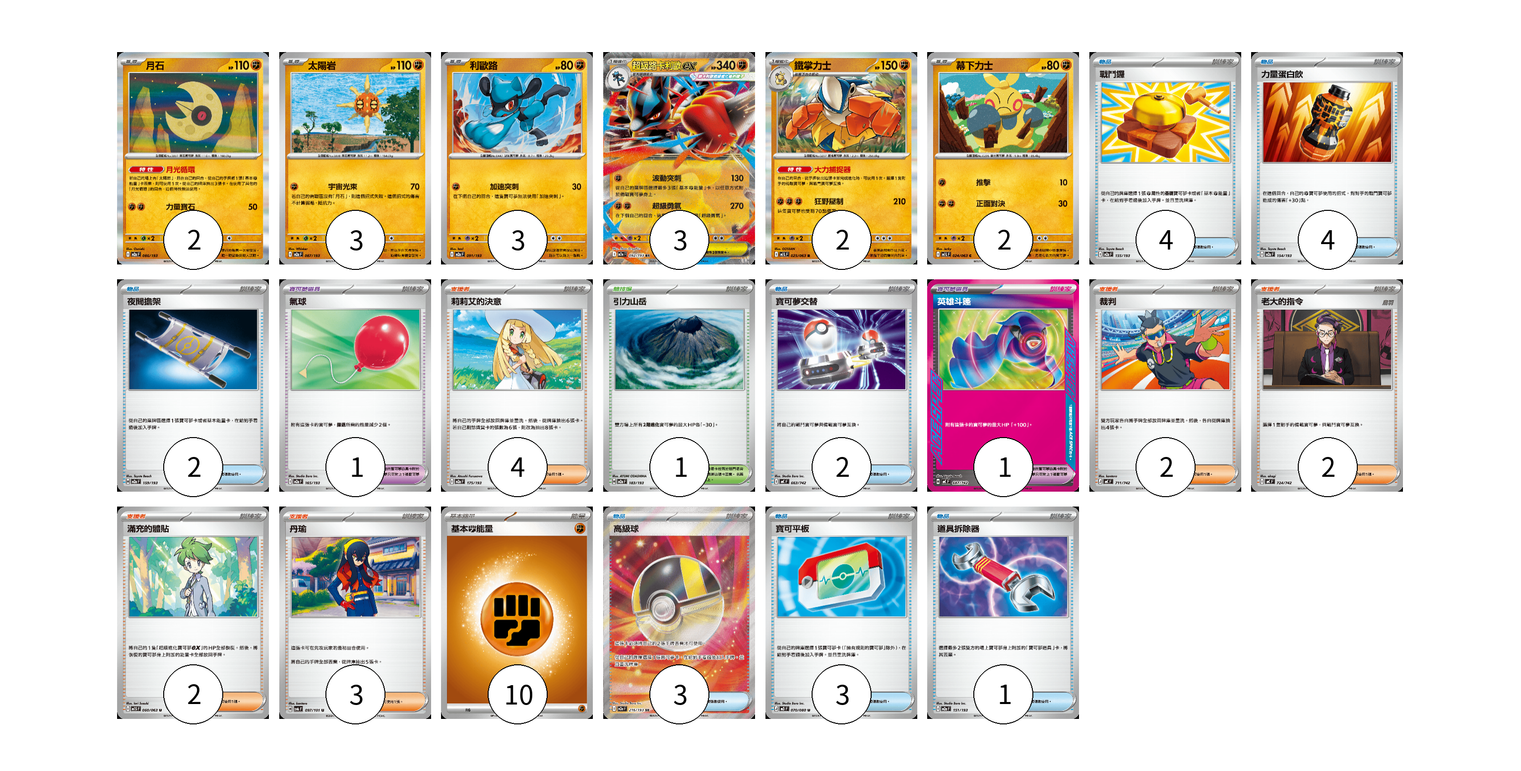 牌組構築方案 以此牌組為基礎新構築牌組 顯示卡面 顯示列表 寶可夢卡(15) 2 3 3 3 2 2 寶可夢道具(2) 1 1 物品卡(19) 4 4 2 2 3 3 1 支援者卡(13) 4 2 2 2 3 競技場卡(1) 1 能量卡(10) 10 寶可夢卡(15) 卡牌名稱 張數 卡牌名稱 張數 月石 M2a 086/193 02 太陽岩 M2a 087/193 03 利歐路 M2a 091/193 03 超級路卡利歐ex M2a 092/193 03 鐵掌力士 M1L 025/063 02 幕下力士 M1L 024/063 02 寶可夢道具(2) 卡牌名稱 張數 卡牌名稱 張數 氣球 M2a 165/193 01 英雄斗篷 MC 687/742 01 物品卡(19) 卡牌名稱 張數 卡牌名稱 張數 戰鬥鑼 M2a 155/193 04 力量蛋白飲 M2a 154/193 04 夜間擔架 M2a 159/193 02 寶可夢交替 MC 663/742 02 高級球 M2a 216/193 03 寶可平板 M3 070/080 03 道具拆除器 M2a 151/193 01 支援者卡(13) 卡牌名稱 張數 卡牌名稱 張數 莉莉艾的決意 M2a 175/193 04 裁判 MC 711/742 02 老大的指令 MC 724/742 02 滿充的體貼 M1S 060/063 02 丹瑜 SV6 097/101 03 競技場卡(1) 卡牌名稱 張數 卡牌名稱 張數 引力山岳 M2a 183/193 01 能量卡(10) 卡牌名稱 張數 卡牌名稱 張數 基本【鬥】能量 MC FIG 10 以此牌組為基礎新構築牌組 牌組編碼 PBnzJl-bjvzEU-SbANQg copy 列印牌組單 牌組編碼已複製 分享至SNS