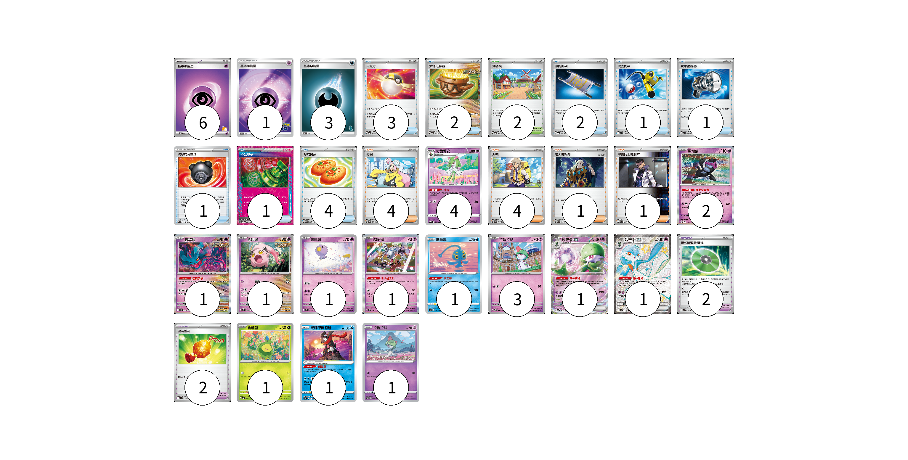 牌組構築方案 以此牌組為基礎新構築牌組 顯示卡面 顯示列表 寶可夢卡(19) 4 2 1 1 1 1 1 3 1 1 1 1 1 寶可夢道具(4) 2 2 物品卡(15) 3 2 2 1 1 1 1 4 支援者卡(10) 4 4 1 1 競技場卡(2) 2 能量卡(10) 6 1 3 寶可夢卡(19) 卡牌名稱 張數 卡牌名稱 張數 奇魯莉安 SVTS 003/022 04 願增猿 SV6 055/101 02 振翼髮 SV5K 033/071 01 吼叫尾 SVTS 007/022 01 飄飄球 SVTS 005/022 01 鑰圈兒 SV4a 087/190 01 瑪納霏 S9 031/100 01 拉魯拉絲 SVTS 002/022 03 沙奈朵ex SV4a 082/190 01 沙奈朵ex SV4a 328/190 01 含羞苞 SV8a 001/187 01 光輝甲賀忍蛙 SVTG 002/019 01 拉魯拉絲 S9a 032/067 01 寶可夢道具(4) 卡牌名稱 張數 卡牌名稱 張數 招式學習器 演進 SVK 025/042 02 勇氣護符 SVK 024/042 02 物品卡(15) 卡牌名稱 張數 卡牌名稱 張數 高級球 SVK 018/042 03 大地之容器 SVK 012/042 02 夜間擔架 SV6a 056/064 02 厲害釣竿 SVK 011/042 01 反擊捕捉器 SVK 009/042 01 洗翠的沉重球 SVF 019/038 01 不公印章 SV5a 053/066 01 好友寶芬 SVK 015/042 04 支援者卡(10) 卡牌名稱 張數 卡牌名稱 張數 奇樹 SVK 031/042 04 派帕 SVK 035/042 04 老大的指令 SVK 036/042 01 弗圖博士的劇本 SVK 034/042 01 競技場卡(2) 卡牌名稱 張數 卡牌名稱 張數 深缽鎮 SVK 039/042 02 能量卡(10) 卡牌名稱 張數 卡牌名稱 張數 基本【超】能量 SVI PSY 06 基本超能量 S10b PSY 01 基本惡能量 SH DAR 03 以此牌組為基礎新構築牌組 牌組編碼 PEbcXp-QzgUfz-dPtpyX copy 列印牌組單 牌組編碼已複製 分享至SNS