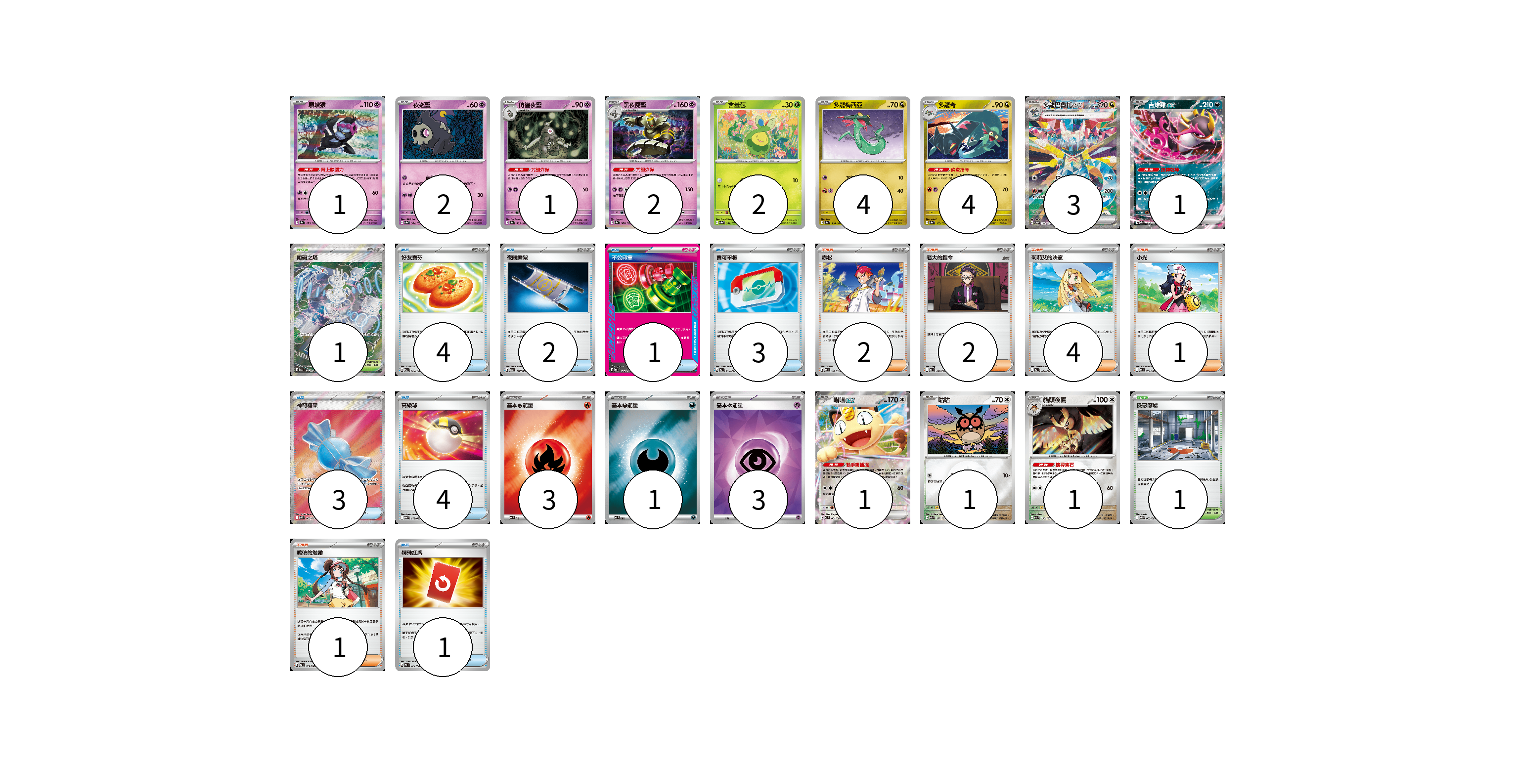 牌組構築方案 以此牌組為基礎新構築牌組 顯示卡面 顯示列表 寶可夢卡(23) 1 2 1 2 2 4 4 3 1 1 1 1 物品卡(18) 4 2 1 3 3 4 1 支援者卡(10) 2 2 4 1 1 競技場卡(2) 1 1 能量卡(7) 3 1 3 寶可夢卡(23) 卡牌名稱 張數 卡牌名稱 張數 願增猿 SV8a 075/187 01 夜巡靈 SV8a 064/187 02 彷徨夜靈 SV8a 065/187 01 黑夜魔靈 SV8a 066/187 02 含羞苞 SV8a 001/187 02 多龍梅西亞 SV8a 118/187 04 多龍奇 SV8a 119/187 04 多龍巴魯托ex SV8a 221/187 03 吉雉雞ex M2a 114/193 01 喵喵ex M3 061/080 01 咕咕 M2a 137/193 01 貓頭夜鷹 M2a 138/193 01 物品卡(18) 卡牌名稱 張數 卡牌名稱 張數 好友寶芬 M2a 153/193 04 夜間擔架 M2a 159/193 02 不公印章 MC 633/742 01 寶可平板 MC 662/742 03 神奇糖果 M1S 082/063 03 高級球 MBG 012/022 04 特殊紅牌 M4 072/083 01 支援者卡(10) 卡牌名稱 張數 卡牌名稱 張數 赤松 MC 696/742 02 老大的指令 MC 724/742 02 莉莉艾的決意 MC 729/742 04 小光 M2 077/080 01 鳴依的勉勵 M3 075/080 01 競技場卡(2) 卡牌名稱 張數 卡牌名稱 張數 阻礙之塔 M2a 222/193 01 險惡廢墟 M1L 063/063 01 能量卡(7) 卡牌名稱 張數 卡牌名稱 張數 基本【火】能量 MC FIR 03 基本【惡】能量 MC DAR 01 基本【超】能量 SVOD PSY 03 以此牌組為基礎新構築牌組 牌組編碼 PEpjRm-CVWPFc-HKzxsU copy 列印牌組單 牌組編碼已複製 分享至SNS