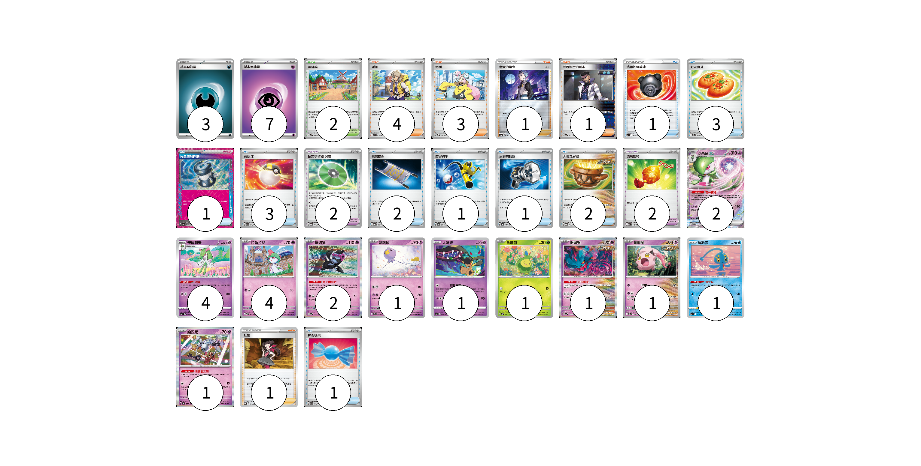 牌組構築方案 以此牌組為基礎新構築牌組 顯示卡面 顯示列表 寶可夢卡(19) 2 4 4 2 1 1 1 1 1 1 1 寶可夢道具(4) 2 2 物品卡(15) 1 3 1 3 2 1 1 2 1 支援者卡(10) 4 3 1 1 1 競技場卡(2) 2 能量卡(10) 3 7 寶可夢卡(19) 卡牌名稱 張數 卡牌名稱 張數 沙奈朵ex SVTS 004/022 02 奇魯莉安 SVTS 003/022 04 拉魯拉絲 SVTS 002/022 04 願增猿 SV8a 075/187 02 飄飄球 SVTS 005/022 01 大嘴娃 S10D 024/067 01 含羞苞 SV8a 001/187 01 振翼髮 SV8a 072/187 01 吼叫尾 SV8a 071/187 01 瑪納霏 SVF 003/038 01 鑰圈兒 SV4a 087/190 01 寶可夢道具(4) 卡牌名稱 張數 卡牌名稱 張數 招式學習器 演進 SV8a 160/187 02 勇氣護符 SVM 142/175 02 物品卡(15) 卡牌名稱 張數 卡牌名稱 張數 洗翠的沉重球 SVF 019/038 01 好友寶芬 SV8a 147/187 03 完全體攪拌器 SVK 017/042 01 高級球 SVM 134/175 03 夜間擔架 SV8a 151/187 02 厲害釣竿 SVK 011/042 01 反擊捕捉器 SV8a 139/187 01 大地之容器 SV8a 143/187 02 神奇糖果 SVM 135/175 01 支援者卡(10) 卡牌名稱 張數 卡牌名稱 張數 派帕 SVK 035/042 04 奇樹 SVK 031/042 03 老大的指令(赤日) SO 028/030 01 弗圖博士的劇本 SV8a 175/187 01 杜娟 SVB 021/028 01 競技場卡(2) 卡牌名稱 張數 卡牌名稱 張數 深缽鎮 SVK 039/042 02 能量卡(10) 卡牌名稱 張數 卡牌名稱 張數 基本【惡】能量 SVF DAR 03 基本【超】能量 SVEM PSY 07 以此牌組為基礎新構築牌組 牌組編碼 PFFDog-ZFZVRT-QiJANT copy 列印牌組單 牌組編碼已複製 分享至SNS