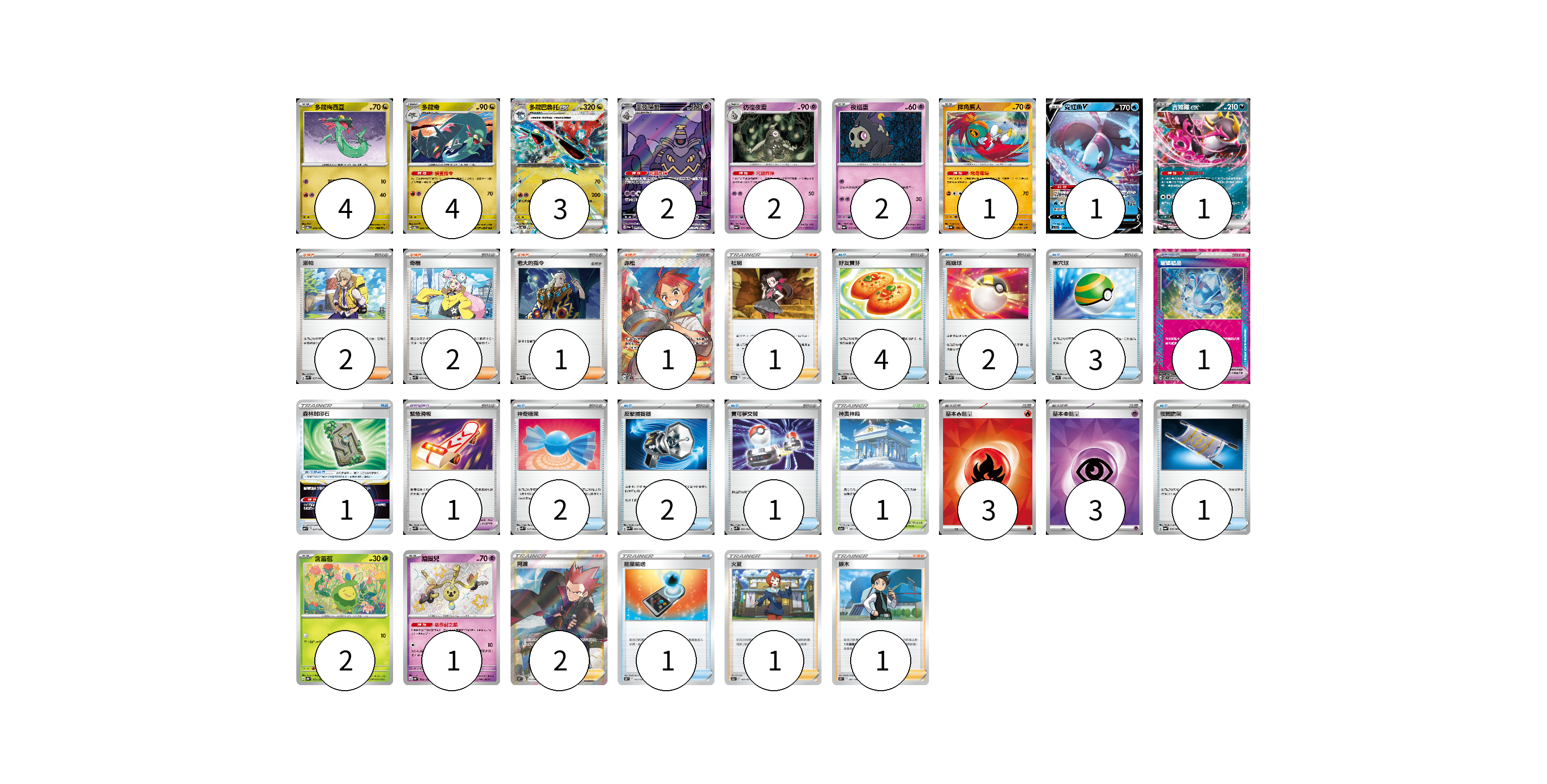 牌組構築方案 以此牌組為基礎新構築牌組 顯示卡面 顯示列表 寶可夢卡(23) 4 4 3 2 2 2 1 1 1 2 1 寶可夢道具(2) 1 1 物品卡(17) 4 2 3 1 2 2 1 1 1 支援者卡(11) 2 2 1 1 1 2 1 1 競技場卡(1) 1 能量卡(6) 3 3 寶可夢卡(23) 卡牌名稱 張數 卡牌名稱 張數 多龍梅西亞 SV6 079/101 04 多龍奇 SV6 080/101 04 多龍巴魯托ex SV6 081/101 03 黑夜魔靈 SV6a 070/064 02 彷徨夜靈 SV6a 019/064 02 夜巡靈 SV6a 018/064 02 摔角鷹人 SV4a 106/190 01 霓虹魚V SVHK 004/022 01 吉雉雞ex SV6a 038/064 01 含羞苞 SV8a 001/187 02 鑰圈兒 SV4a 264/190 01 寶可夢道具(2) 卡牌名稱 張數 卡牌名稱 張數 璀璨結晶 SV7 094/102 01 緊急滑板 SVK 023/042 01 物品卡(17) 卡牌名稱 張數 卡牌名稱 張數 好友寶芬 SVK 015/042 04 高級球 SVK 018/042 02 巢穴球 SV1S 070/078 03 森林封印石 SVF 024/038 01 神奇糖果 SVK 019/042 02 反擊捕捉器 SVK 009/042 02 寶可夢交替 SVK 022/042 01 夜間擔架 SV6a 056/064 01 能量輸送 SN 013/024 01 支援者卡(11) 卡牌名稱 張數 卡牌名稱 張數 派帕 SVK 035/042 02 奇樹 SVK 031/042 02 老大的指令 SVK 036/042 01 赤松 SV7 123/102 01 杜娟 S12a 157/172 01 阿渡 S12 114/098 02 火夏 S10a 069/071 01 捩木 S11 097/100 01 競技場卡(1) 卡牌名稱 張數 卡牌名稱 張數 神奧神殿 S12a 169/172 01 能量卡(6) 卡牌名稱 張數 卡牌名稱 張數 基本【火】能量 SVK FIR 03 基本【超】能量 SVK PSY 03 以此牌組為基礎新構築牌組 牌組編碼 PLRSdi-tswpBA-HrklbL copy 列印牌組單 牌組編碼已複製 分享至SNS
