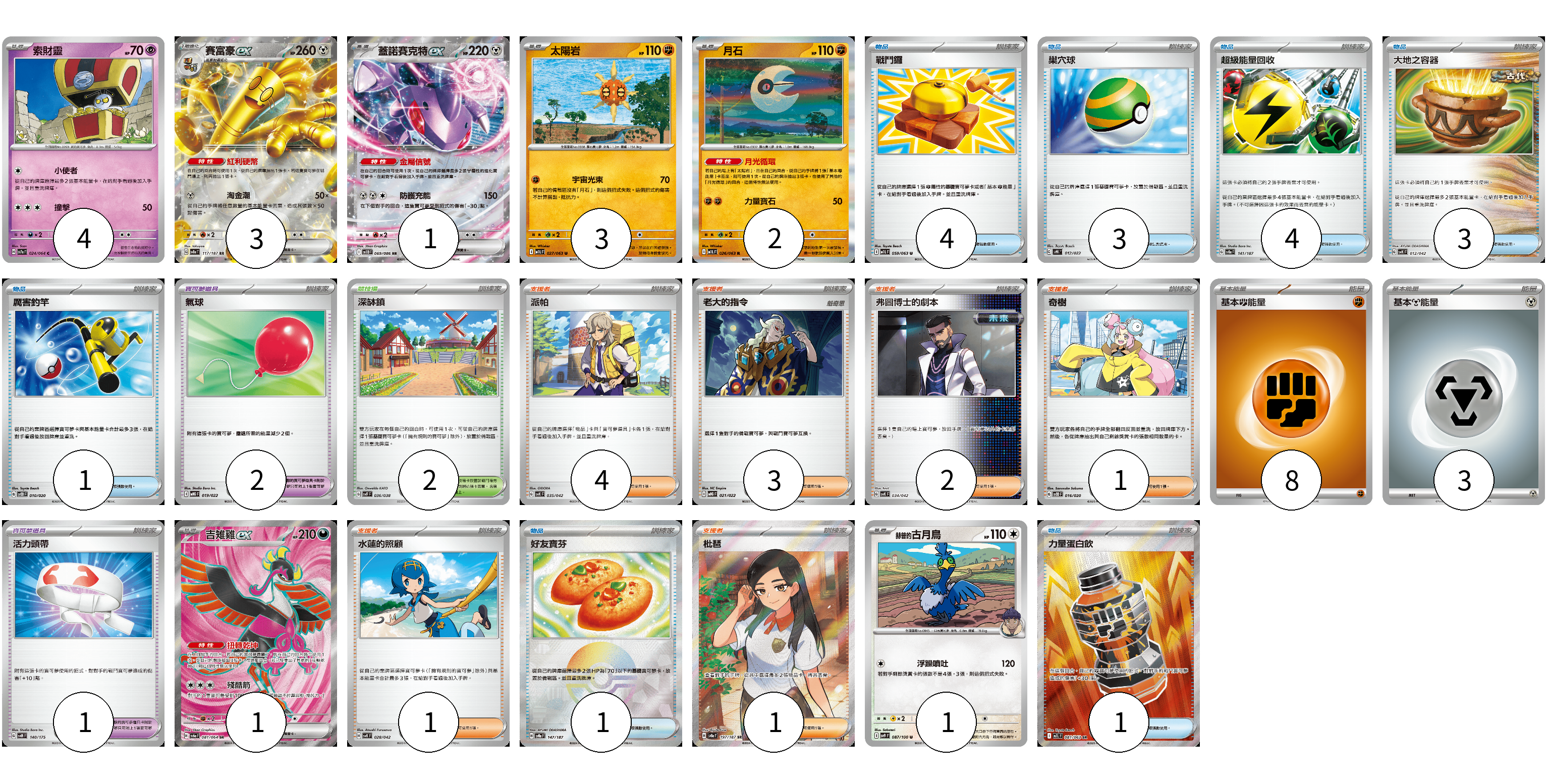 牌組構築方案 以此牌組為基礎新構築牌組 顯示卡面 顯示列表 寶可夢卡(15) 4 3 1 3 2 1 1 寶可夢道具(3) 2 1 物品卡(17) 4 3 4 3 1 1 1 支援者卡(12) 4 3 2 1 1 1 競技場卡(2) 2 能量卡(11) 8 3 寶可夢卡(15) 卡牌名稱 張數 卡牌名稱 張數 索財靈 SV7a 024/064 04 賽富豪ex SV8a 117/187 03 蓋諾賽克特ex SV11B 069/086 01 太陽岩 M1L 027/063 03 月石 M1L 026/063 02 吉雉雞ex SV6a 081/064 01 赫普的古月鳥 SV9 087/100 01 寶可夢道具(3) 卡牌名稱 張數 卡牌名稱 張數 氣球 MBG 019/022 02 活力頭帶 SVM 140/175 01 物品卡(17) 卡牌名稱 張數 卡牌名稱 張數 戰鬥鑼 M1L 059/063 04 巢穴球 SVHK 012/022 03 超級能量回收 SV8a 141/187 04 大地之容器 SVK 012/042 03 厲害釣竿 SVOD 010/020 01 好友寶芬 SV8a 147/187 01 力量蛋白飲 M1L 081/063 01 支援者卡(12) 卡牌名稱 張數 卡牌名稱 張數 派帕 SVK 035/042 04 老大的指令 MBG 021/022 03 弗圖博士的劇本 SVK 034/042 02 奇樹 SVOD 016/020 01 水蓮的照顧 SVK 028/042 01 枇琶 SV8a 197/187 01 競技場卡(2) 卡牌名稱 張數 卡牌名稱 張數 深缽鎮 SVF 036/038 02 能量卡(11) 卡牌名稱 張數 卡牌名稱 張數 基本【鬥】能量 SVTG FIG 08 基本【鋼】能量 SVTH MET 03 以此牌組為基礎新構築牌組 牌組編碼 PLWslr-Gqutbg-xkvoIY copy 列印牌組單 牌組編碼已複製 分享至SNS