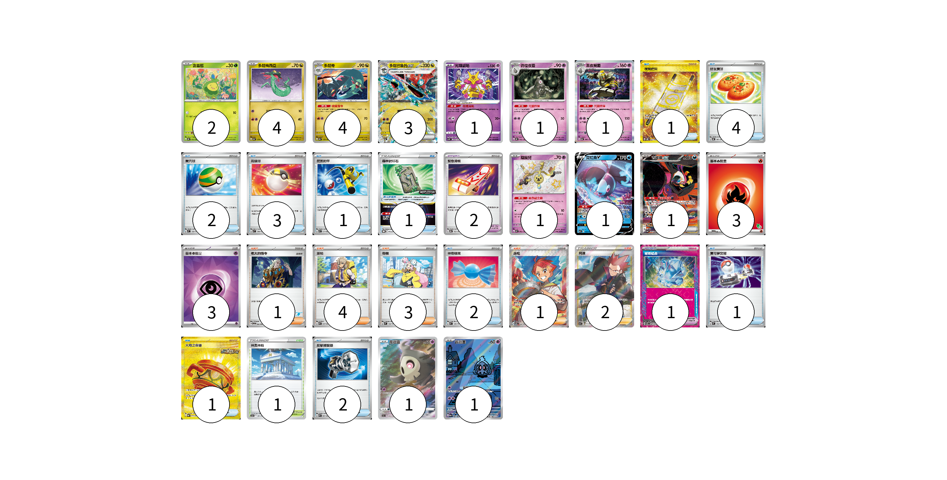 牌組構築方案 以此牌組為基礎新構築牌組 顯示卡面 顯示列表 寶可夢卡(21) 2 4 4 3 1 1 1 1 1 1 1 1 寶可夢道具(4) 1 2 1 物品卡(17) 1 4 2 3 1 2 1 1 2 支援者卡(11) 1 4 3 1 2 競技場卡(1) 1 能量卡(6) 3 3 寶可夢卡(21) 卡牌名稱 張數 卡牌名稱 張數 含羞苞 SV8a 001/187 02 多龍梅西亞 SV8a 118/187 04 多龍奇 SV8a 119/187 04 多龍巴魯托ex SV8a 120/187 03 光輝胡地 SVTM 006/022 01 彷徨夜靈 SV8a 065/187 01 黑夜魔靈 SV8a 066/187 01 鑰圈兒 SV4a 264/190 01 霓虹魚V SVF 002/038 01 吉雉雞ex SV6a 089/064 01 夜巡靈 S12a 203/172 01 夜巡靈 SV6a 068/064 01 寶可夢道具(4) 卡牌名稱 張數 卡牌名稱 張數 森林封印石 SV-P 141/SV-P 01 緊急滑板 SV8a 153/187 02 璀璨結晶 SV7 094/102 01 物品卡(17) 卡牌名稱 張數 卡牌名稱 張數 夜間擔架 SV8 137/106 01 好友寶芬 SV8a 147/187 04 巢穴球 SVM 133/175 02 高級球 SVM 134/175 03 厲害釣竿 SVK 011/042 01 神奇糖果 SVM 135/175 02 寶可夢交替 SVM 136/175 01 大地之容器 SV6a 093/064 01 反擊捕捉器 SVK 009/042 02 支援者卡(11) 卡牌名稱 張數 卡牌名稱 張數 老大的指令 SVI 066/066 01 派帕 SVK 035/042 04 奇樹 SVM 160/175 03 赤松 SV7 123/102 01 阿渡 S12 114/098 02 競技場卡(1) 卡牌名稱 張數 卡牌名稱 張數 神奧神殿 S12a 169/172 01 能量卡(6) 卡牌名稱 張數 卡牌名稱 張數 基本【火】能量 SVI FIR 03 基本【超】能量 SVK PSY 03 以此牌組為基礎新構築牌組 牌組編碼 PNjESN-NAMVSn-mezKlz copy 列印牌組單 牌組編碼已複製 分享至SNS