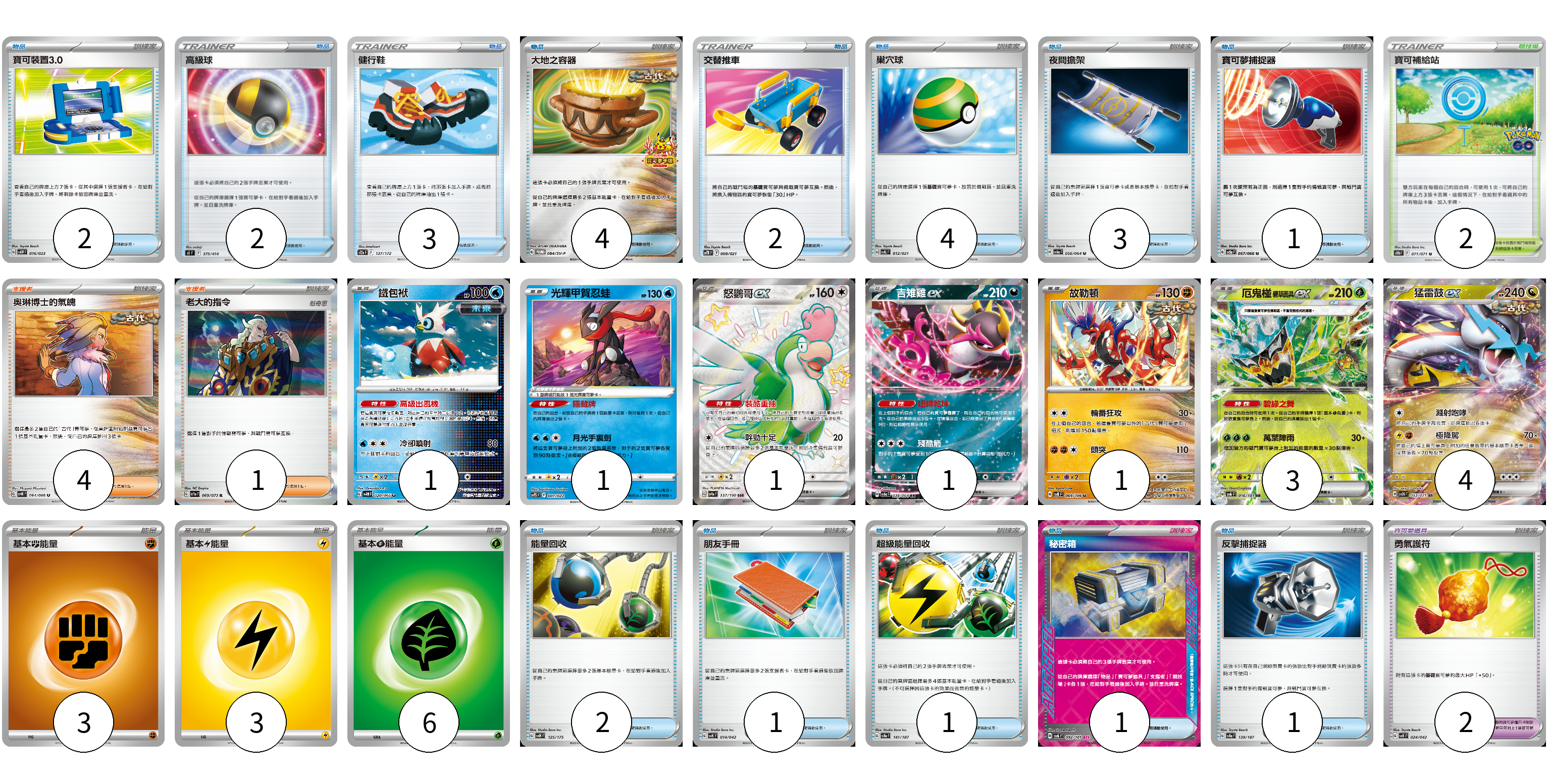 牌組構築方案 以此牌組為基礎新構築牌組 顯示卡面 顯示列表 寶可夢卡(12) 1 1 1 1 1 3 4 寶可夢道具(2) 2 物品卡(27) 2 2 3 4 2 4 3 1 2 1 1 1 1 支援者卡(5) 4 1 競技場卡(2) 2 能量卡(12) 3 3 6 寶可夢卡(12) 卡牌名稱 張數 卡牌名稱 張數 鐵包袱 SV4M 020/066 01 光輝甲賀忍蛙 SVTS 001/022 01 怒鸚哥ex SV4a 337/190 01 吉雉雞ex SV6a 038/064 01 故勒頓 SV8 069/106 01 厄鬼椪 碧草面具ex SV6 016/101 03 猛雷鼓ex SV5K 053/071 04 寶可夢道具(2) 卡牌名稱 張數 卡牌名稱 張數 勇氣護符 SVK 024/042 02 物品卡(27) 卡牌名稱 張數 卡牌名稱 張數 寶可裝置3.0 SVAW 016/023 02 高級球 SI 375/414 02 健行鞋 S12a 137/172 03 大地之容器 SV-P 084/SV-P 04 交替推車 SVTR 009/021 02 巢穴球 SVAL 012/021 04 夜間擔架 SV6a 056/064 03 寶可夢捕捉器 SV5a 057/066 01 能量回收 SVM 125/175 02 朋友手冊 SVK 014/042 01 超級能量回收 SV8a 141/187 01 秘密箱 SV6 092/101 01 反擊捕捉器 SV8a 139/187 01 支援者卡(5) 卡牌名稱 張數 卡牌名稱 張數 奧琳博士的氣魄 SV4K 064/066 04 老大的指令 SV1a 069/073 01 競技場卡(2) 卡牌名稱 張數 卡牌名稱 張數 寶可補給站 S10b 071/071 02 能量卡(12) 卡牌名稱 張數 卡牌名稱 張數 基本【鬥】能量 SVHK FIG 03 基本【雷】能量 SVHM LIG 03 基本【草】能量 SVF GRA 06 以此牌組為基礎新構築牌組 牌組編碼 PQSbDX-VPGzba-bNQWGj copy 列印牌組單 牌組編碼已複製 分享至SNS