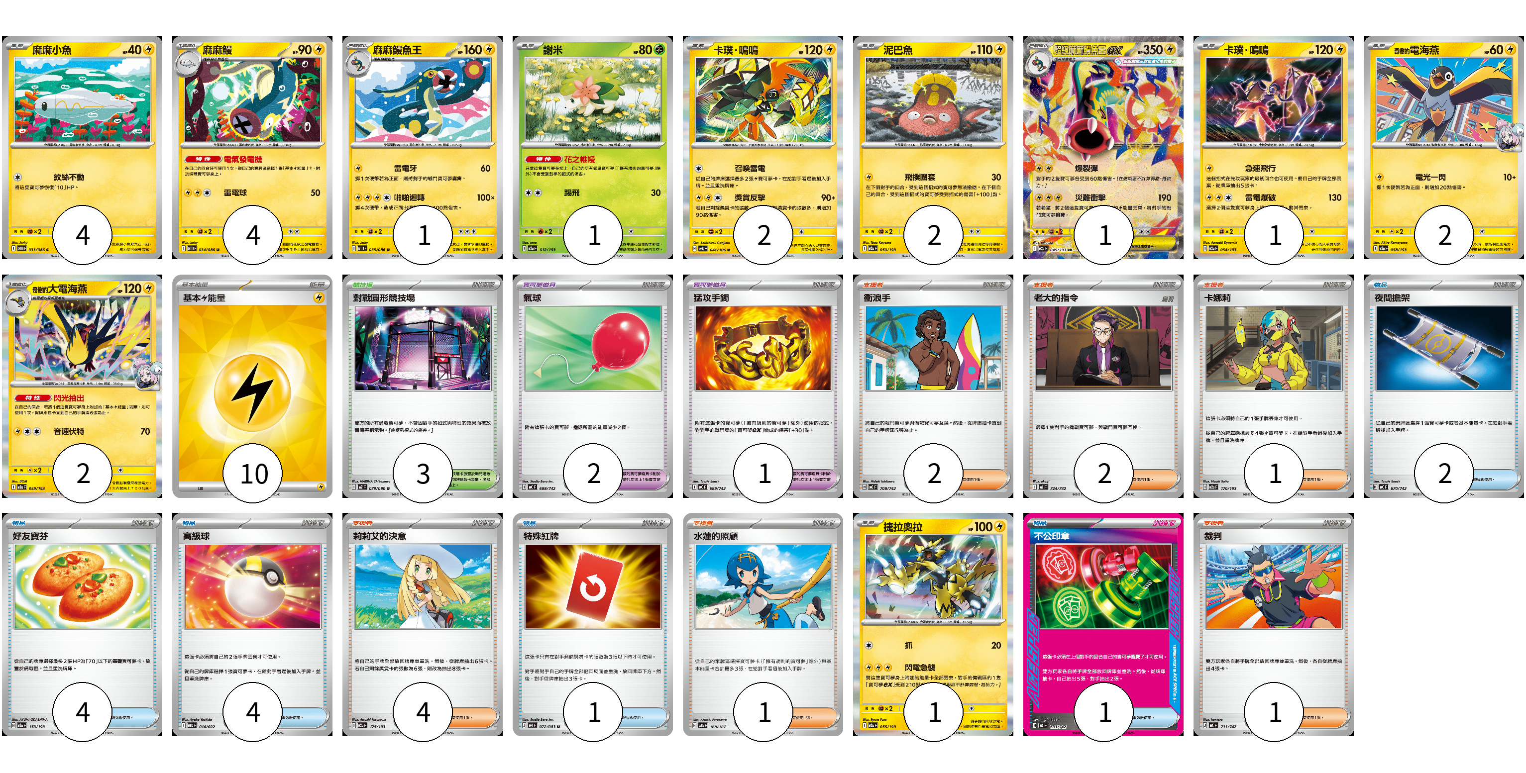 牌組構築方案 以此牌組為基礎新構築牌組 顯示卡面 顯示列表 寶可夢卡(21) 4 4 1 1 2 2 1 1 2 2 1 寶可夢道具(3) 2 1 物品卡(12) 2 4 4 1 1 支援者卡(11) 2 2 1 4 1 1 競技場卡(3) 3 能量卡(10) 10 寶可夢卡(21) 卡牌名稱 張數 卡牌名稱 張數 麻麻小魚 SV11B 033/086 04 麻麻鰻 SV11B 034/086 04 麻麻鰻魚王 SV11B 035/086 01 謝米 M2a 012/193 01 卡璞・鳴鳴 SV8 041/106 02 泥巴魚 M2a 050/193 02 超級麻麻鰻魚王ex M2a 049/193 01 卡璞・鳴鳴 M2a 054/193 01 奇樹的電海燕 M2a 058/193 02 奇樹的大電海燕 M2a 059/193 02 捷拉奧拉 M2a 055/193 01 寶可夢道具(3) 卡牌名稱 張數 卡牌名稱 張數 氣球 MC 688/742 02 猛攻手鐲 MC 689/742 01 物品卡(12) 卡牌名稱 張數 卡牌名稱 張數 夜間擔架 MC 670/742 02 好友寶芬 M2a 153/193 04 高級球 MBD 014/022 04 特殊紅牌 M4 072/083 01 不公印章 MC 633/742 01 支援者卡(11) 卡牌名稱 張數 卡牌名稱 張數 衝浪手 MC 708/742 02 老大的指令 MC 724/742 02 卡娜莉 M2a 170/193 01 莉莉艾的決意 M2a 175/193 04 水蓮的照顧 SV8a 168/187 01 裁判 MC 711/742 01 競技場卡(3) 卡牌名稱 張數 卡牌名稱 張數 對戰圓形競技場 M2 079/080 03 能量卡(10) 卡牌名稱 張數 卡牌名稱 張數 基本【雷】能量 SVQP LIG 10 以此牌組為基礎新構築牌組 牌組編碼 PTfVlC-qdURFC-jowZhv copy 列印牌組單 牌組編碼已複製 分享至SNS