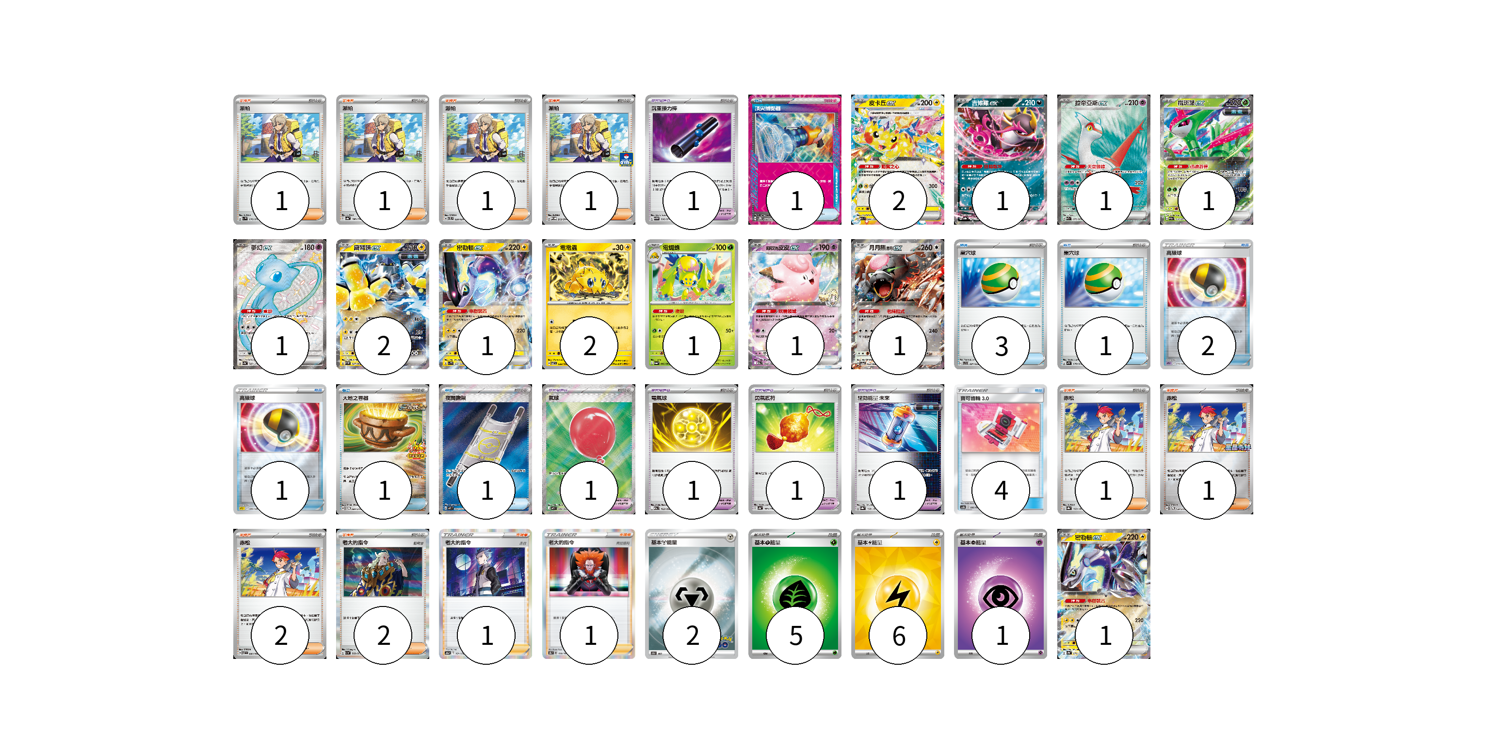 牌組構築方案 以此牌組為基礎新構築牌組 顯示卡面 顯示列表 寶可夢卡(15) 2 1 1 1 1 2 1 2 1 1 1 1 寶可夢道具(5) 1 1 1 1 1 物品卡(14) 1 3 1 2 1 1 1 4 支援者卡(12) 1 1 1 1 1 1 2 2 1 1 能量卡(14) 2 5 6 1 寶可夢卡(15) 卡牌名稱 張數 卡牌名稱 張數 皮卡丘ex M2a 044/193 02 吉雉雞ex SV8a 104/187 01 拉帝亞斯ex SV7a 078/064 01 鐵斑葉ex SV5M 016/071 01 夢幻ex SV4a 327/190 01 鐵臂膀ex SV4M 027/066 02 密勒頓ex SV1V 037/078 01 電電蟲 SV7 032/102 02 電蜘蛛 SV6a 002/064 01 莉莉艾的皮皮ex M2a 060/193 01 月月熊 赫月 ex SV5a 052/066 01 密勒頓ex SV4a 071/190 01 寶可夢道具(5) 卡牌名稱 張數 卡牌名稱 張數 沉重接力棒 SV5M 066/071 01 氣球 M1L 084/063 01 電氣球 M2a 163/193 01 勇氣護符 SV4a 169/190 01 驅勁能量 未來 SV8a 158/187 01 物品卡(14) 卡牌名稱 張數 卡牌名稱 張數 頂尖捕捉器 SV5M 062/071 01 巢穴球 SVB 001/028 03 巢穴球 SV1S 070/078 01 高級球 SPD 010/020 02 高級球 SPZ 009/020 01 大地之容器 SV-P 084/SV-P 01 夜間擔架 M1L 083/063 01 寶可齒輪3.0 AS6b 190/194 04 支援者卡(12) 卡牌名稱 張數 卡牌名稱 張數 派帕 SV1V 076/078 01 派帕 SV4a 180/190 01 派帕 SVTL 020/021 01 派帕 SV-P 213/SV-P 01 赤松 SV8a 163/187 01 赤松 SV-P 150/SV-P 01 赤松 SV7 097/102 02 老大的指令 SV1a 069/073 02 老大的指令(赤日) S12a 161/172 01 老大的指令(弗拉達利) S8b 158/184 01 能量卡(14) 卡牌名稱 張數 卡牌名稱 張數 基本鋼能量 S10b MET 02 基本【草】能量 M-P GRA 05 基本【雷】能量 SVQP LIG 06 基本【超】能量 M-P PSY 01 以此牌組為基礎新構築牌組 牌組編碼 PZYHHk-NtskCE-ElSSqX copy 列印牌組單 牌組編碼已複製 分享至SNS