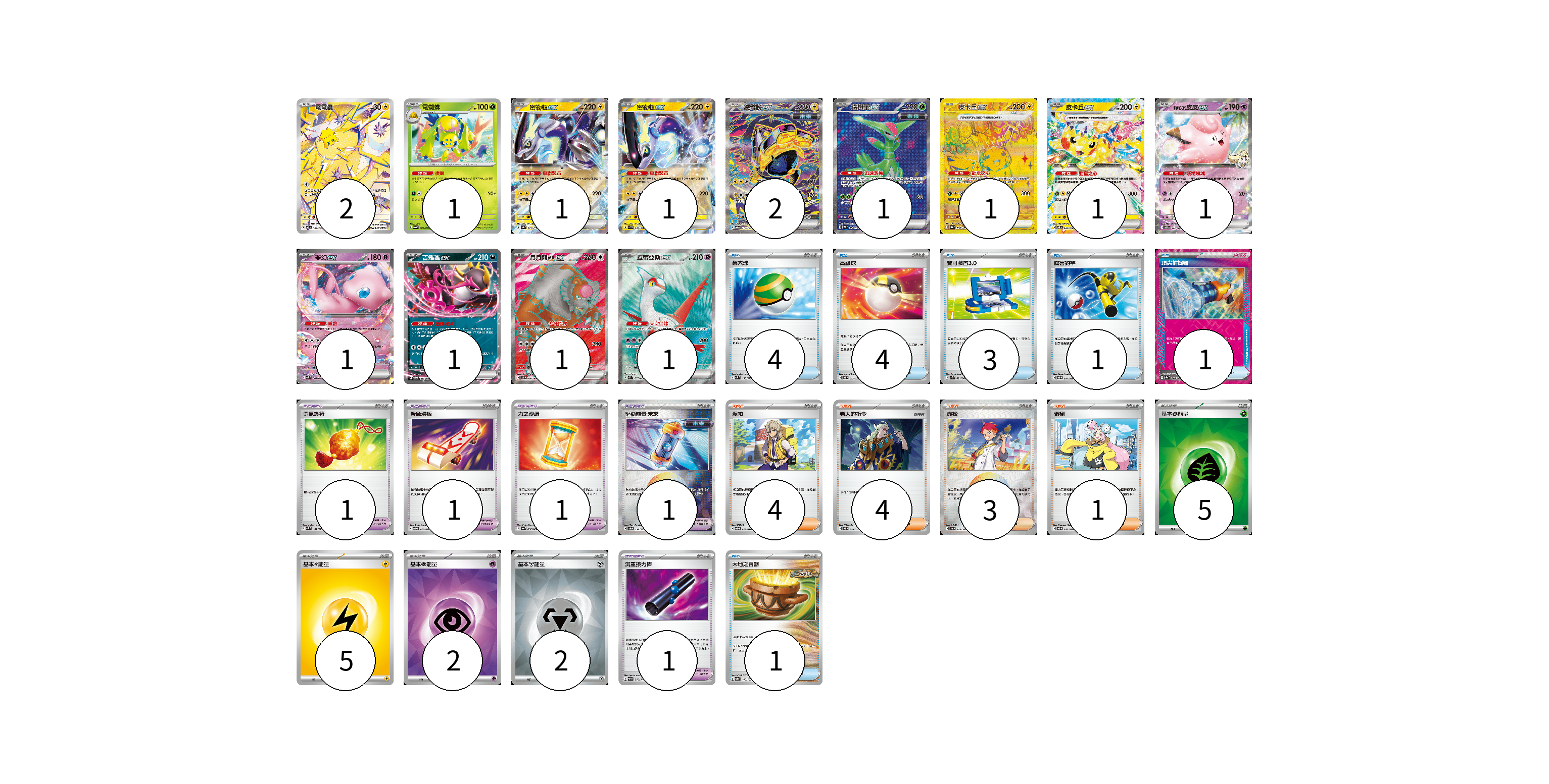 牌組構築方案 以此牌組為基礎新構築牌組 顯示卡面 顯示列表 寶可夢卡(15) 2 1 1 1 2 1 1 1 1 1 1 1 1 寶可夢道具(5) 1 1 1 1 1 物品卡(14) 4 4 3 1 1 1 支援者卡(12) 4 4 3 1 能量卡(14) 5 5 2 2 寶可夢卡(15) 卡牌名稱 張數 卡牌名稱 張數 電電蟲 SV7 108/102 02 電蜘蛛 SV6a 002/064 01 密勒頓ex SV4a 071/190 01 密勒頓ex SV1V 037/078 01 鐵臂膀ex SV8a 210/187 02 鐵斑葉ex SV5M 084/071 01 皮卡丘ex SV8a 236/187 01 皮卡丘ex SV8 033/106 01 莉莉艾的皮皮ex SV9 033/100 01 夢幻ex SVK 001/042 01 吉雉雞ex SVOD 004/020 01 月月熊 赫月 ex SV5a 084/066 01 拉帝亞斯ex SV7a 078/064 01 寶可夢道具(5) 卡牌名稱 張數 卡牌名稱 張數 勇氣護符 SVM 142/175 01 緊急滑板 SVOD 015/020 01 力之沙漏 SV6a 058/064 01 驅勁能量 未來 SV8a 158/187 01 沉重接力棒 SV5M 066/071 01 物品卡(14) 卡牌名稱 張數 卡牌名稱 張數 巢穴球 SVM 133/175 04 高級球 SVOD 012/020 04 寶可裝置3.0 SVK 021/042 03 厲害釣竿 SVOD 010/020 01 頂尖捕捉器 SV8a 148/187 01 大地之容器 SV8a 143/187 01 支援者卡(12) 卡牌名稱 張數 卡牌名稱 張數 派帕 SVOD 018/020 04 老大的指令 SVOD 019/020 04 赤松 SV8a 163/187 03 奇樹 SVOD 016/020 01 能量卡(14) 卡牌名稱 張數 卡牌名稱 張數 基本【草】能量 SVK GRA 05 基本【雷】能量 SVTR LIG 05 基本【超】能量 SVOD PSY 02 基本【鋼】能量 SVOD MET 02 以此牌組為基礎新構築牌組 牌組編碼 PaXoSl-VMjCNR-jcFkKS copy 列印牌組單 牌組編碼已複製 分享至SNS