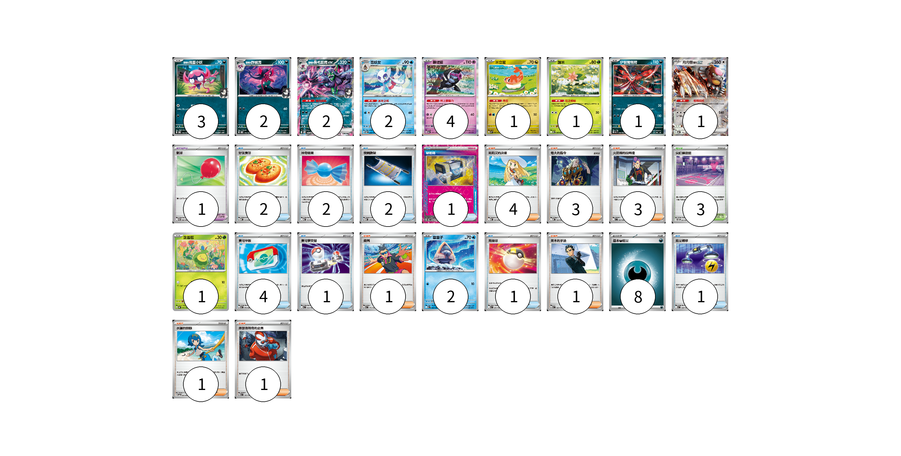 牌組構築方案 以此牌組為基礎新構築牌組 顯示卡面 顯示列表 寶可夢卡(20) 3 2 2 2 4 1 1 1 1 1 2 寶可夢道具(1) 1 物品卡(14) 2 2 2 1 4 1 1 1 支援者卡(14) 4 3 3 1 1 1 1 競技場卡(3) 3 能量卡(8) 8 寶可夢卡(20) 卡牌名稱 張數 卡牌名稱 張數 <瑪俐的>搗蛋小妖 SVOM 005/021 03 <瑪俐的>詐唬魔 SVOM 006/021 02 <瑪俐的>長毛巨魔ex SVOM 007/021 02 雪妖女 SV6 033/101 02 願增猿 SV8a 075/187 04 米立龍 SVK 002/042 01 謝米 SV9a 006/063 01 伊裴爾塔爾 M1L 040/063 01 月月熊 赫月ex SV8a 134/187 01 含羞苞 SV8a 001/187 01 雪童子 M2a 035/193 02 寶可夢道具(1) 卡牌名稱 張數 卡牌名稱 張數 氣球 SV11B 082/086 01 物品卡(14) 卡牌名稱 張數 卡牌名稱 張數 好友寶芬 MBD 013/022 02 神奇糖果 MBG 013/022 02 夜間擔架 MBD 016/022 02 秘密箱 SV6 092/101 01 寶可平板 M3 070/080 04 寶可夢交替 MC 663/742 01 高級球 MC 651/742 01 能量轉移 MC 638/742 01 支援者卡(14) 卡牌名稱 張數 卡牌名稱 張數 莉莉艾的決意 MBD 021/022 04 老大的指令 MBD 020/022 03 火箭隊的拉姆達 SV10 094/098 03 裁判 MC 711/742 01 青木的手法 MC 695/742 01 水蓮的照顧 SV5a 064/066 01 庫瑟洛斯奇的企圖 MC 705/742 01 競技場卡(3) 卡牌名稱 張數 卡牌名稱 張數 尖釘鎮道館 SVOM 021/021 03 能量卡(8) 卡牌名稱 張數 卡牌名稱 張數 基本【惡】能量 MC DAR 08 以此牌組為基礎新構築牌組 牌組編碼 PaoiZu-qRSWVK-WRKNQm copy 列印牌組單 牌組編碼已複製 分享至SNS
