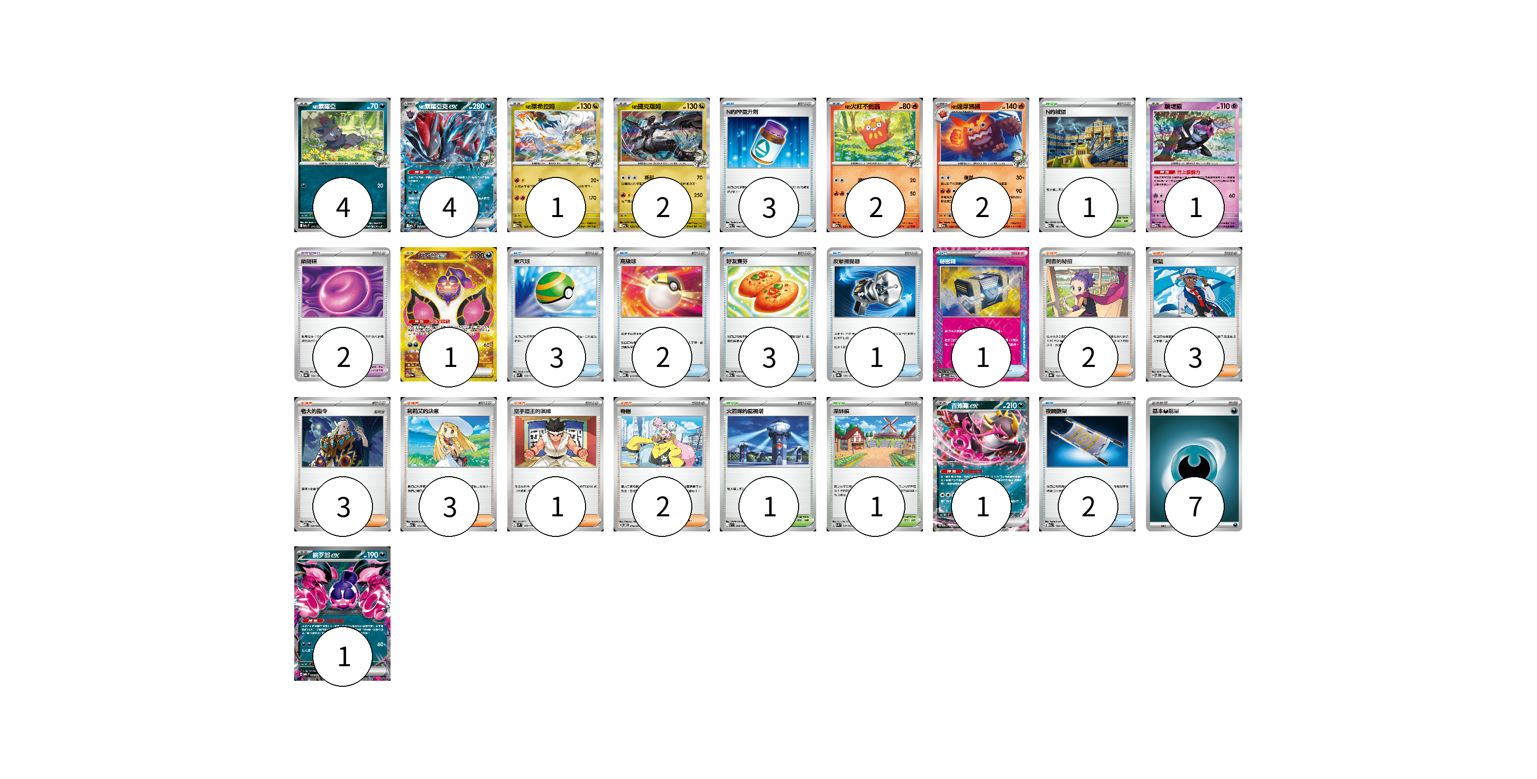 牌組構築方案 以此牌組為基礎新構築牌組 顯示卡面 顯示列表 寶可夢卡(19) 4 4 1 2 2 2 1 1 1 1 寶可夢道具(2) 2 物品卡(15) 3 3 2 3 1 1 2 支援者卡(14) 2 3 3 3 1 2 競技場卡(3) 1 1 1 能量卡(7) 7 寶可夢卡(19) 卡牌名稱 張數 卡牌名稱 張數 N的索羅亞 M2a 111/193 04 N的索羅亞克ex M2a 112/193 04 N的萊希拉姆 M2a 128/193 01 N的捷克羅姆 M2a 129/193 02 N的火紅不倒翁 M2a 027/193 02 N的達摩狒狒 M2a 028/193 02 願增猿 M2a 081/193 01 桃歹郎ex SV6a 092/064 01 吉雉雞ex M2a 114/193 01 桃歹郎ex MBG 009/022 01 寶可夢道具(2) 卡牌名稱 張數 卡牌名稱 張數 鎖鏈糬 SV8a 154/187 02 物品卡(15) 卡牌名稱 張數 卡牌名稱 張數 N的PP提升劑 M2a 146/193 03 巢穴球 SVM 133/175 03 高級球 MBD 014/022 02 好友寶芬 M2a 153/193 03 反擊捕捉器 SV8a 139/187 01 秘密箱 SV6 092/101 01 夜間擔架 M2a 159/193 02 支援者卡(14) 卡牌名稱 張數 卡牌名稱 張數 阿杏的秘招 SV8a 166/187 02 席藍 SV8 102/106 03 老大的指令 MBD 020/022 03 莉莉艾的決意 M2a 175/193 03 空手道王的演練 SVM 143/175 01 奇樹 SVOM 018/021 02 競技場卡(3) 卡牌名稱 張數 卡牌名稱 張數 N的城堡 M2a 181/193 01 火箭隊的監視塔 SV10 096/098 01 深缽鎮 SVK 039/042 01 能量卡(7) 卡牌名稱 張數 卡牌名稱 張數 基本【惡】能量 SVF DAR 07 以此牌組為基礎新構築牌組 牌組編碼 PbCywS-adAjFU-KFZrbM copy 列印牌組單 牌組編碼已複製 分享至SNS