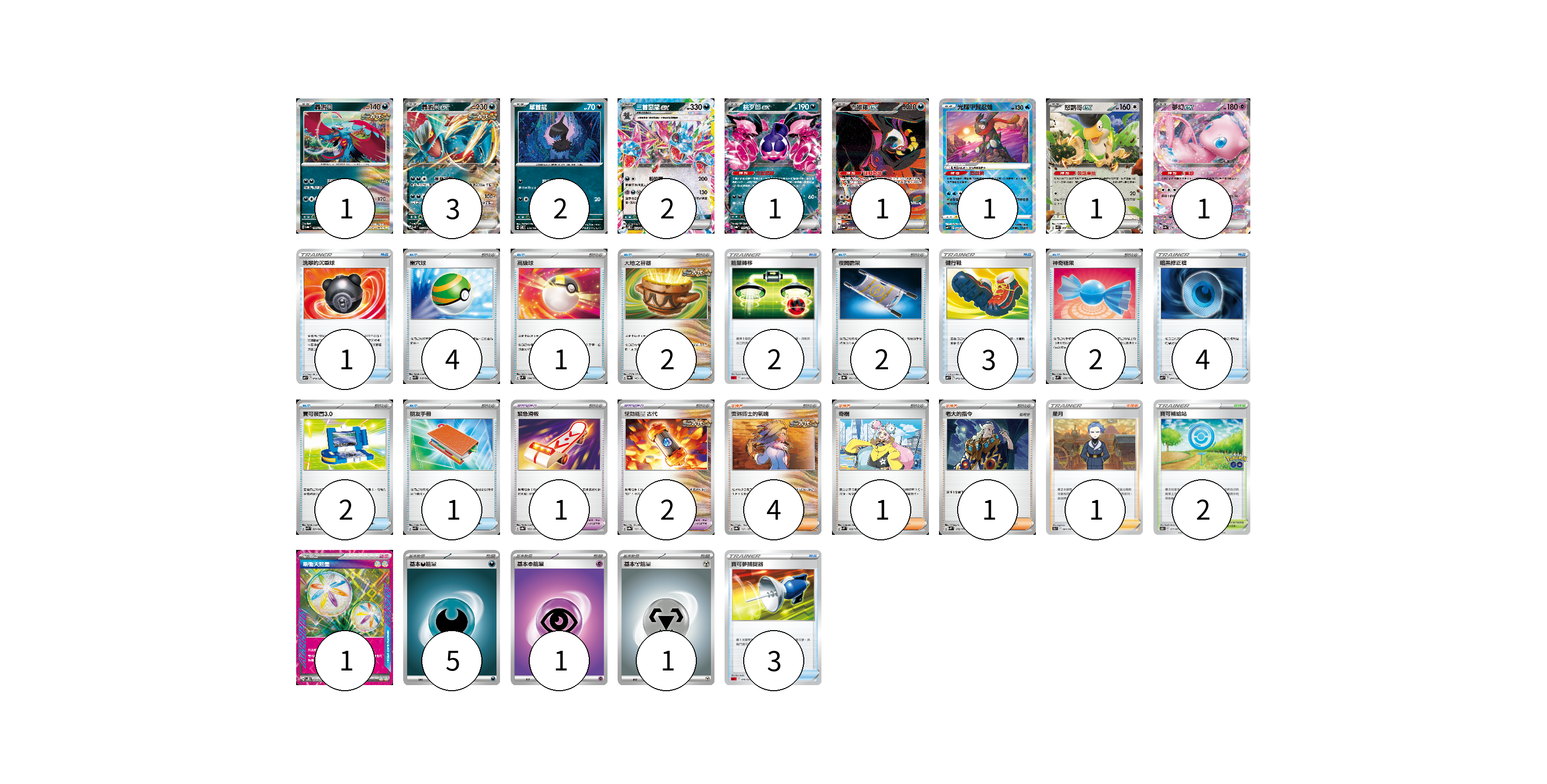 牌組構築方案 以此牌組為基礎新構築牌組 顯示卡面 顯示列表 寶可夢卡(13) 1 3 2 2 1 1 1 1 1 寶可夢道具(3) 1 2 物品卡(27) 1 4 1 2 2 2 3 2 4 2 1 3 支援者卡(7) 4 1 1 1 競技場卡(2) 2 能量卡(8) 1 5 1 1 寶可夢卡(13) 卡牌名稱 張數 卡牌名稱 張數 轟鳴月 SV8a 100/187 01 轟鳴月ex SV4K 054/066 03 單首龍 SV8 070/106 02 三首惡龍ex SV8 072/106 02 桃歹郎ex SV8a 105/187 01 吉雉雞ex SV6a 089/064 01 光輝甲賀忍蛙 SVF 004/038 01 怒鸚哥ex SVK 006/042 01 夢幻ex SV4a 076/190 01 寶可夢道具(3) 卡牌名稱 張數 卡牌名稱 張數 緊急滑板 SV8a 153/187 01 驅勁能量 古代 SV8a 157/187 02 物品卡(27) 卡牌名稱 張數 卡牌名稱 張數 洗翠的沉重球 SVF 019/038 01 巢穴球 SVK 016/042 04 高級球 SVM 134/175 01 大地之容器 SV8a 143/187 02 能量轉移 SDL 011/021 02 夜間擔架 SV8a 151/187 02 健行鞋 SVF 015/038 03 神奇糖果 SVM 135/175 02 暗黑修正檔 SVF 014/038 04 寶可裝置3.0 SVK 021/042 02 朋友手冊 SVK 014/042 01 寶可夢捕捉器 SDL 016/021 03 支援者卡(7) 卡牌名稱 張數 卡牌名稱 張數 奧琳博士的氣魄 SV8a 167/187 04 奇樹 SVM 160/175 01 老大的指令 SVM 172/175 01 星月 S9a 064/067 01 競技場卡(2) 卡牌名稱 張數 卡牌名稱 張數 寶可補給站 S10b 071/071 02 能量卡(8) 卡牌名稱 張數 卡牌名稱 張數 新衝天能量 SV5K 071/071 01 基本【惡】能量 SVF DAR 05 基本【超】能量 SVEM PSY 01 基本【鋼】能量 SVF MET 01 以此牌組為基礎新構築牌組 牌組編碼 PhQmfj-CzJeKJ-xEBYJi copy 列印牌組單 牌組編碼已複製 分享至SNS