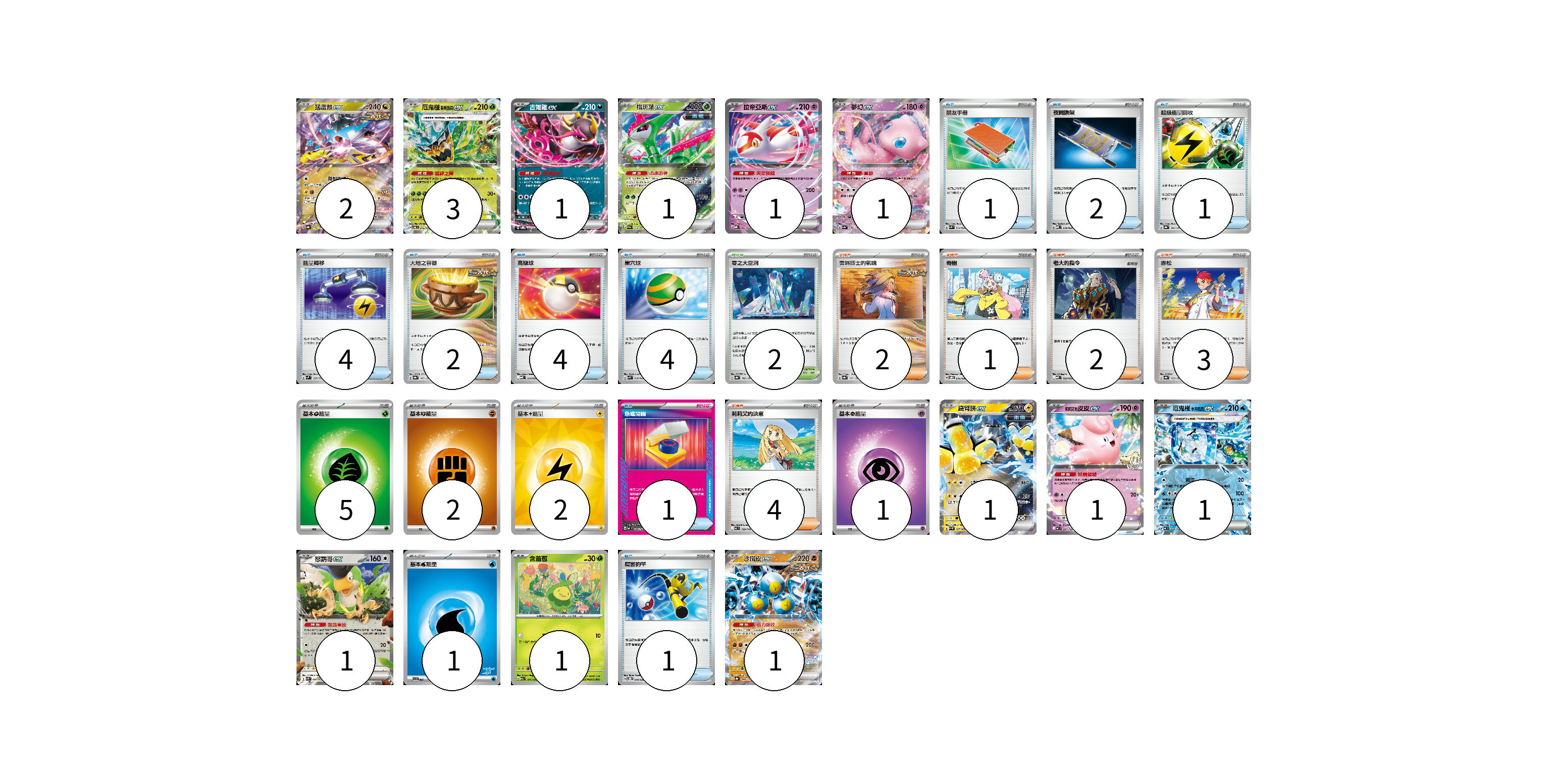 牌組構築方案 以此牌組為基礎新構築牌組 顯示卡面 顯示列表 寶可夢卡(15) 2 3 1 1 1 1 1 1 1 1 1 1 物品卡(20) 1 2 1 4 2 4 4 1 1 支援者卡(12) 2 1 2 3 4 競技場卡(2) 2 能量卡(11) 5 2 2 1 1 寶可夢卡(15) 卡牌名稱 張數 卡牌名稱 張數 猛雷鼓ex SV8a 124/187 02 厄鬼椪 碧草面具ex SV6 016/101 03 吉雉雞ex SVOD 004/020 01 鐵斑葉ex SV5M 016/071 01 拉帝亞斯ex MBD 003/022 01 夢幻ex SV4a 076/190 01 鐵臂膀ex SV4M 027/066 01 莉莉艾的皮皮ex MC 287/742 01 厄鬼椪 水井面具ex MC 224/742 01 怒鸚哥ex SVK 006/042 01 含羞苞 M2a 011/193 01 沙鐵皮ex SV8a 088/187 01 物品卡(20) 卡牌名稱 張數 卡牌名稱 張數 朋友手冊 SVK 014/042 01 夜間擔架 MBD 016/022 02 超級能量回收 SV8a 141/187 01 能量轉移 SVM 127/175 04 大地之容器 SV8a 143/187 02 高級球 MBD 014/022 04 巢穴球 SVK 016/042 04 急進開關 MC 646/742 01 厲害釣竿 SVOD 010/020 01 支援者卡(12) 卡牌名稱 張數 卡牌名稱 張數 奧琳博士的氣魄 SV8a 167/187 02 奇樹 SVOD 016/020 01 老大的指令 MBD 020/022 02 赤松 SV8a 163/187 03 莉莉艾的決意 MC 729/742 04 競技場卡(2) 卡牌名稱 張數 卡牌名稱 張數 零之大空洞 SV8a 182/187 02 能量卡(11) 卡牌名稱 張數 卡牌名稱 張數 基本【草】能量 M-P GRA 05 基本【鬥】能量 M-P FIG 02 基本【雷】能量 SVQP LIG 02 基本【超】能量 MBD PSY 01 基本【水】能量 SVI WAT 01 以此牌組為基礎新構築牌組 牌組編碼 PhfnbL-GSethN-OWIbbG copy 列印牌組單 牌組編碼已複製 分享至SNS