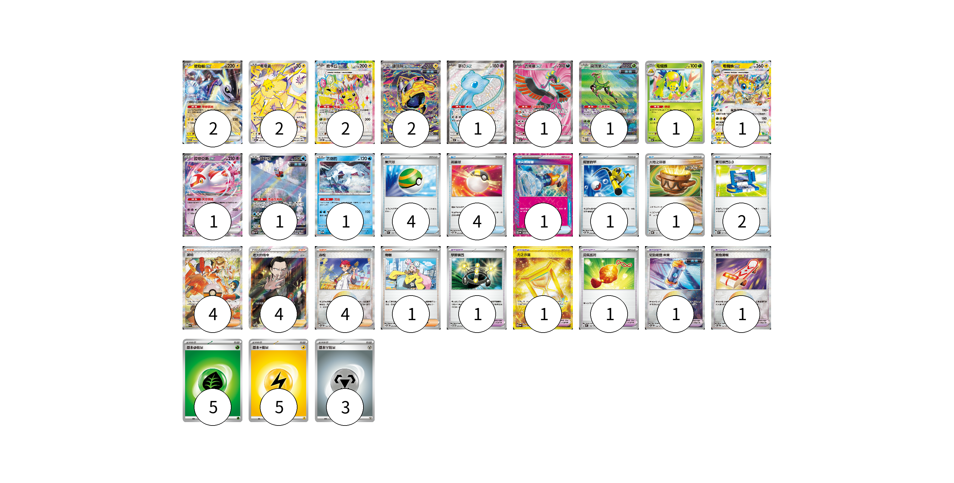 牌組構築方案 以此牌組為基礎新構築牌組 顯示卡面 顯示列表 寶可夢卡(16) 2 2 2 2 1 1 1 1 1 1 1 1 寶可夢道具(5) 1 1 1 1 1 物品卡(13) 4 4 1 1 1 2 支援者卡(13) 4 4 4 1 能量卡(13) 5 5 3 寶可夢卡(16) 卡牌名稱 張數 卡牌名稱 張數 密勒頓ex SVTR 008/021 02 電電蟲 SV7 108/102 02 皮卡丘ex SV8 122/106 02 鐵臂膀ex SV8a 210/187 02 夢幻ex SV4a 327/190 01 吉雉雞ex SV6a 081/064 01 鐵斑葉ex SV5M 093/071 01 電蜘蛛 SV6a 002/064 01 電蜘蛛ex SV7 033/102 01 拉帝亞斯ex SV7a 019/064 01 鐵包袱 SV4M 071/066 01 古劍豹 SV-P 190/SV-P 01 寶可夢道具(5) 卡牌名稱 張數 卡牌名稱 張數 學習裝置 SVTM 016/022 01 力之沙漏 SV6a 094/064 01 勇氣護符 SVM 142/175 01 驅勁能量 未來 SV8a 158/187 01 緊急滑板 SV8a 153/187 01 物品卡(13) 卡牌名稱 張數 卡牌名稱 張數 巢穴球 SVM 133/175 04 高級球 SVOD 012/020 04 頂尖捕捉器 SV8a 148/187 01 厲害釣竿 SVOD 010/020 01 大地之容器 SV8a 143/187 01 寶可裝置3.0 SVK 021/042 02 支援者卡(13) 卡牌名稱 張數 卡牌名稱 張數 派帕 SV4a 353/190 04 老大的指令(坂木) SC1b 170/153 04 赤松 SV8a 163/187 04 奇樹 SVOD 016/020 01 能量卡(13) 卡牌名稱 張數 卡牌名稱 張數 基本【草】能量 SVF GRA 05 基本【雷】能量 SVF LIG 05 基本【鋼】能量 SVF MET 03 以此牌組為基礎新構築牌組 牌組編碼 PjbRkW-pIcFmB-sCGVjs copy 列印牌組單 牌組編碼已複製 分享至SNS