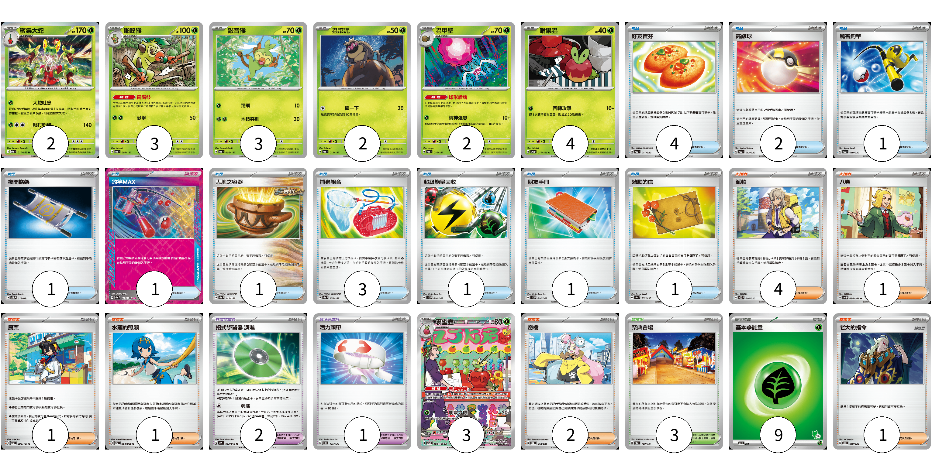 牌組構築方案 以此牌組為基礎新構築牌組 顯示卡面 顯示列表 寶可夢卡(19) 2 3 3 2 2 4 3 寶可夢道具(3) 2 1 物品卡(16) 4 2 1 1 1 1 3 1 1 1 支援者卡(10) 4 1 1 1 2 1 競技場卡(3) 3 能量卡(9) 9 寶可夢卡(19) 卡牌名稱 張數 卡牌名稱 張數 蜜集大蛇 SV9a 011/063 02 啪咚猴 SV8a 007/187 03 敲音猴 SV8a 006/187 03 蟲滾泥 SV8a 013/187 02 蟲甲聖 SV8a 014/187 02 啃果蟲 SV6 011/101 04 裹蜜蟲 SV6 103/101 03 寶可夢道具(3) 卡牌名稱 張數 卡牌名稱 張數 招式學習器 演進 SV4M 063/066 02 活力頭帶 SVD 125/139 01 物品卡(16) 卡牌名稱 張數 卡牌名稱 張數 好友寶芬 SVOD 011/020 04 高級球 SVOD 012/020 02 厲害釣竿 SVOD 010/020 01 夜間擔架 SVOM 016/021 01 釣竿MAX SV8a 142/187 01 大地之容器 SV8a 143/187 01 捕蟲組合 SV8a 150/187 03 超級能量回收 SVK 010/042 01 朋友手冊 SVK 014/042 01 勉勵的信 SV4a 162/190 01 支援者卡(10) 卡牌名稱 張數 卡牌名稱 張數 派帕 SVOD 018/020 04 八朔 SV6 098/101 01 烏栗 SV6 096/101 01 水蓮的照顧 SV5a 064/066 01 奇樹 SVOM 018/021 02 老大的指令 SVOD 019/020 01 競技場卡(3) 卡牌名稱 張數 卡牌名稱 張數 祭典會場 SV8a 180/187 03 能量卡(9) 卡牌名稱 張數 卡牌名稱 張數 基本【草】能量 SVI GRA 09 以此牌組為基礎新構築牌組 牌組編碼 PlKeXX-blQpvB-CCLehD copy 列印牌組單 牌組編碼已複製 分享至SNS