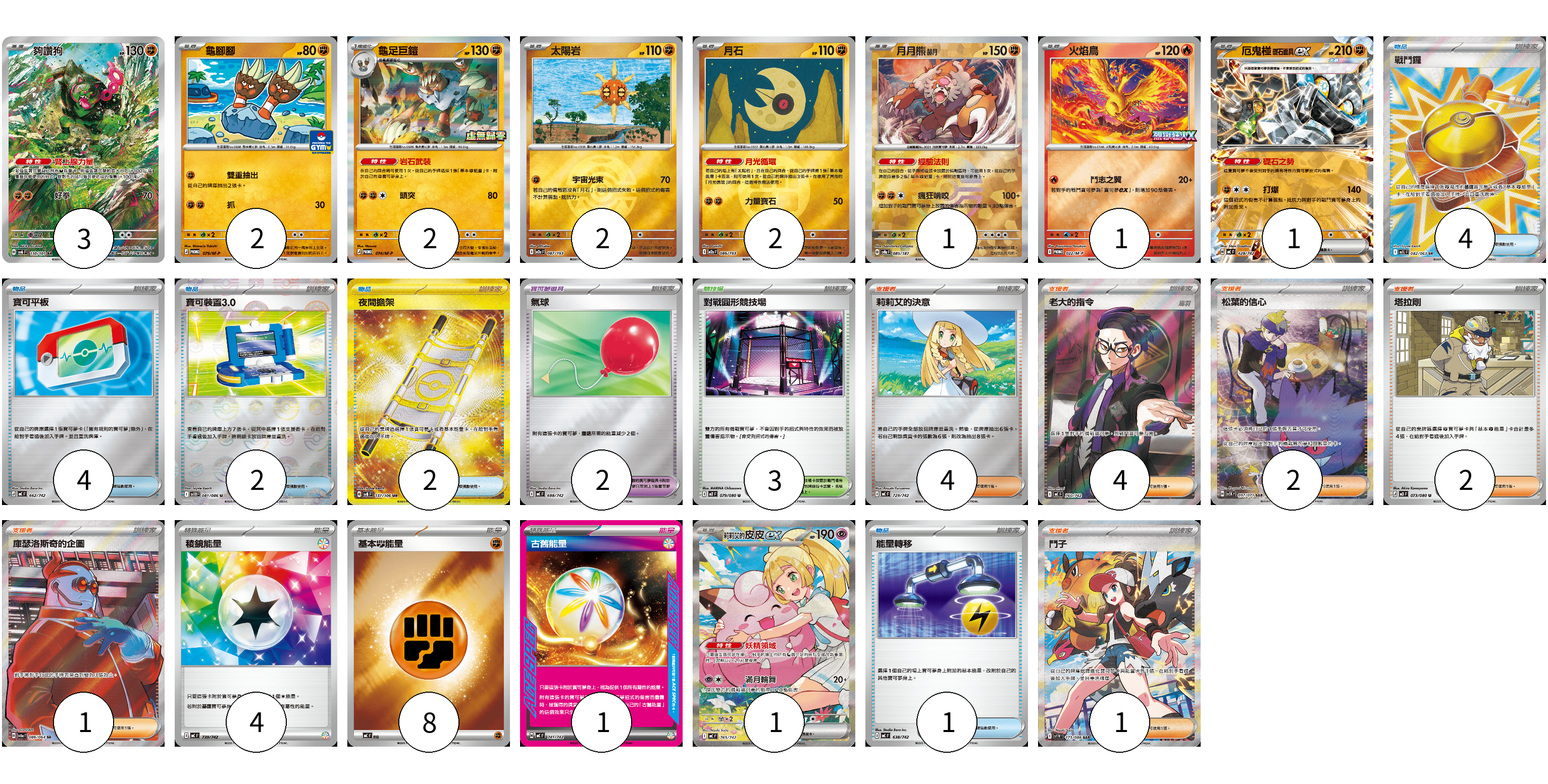牌組構築方案 以此牌組為基礎新構築牌組 顯示卡面 顯示列表 寶可夢卡(15) 3 2 2 2 2 1 1 1 1 寶可夢道具(2) 2 物品卡(13) 4 4 2 2 1 支援者卡(14) 4 4 2 2 1 1 競技場卡(3) 3 能量卡(13) 4 8 1 寶可夢卡(15) 卡牌名稱 張數 卡牌名稱 張數 夠讚狗 SV6 110/101 03 龜腳腳 M-P 079/M-P 02 龜足巨鎧 M-P 074/M-P 02 太陽岩 M2a 087/193 02 月石 M2a 086/193 02 月月熊 赫月 SV8a 085/187 01 火焰鳥 M-P 022/M-P 01 厄鬼椪 礎石面具ex MC 428/742 01 莉莉艾的皮皮ex MC 765/742 01 寶可夢道具(2) 卡牌名稱 張數 卡牌名稱 張數 氣球 MC 688/742 02 物品卡(13) 卡牌名稱 張數 卡牌名稱 張數 戰鬥鑼 M1L 082/063 04 寶可平板 MC 662/742 04 寶可裝置3.0 SV11B 081/086 02 夜間擔架 SV8 137/106 02 能量轉移 MC 638/742 01 支援者卡(14) 卡牌名稱 張數 卡牌名稱 張數 莉莉艾的決意 MC 729/742 04 老大的指令(烏羽) MC 760/742 04 松葉的信心 SV5K 097/071 02 塔拉剛 M3 073/080 02 庫瑟洛斯奇的企圖 SV6a 086/064 01 鬥子 SV11W 173/086 01 競技場卡(3) 卡牌名稱 張數 卡牌名稱 張數 對戰圓形競技場 M2 079/080 03 能量卡(13) 卡牌名稱 張數 卡牌名稱 張數 稜鏡能量 MC 739/742 04 基本【鬥】能量 MC FIG 08 古舊能量 MC 741/742 01 以此牌組為基礎新構築牌組 牌組編碼 PrRWDp-cpGYxW-CTUXHv copy 列印牌組單 牌組編碼已複製 分享至SNS