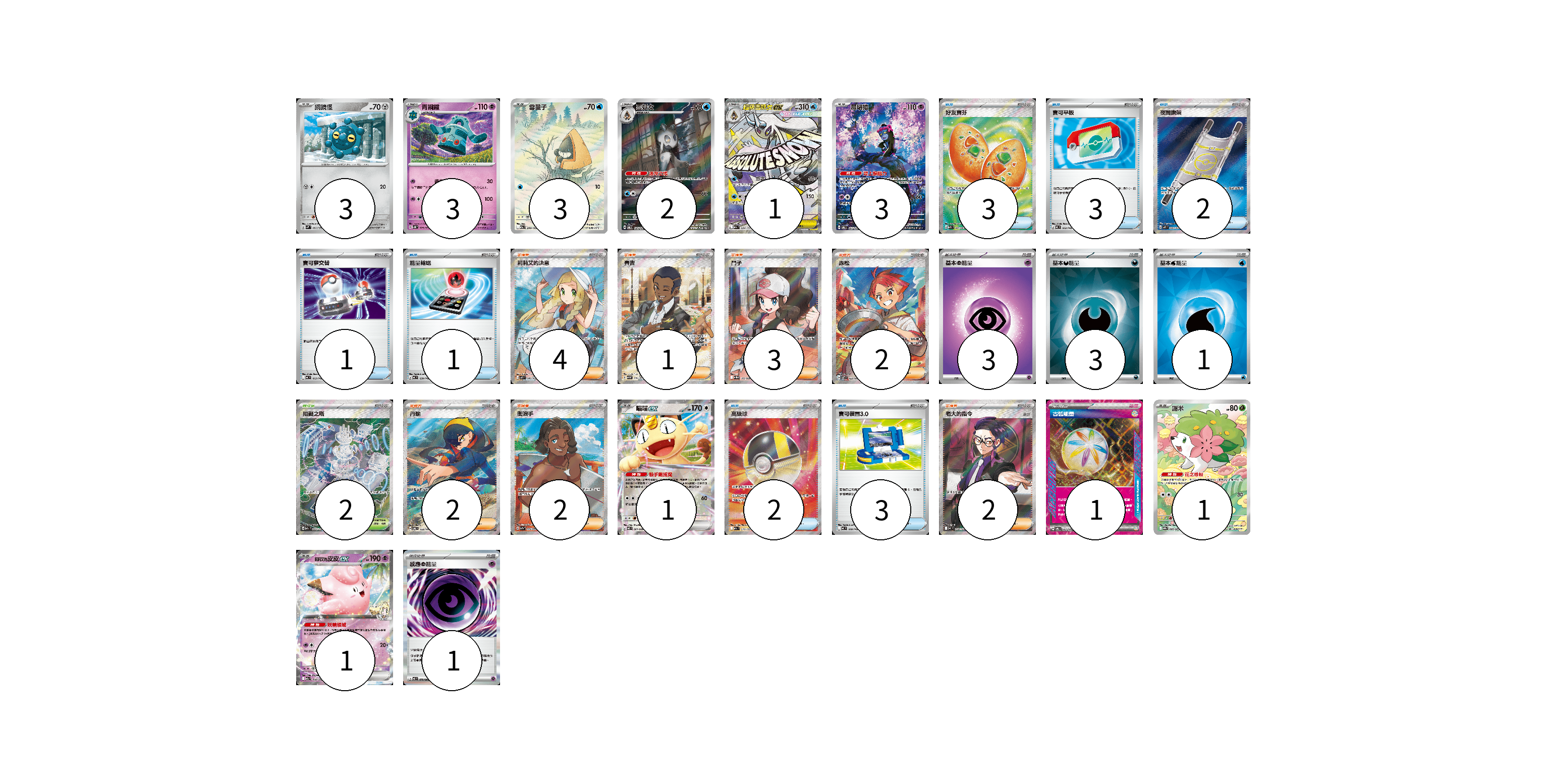 牌組構築方案 以此牌組為基礎新構築牌組 顯示卡面 顯示列表 寶可夢卡(18) 3 3 3 2 1 3 1 1 1 物品卡(15) 3 3 2 1 1 2 3 支援者卡(16) 4 1 3 2 2 2 2 競技場卡(2) 2 能量卡(9) 3 3 1 1 1 寶可夢卡(18) 卡牌名稱 張數 卡牌名稱 張數 銅鏡怪 SVM 081/175 03 青銅鐘 SV5K 029/071 03 雪童子 M2a 200/193 03 雪妖女 SV6 104/101 02 超級雪妖女ex M2a 224/193 01 願增猿 SV6 107/101 03 喵喵ex M3 061/080 01 謝米 SV9a 066/063 01 莉莉艾的皮皮ex M2a 060/193 01 物品卡(15) 卡牌名稱 張數 卡牌名稱 張數 好友寶芬 M1S 081/063 03 寶可平板 MC 662/742 03 夜間擔架 M1L 083/063 02 寶可夢交替 MC 663/742 01 能量輸送 MC 639/742 01 高級球 M2a 216/193 02 寶可裝置3.0 MC 660/742 03 支援者卡(16) 卡牌名稱 張數 卡牌名稱 張數 莉莉艾的決意 M1L 086/063 04 賽吉 SV5M 091/071 01 鬥子 SV11W 166/086 03 赤松 SV7 123/102 02 丹瑜 SV6 123/101 02 衝浪手 SV7a 084/064 02 老大的指令(烏羽) MC 760/742 02 競技場卡(2) 卡牌名稱 張數 卡牌名稱 張數 阻礙之塔 M2a 222/193 02 能量卡(9) 卡牌名稱 張數 卡牌名稱 張數 基本【超】能量 MC PSY 03 基本【惡】能量 SVM DAR 03 基本【水】能量 SVM WAT 01 古舊能量 SV6 101/101 01 感應【超】能量 M3 079/080 01 以此牌組為基礎新構築牌組 牌組編碼 PuxwLk-JEvTFA-HOqFFP copy 列印牌組單 牌組編碼已複製 分享至SNS