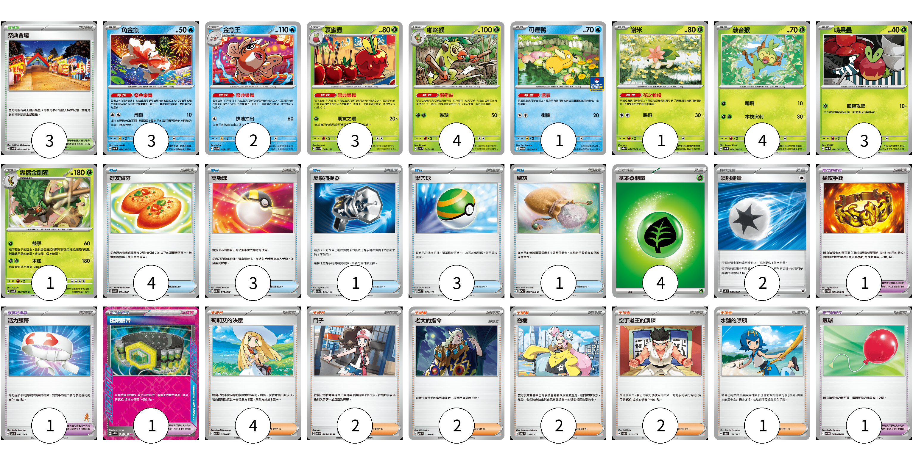 牌組構築方案 以此牌組為基礎新構築牌組 顯示卡面 顯示列表 寶可夢卡(22) 3 2 3 4 1 1 4 3 1 寶可夢道具(4) 1 1 1 1 物品卡(12) 4 3 1 3 1 支援者卡(13) 4 2 2 2 2 1 競技場卡(3) 3 能量卡(6) 4 2 寶可夢卡(22) 卡牌名稱 張數 卡牌名稱 張數 角金魚 SV6 026/101 03 金魚王 SV8a 029/187 02 裹蜜蟲 SV8a 009/187 03 啪咚猴 SV8a 007/187 04 可達鴨 SV-P 220/SV-P 01 謝米 SV9a 006/063 01 敲音猴 SV6 008/101 04 啃果蟲 SV6 011/101 03 轟擂金剛猩 SV6 010/101 01 寶可夢道具(4) 卡牌名稱 張數 卡牌名稱 張數 猛攻手鐲 SV11W 082/086 01 活力頭帶 SVI 057/066 01 極限腰帶 SV5K 066/071 01 氣球 SV11B 082/086 01 物品卡(12) 卡牌名稱 張數 卡牌名稱 張數 好友寶芬 MBD 013/022 04 高級球 MBD 014/022 03 反擊捕捉器 SV8a 139/187 01 巢穴球 SVM 133/175 03 聖灰 SV9a 056/063 01 支援者卡(13) 卡牌名稱 張數 卡牌名稱 張數 莉莉艾的決意 MBD 021/022 04 鬥子 SV11W 085/086 02 老大的指令 SVOD 019/020 02 奇樹 SVOD 016/020 02 空手道王的演練 SVM 143/175 02 水蓮的照顧 SV8a 168/187 01 競技場卡(3) 卡牌名稱 張數 卡牌名稱 張數 祭典會場 SV6 099/101 03 能量卡(6) 卡牌名稱 張數 卡牌名稱 張數 基本【草】能量 M-P GRA 04 噴射能量 SVK 040/042 02 以此牌組為基礎新構築牌組 牌組編碼 PvGWWe-pGwBBd-wiGUBn copy 列印牌組單 牌組編碼已複製 分享至SNS
