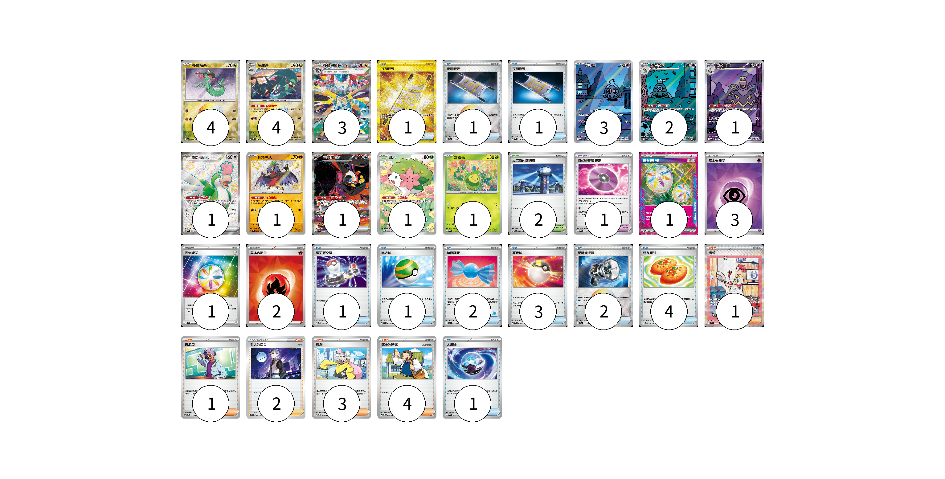 牌組構築方案 以此牌組為基礎新構築牌組 顯示卡面 顯示列表 寶可夢卡(22) 4 4 3 3 2 1 1 1 1 1 1 寶可夢道具(4) 1 3 物品卡(17) 1 1 1 1 1 2 3 2 4 1 支援者卡(8) 1 1 2 4 競技場卡(2) 2 能量卡(7) 1 3 1 2 寶可夢卡(22) 卡牌名稱 張數 卡牌名稱 張數 多龍梅西亞 SV8a 118/187 04 多龍奇 SV8a 119/187 04 多龍巴魯托ex SV8a 221/187 03 夜巡靈 SV6a 068/064 03 彷徨夜靈 SV6a 069/064 02 黑夜魔靈 SV6a 070/064 01 怒鸚哥ex SV4a 337/190 01 摔角鷹人 SV4a 282/190 01 吉雉雞ex SV6a 089/064 01 謝米 SV9a 066/063 01 含羞苞 SV8a 001/187 01 寶可夢道具(4) 卡牌名稱 張數 卡牌名稱 張數 招式學習器 衰退 SV8a 161/187 01 奇樹 SVTL 018/021 03 物品卡(17) 卡牌名稱 張數 卡牌名稱 張數 夜間擔架 SV8 137/106 01 夜間擔架 SV8a 151/187 01 夜間擔架 SV8a 151/187 01 寶可夢交替 SVOD 014/020 01 巢穴球 SVTH 010/018 01 神奇糖果 SVI 053/066 02 高級球 SVOM 013/021 03 反擊捕捉器 SV8a 139/187 02 好友寶芬 SVOD 011/020 04 太晶珠 SV8a 145/187 01 支援者卡(8) 卡牌名稱 張數 卡牌名稱 張數 赤松 SV8a 227/187 01 吉尼亞 SVD 129/139 01 老大的指令(赤日) SVB 024/028 02 博士的研究 SVOD 017/020 04 競技場卡(2) 卡牌名稱 張數 卡牌名稱 張數 火箭隊的監視塔 SV10 096/098 02 能量卡(7) 卡牌名稱 張數 卡牌名稱 張數 新衝天能量 SV5K 071/071 01 基本【超】能量 SVOD PSY 03 夜光能量 SVK 042/042 01 基本【火】能量 SVK FIR 02 以此牌組為基礎新構築牌組 牌組編碼 QAKQiC-CedwFR-WFnAaw copy 列印牌組單 牌組編碼已複製 分享至SNS
