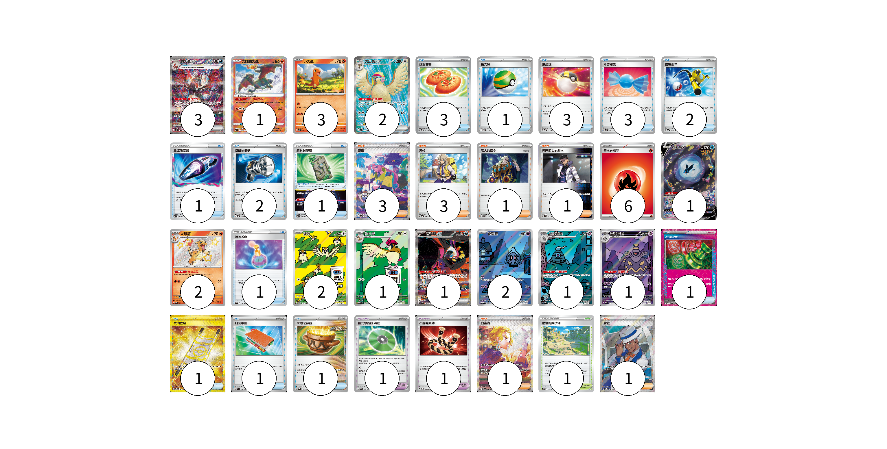牌組構築方案 以此牌組為基礎新構築牌組 顯示卡面 顯示列表 寶可夢卡(20) 3 1 3 2 1 2 2 1 1 2 1 1 寶可夢道具(2) 1 1 物品卡(21) 3 1 3 3 2 1 2 1 1 1 1 1 1 支援者卡(10) 3 3 1 1 1 1 競技場卡(1) 1 能量卡(6) 6 寶可夢卡(20) 卡牌名稱 張數 卡牌名稱 張數 噴火龍ex SV4a 349/190 03 光輝噴火龍 SVF 001/038 01 小火龍 SV4a 025/190 03 大比鳥ex SV3 128/108 02 霓虹魚V S12a 216/172 01 火恐龍 SV4a 211/190 02 波波 SV3 118/108 02 比比鳥 SV3 119/108 01 吉雉雞ex SV6a 089/064 01 夜巡靈 SV6a 068/064 02 彷徨夜靈 SV6a 069/064 01 黑夜魔靈 SV6a 070/064 01 寶可夢道具(2) 卡牌名稱 張數 卡牌名稱 張數 招式學習器 演進 SV8a 160/187 01 不服輸頭帶 SVTL 016/021 01 物品卡(21) 卡牌名稱 張數 卡牌名稱 張數 好友寶芬 SV5K 063/071 03 巢穴球 SVHK 012/022 01 高級球 SVHK 013/022 03 神奇糖果 SV4a 163/190 03 厲害釣竿 SV4a 158/190 02 放逐吸塵器 SVF 023/038 01 反擊捕捉器 SV4M 059/066 02 森林封印石 SVF 024/038 01 消除香水 SVF 011/038 01 不公印章 SV5a 053/066 01 夜間擔架 SV8 137/106 01 朋友手冊 SVK 014/042 01 大地之容器 SV8a 143/187 01 支援者卡(10) 卡牌名稱 張數 卡牌名稱 張數 奇樹 SV4a 350/190 03 派帕 SV4a 180/190 03 老大的指令(魁奇思) SVD 138/139 01 弗圖博士的劇本 SVHM 021/022 01 白蕾雅 SV7 132/102 01 席藍 SV8 127/106 01 競技場卡(1) 卡牌名稱 張數 卡牌名稱 張數 崩塌的競技場 S12a 167/172 01 能量卡(6) 卡牌名稱 張數 卡牌名稱 張數 基本火能量 sv-p FIR 06 以此牌組為基礎新構築牌組 牌組編碼 QAZdXD-LZOmvI-hRYlFc copy 列印牌組單 牌組編碼已複製 分享至SNS