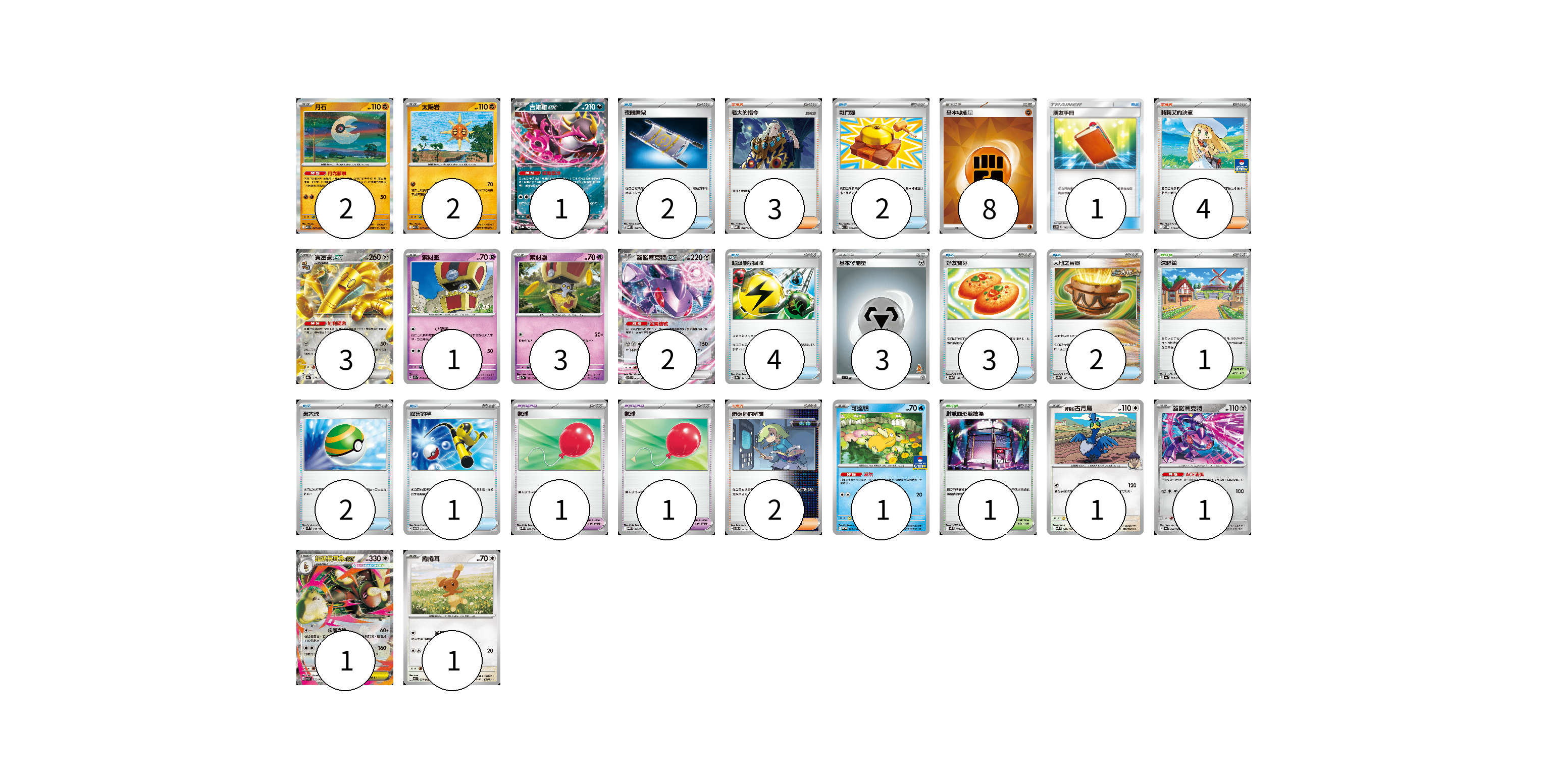 牌組構築方案 以此牌組為基礎新構築牌組 顯示卡面 顯示列表 寶可夢卡(19) 2 2 1 3 1 3 2 1 1 1 1 1 寶可夢道具(2) 1 1 物品卡(17) 2 2 1 4 3 2 2 1 支援者卡(9) 3 4 2 競技場卡(2) 1 1 能量卡(11) 8 3 寶可夢卡(19) 卡牌名稱 張數 卡牌名稱 張數 月石 M1L 026/063 02 太陽岩 M1L 027/063 02 吉雉雞ex SV8a 104/187 01 賽富豪ex SV8a 117/187 03 索財靈 SV7a 024/064 01 索財靈 SV3a 021/062 03 蓋諾賽克特ex SV11B 069/086 02 可達鴨 SV-P 220/SV-P 01 赫普的古月鳥 SV9 087/100 01 蓋諾賽克特 SV6a 040/064 01 超級長耳兔ex M2 072/080 01 捲捲耳 M2 071/080 01 寶可夢道具(2) 卡牌名稱 張數 卡牌名稱 張數 氣球 SV11B 082/086 01 氣球 MBG 019/022 01 物品卡(17) 卡牌名稱 張數 卡牌名稱 張數 夜間擔架 MBD 016/022 02 戰鬥鑼 M1L 059/063 02 朋友手冊 AC2D 145/176 01 超級能量回收 SV8a 141/187 04 好友寶芬 SV8a 147/187 03 大地之容器 SV8a 143/187 02 巢穴球 SVM 133/175 02 厲害釣竿 SVTM 010/022 01 支援者卡(9) 卡牌名稱 張數 卡牌名稱 張數 老大的指令 MBD 020/022 03 莉莉艾的決意 M-P 018/M-P 04 暗碼迷的解讀 SV5M 067/071 02 競技場卡(2) 卡牌名稱 張數 卡牌名稱 張數 深缽鎮 SV4a 185/190 01 對戰圓形競技場 M2 079/080 01 能量卡(11) 卡牌名稱 張數 卡牌名稱 張數 基本【鬥】能量 SVK FIG 08 基本【鋼】能量 SVI MET 03 以此牌組為基礎新構築牌組 牌組編碼 QCPbqt-bhEigV-HmOwGN copy 列印牌組單 牌組編碼已複製 分享至SNS