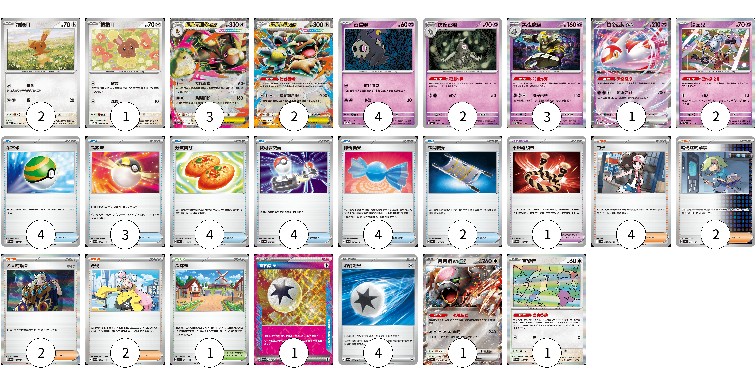 牌組構築方案 以此牌組為基礎新構築牌組 顯示卡面 顯示列表 寶可夢卡(22) 2 1 3 2 4 2 3 1 2 1 1 寶可夢道具(1) 1 物品卡(21) 4 3 4 4 4 2 支援者卡(10) 4 2 2 2 競技場卡(1) 1 能量卡(5) 1 4 寶可夢卡(22) 卡牌名稱 張數 卡牌名稱 張數 捲捲耳 M2 071/080 02 捲捲耳 M1S 053/063 01 超級長耳兔ex M2 072/080 03 超級袋獸ex M1S 051/063 02 夜巡靈 SV8a 064/187 04 彷徨夜靈 SV8a 065/187 02 黑夜魔靈 SV8a 066/187 03 拉帝亞斯ex SV7a 019/064 01 鑰圈兒 SV4a 087/190 02 月月熊 赫月 ex SV5a 052/066 01 百變怪 SV4a 144/190 01 寶可夢道具(1) 卡牌名稱 張數 卡牌名稱 張數 不服輸頭帶 SV4a 168/190 01 物品卡(21) 卡牌名稱 張數 卡牌名稱 張數 巢穴球 SV4a 159/190 04 高級球 SV4a 161/190 03 好友寶芬 SVOD 011/020 04 寶可夢交替 SVOD 014/020 04 神奇糖果 SVOD 013/020 04 夜間擔架 SVOM 016/021 02 支援者卡(10) 卡牌名稱 張數 卡牌名稱 張數 鬥子 SV11W 085/086 04 暗碼迷的解讀 SV8a 165/187 02 老大的指令 SV4a 181/190 02 奇樹 SV4a 174/190 02 競技場卡(1) 卡牌名稱 張數 卡牌名稱 張數 深缽鎮 SV4a 185/190 01 能量卡(5) 卡牌名稱 張數 卡牌名稱 張數 富裕能量 SV7a 064/064 01 噴射能量 SV8a 185/187 04 以此牌組為基礎新構築牌組 牌組編碼 QJbpKk-kqWKDZ-UzdQwf copy 列印牌組單 牌組編碼已複製 分享至SNS
