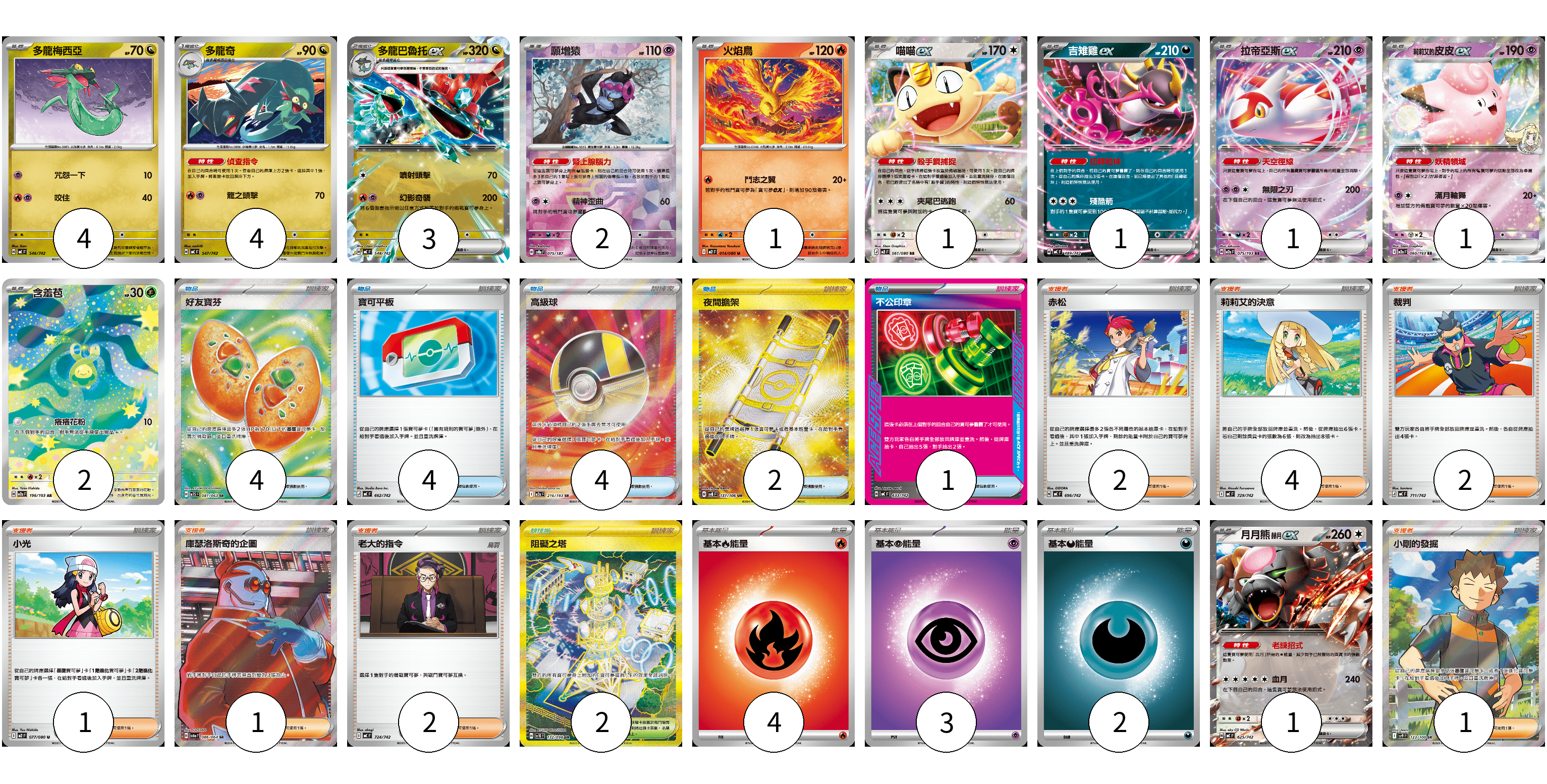 牌組構築方案 以此牌組為基礎新構築牌組 顯示卡面 顯示列表 寶可夢卡(21) 4 4 3 2 1 1 1 1 1 2 1 物品卡(15) 4 4 4 2 1 支援者卡(13) 2 4 2 1 1 2 1 競技場卡(2) 2 能量卡(9) 4 3 2 寶可夢卡(21) 卡牌名稱 張數 卡牌名稱 張數 多龍梅西亞 MC 546/742 04 多龍奇 MC 547/742 04 多龍巴魯托ex MC 548/742 03 願增猿 SV8a 075/187 02 火焰鳥 M2 014/080 01 喵喵ex M3 061/080 01 吉雉雞ex MC 489/742 01 拉帝亞斯ex M2a 075/193 01 莉莉艾的皮皮ex M2a 060/193 01 含羞苞 M2a 196/193 02 月月熊 赫月 ex MC 625/742 01 物品卡(15) 卡牌名稱 張數 卡牌名稱 張數 好友寶芬 M1S 081/063 04 寶可平板 MC 662/742 04 高級球 M2a 216/193 04 夜間擔架 SV8 137/106 02 不公印章 MC 633/742 01 支援者卡(13) 卡牌名稱 張數 卡牌名稱 張數 赤松 MC 696/742 02 莉莉艾的決意 MC 729/742 04 裁判 MC 711/742 02 小光 M2 077/080 01 庫瑟洛斯奇的企圖 SV6a 086/064 01 老大的指令 MC 724/742 02 小剛的發掘 SV9 123/100 01 競技場卡(2) 卡牌名稱 張數 卡牌名稱 張數 阻礙之塔 SV10 132/098 02 能量卡(9) 卡牌名稱 張數 卡牌名稱 張數 基本【火】能量 MC FIR 04 基本【超】能量 MC PSY 03 基本【惡】能量 MC DAR 02 以此牌組為基礎新構築牌組 牌組編碼 QJwgxd-YdXbxq-woLOIM copy 列印牌組單 牌組編碼已複製 分享至SNS