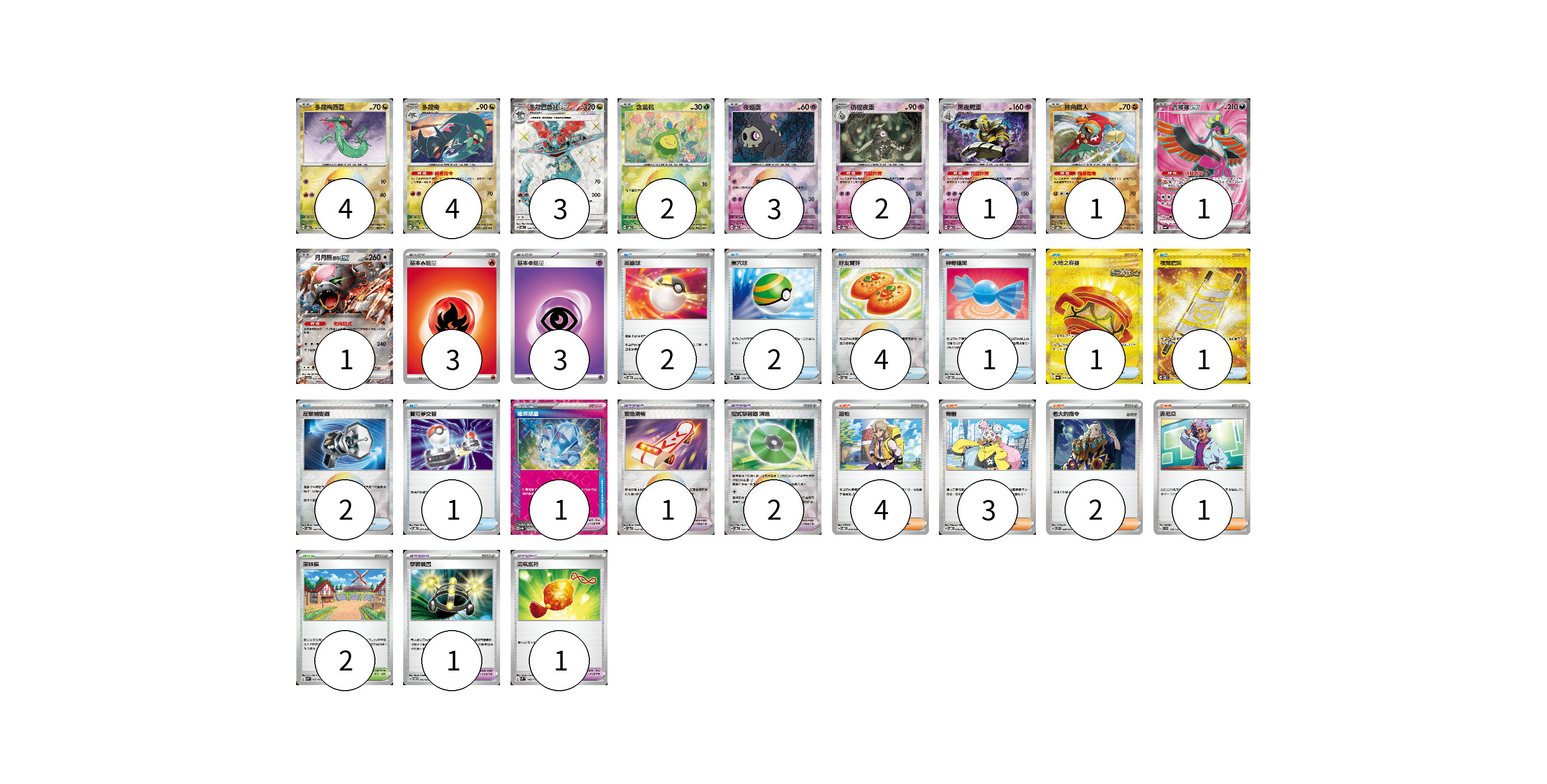 牌組構築方案 以此牌組為基礎新構築牌組 顯示卡面 顯示列表 寶可夢卡(22) 4 4 3 2 3 2 1 1 1 1 寶可夢道具(6) 1 1 2 1 1 物品卡(14) 2 2 4 1 1 1 2 1 支援者卡(10) 4 3 2 1 競技場卡(2) 2 能量卡(6) 3 3 寶可夢卡(22) 卡牌名稱 張數 卡牌名稱 張數 多龍梅西亞 SV8a 118/187 04 多龍奇 SV8a 119/187 04 多龍巴魯托ex SV6 120/101 03 含羞苞 SV8a 001/187 02 夜巡靈 SV8a 064/187 03 彷徨夜靈 SV8a 065/187 02 黑夜魔靈 SV8a 066/187 01 摔角鷹人 SV8a 084/187 01 吉雉雞ex SV6a 081/064 01 月月熊 赫月 ex SV5a 052/066 01 寶可夢道具(6) 卡牌名稱 張數 卡牌名稱 張數 璀璨結晶 SV8a 152/187 01 緊急滑板 SV8a 153/187 01 招式學習器 演進 SV8a 160/187 02 學習裝置 SVTM 016/022 01 勇氣護符 SVM 142/175 01 物品卡(14) 卡牌名稱 張數 卡牌名稱 張數 高級球 SVOD 012/020 02 巢穴球 SVM 133/175 02 好友寶芬 SV8a 147/187 04 神奇糖果 SVOD 013/020 01 大地之容器 SV6a 093/064 01 夜間擔架 SV8 137/106 01 反擊捕捉器 SV8a 139/187 02 寶可夢交替 SVOD 014/020 01 支援者卡(10) 卡牌名稱 張數 卡牌名稱 張數 派帕 SVOD 018/020 04 奇樹 SVOD 016/020 03 老大的指令 SVTS 020/022 02 吉尼亞 SVD 129/139 01 競技場卡(2) 卡牌名稱 張數 卡牌名稱 張數 深缽鎮 SVK 039/042 02 能量卡(6) 卡牌名稱 張數 卡牌名稱 張數 基本火能量 sv-p FIR 03 基本超能量 sv-p PSY 03 以此牌組為基礎新構築牌組 牌組編碼 QOTrMS-BFknYM-aHkGfk copy 列印牌組單 牌組編碼已複製 分享至SNS
