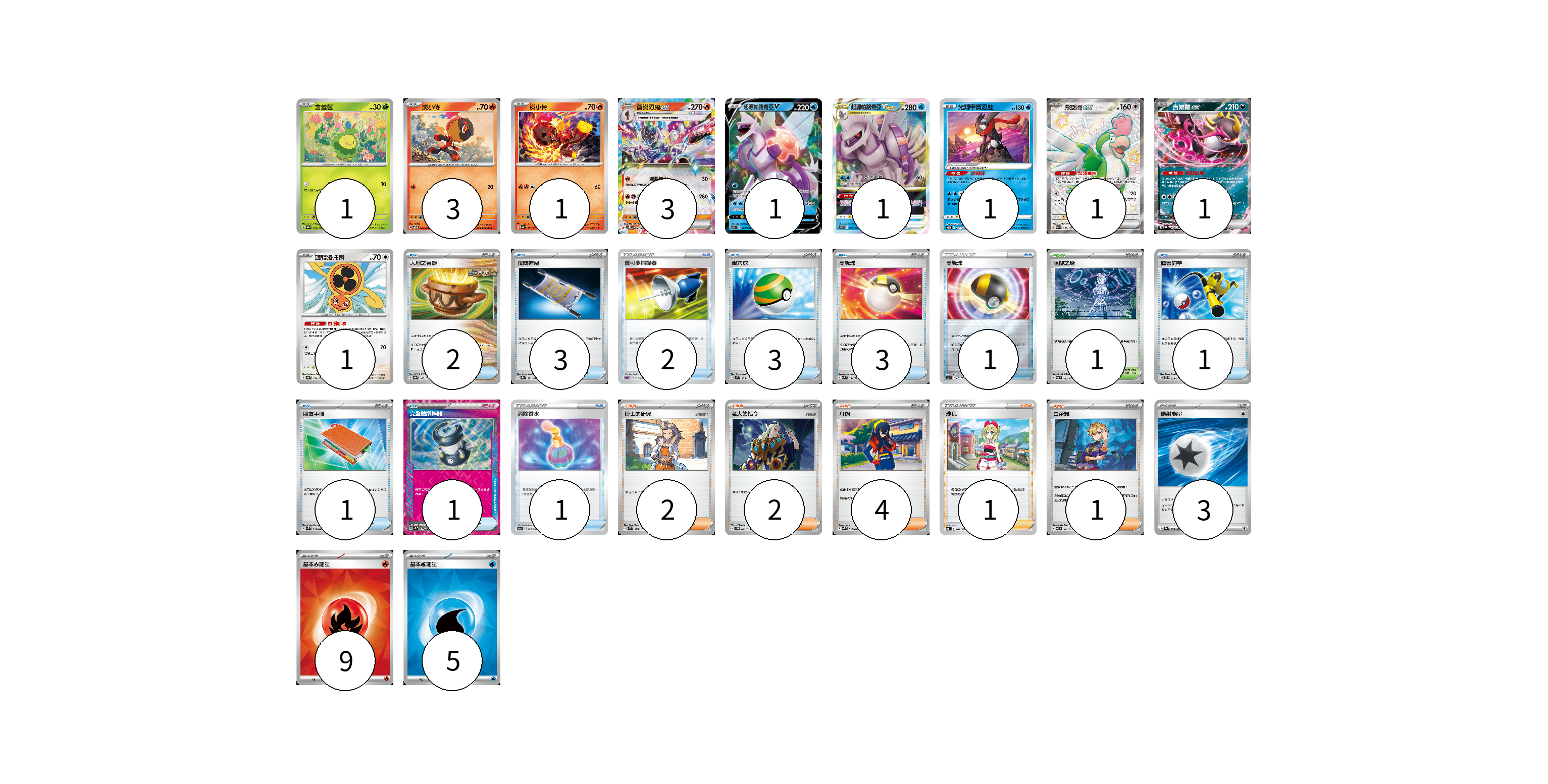 牌組構築方案 以此牌組為基礎新構築牌組 顯示卡面 顯示列表 寶可夢卡(14) 1 3 1 3 1 1 1 1 1 1 物品卡(18) 2 3 2 3 3 1 1 1 1 1 支援者卡(10) 2 2 4 1 1 競技場卡(1) 1 能量卡(17) 3 9 5 寶可夢卡(14) 卡牌名稱 張數 卡牌名稱 張數 含羞苞 SV8a 001/187 01 炭小侍 SVPS 005/008 03 炭小侍 SV4a 033/190 01 蒼炎刃鬼ex SVPS 006/008 03 起源帕路奇亞V S10P 022/067 01 起源帕路奇亞VSTAR S10P 023/067 01 光輝甲賀忍蛙 SVTS 001/022 01 怒鸚哥ex SV4a 337/190 01 吉雉雞ex SV8a 104/187 01 旋轉洛托姆 SV8a 131/187 01 物品卡(18) 卡牌名稱 張數 卡牌名稱 張數 大地之容器 SV8a 143/187 02 夜間擔架 SV8a 151/187 03 寶可夢捕捉器 SDM 017/022 02 巢穴球 SVM 133/175 03 高級球 SVM 134/175 03 高級球 SO 020/030 01 厲害釣竿 SVTG 009/019 01 朋友手冊 SVK 014/042 01 完全體攪拌器 SVK 017/042 01 消除香水 S9a 063/067 01 支援者卡(10) 卡牌名稱 張數 卡牌名稱 張數 博士的研究 SVM 170/175 02 老大的指令 SVF 032/038 02 丹瑜 SVK 030/042 04 珠貝 SVB 017/028 01 白蕾雅 SV7 100/102 01 競技場卡(1) 卡牌名稱 張數 卡牌名稱 張數 阻礙之塔 SV6 100/101 01 能量卡(17) 卡牌名稱 張數 卡牌名稱 張數 噴射能量 SV8a 185/187 03 基本【火】能量 SVK FIR 09 基本【水】能量 SVK WAT 05 以此牌組為基礎新構築牌組 牌組編碼 QOqmtg-ZazpUq-HcVzYC copy 列印牌組單 牌組編碼已複製 分享至SNS