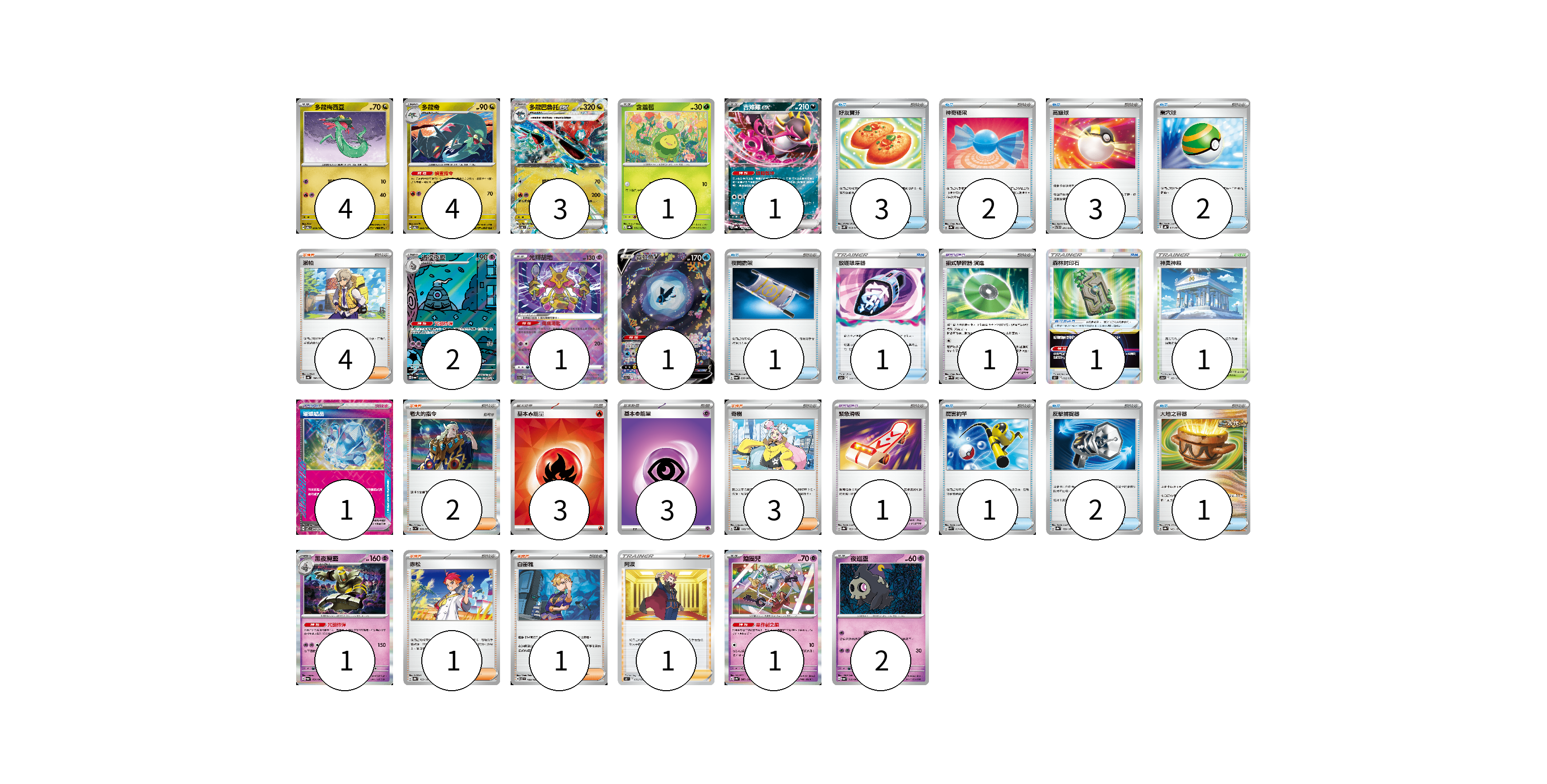 牌組構築方案 以此牌組為基礎新構築牌組 顯示卡面 顯示列表 寶可夢卡(21) 4 4 3 1 1 2 1 1 1 1 2 寶可夢道具(4) 1 1 1 1 物品卡(16) 3 2 3 2 1 1 1 2 1 支援者卡(12) 4 2 3 1 1 1 競技場卡(1) 1 能量卡(6) 3 3 寶可夢卡(21) 卡牌名稱 張數 卡牌名稱 張數 多龍梅西亞 SV6 079/101 04 多龍奇 SV6 080/101 04 多龍巴魯托ex SV6 081/101 03 含羞苞 SV8a 001/187 01 吉雉雞ex SV8a 104/187 01 彷徨夜靈 SV6a 069/064 02 光輝胡地 S11a 031/068 01 霓虹魚V S12a 216/172 01 黑夜魔靈 SV6a 020/064 01 鑰圈兒 SV4a 087/190 01 夜巡靈 SV6a 018/064 02 寶可夢道具(4) 卡牌名稱 張數 卡牌名稱 張數 招式學習器 演進 SV4M 063/066 01 森林封印石 S12 092/098 01 璀璨結晶 SV7 094/102 01 緊急滑板 SV8a 153/187 01 物品卡(16) 卡牌名稱 張數 卡牌名稱 張數 好友寶芬 SV5K 063/071 03 神奇糖果 SV3a 053/062 02 高級球 SVTH 011/018 03 巢穴球 SVHK 012/022 02 夜間擔架 SV6a 056/064 01 放逐吸塵器 S12a 144/172 01 厲害釣竿 SVK 011/042 01 反擊捕捉器 SV8a 139/187 02 大地之容器 SV8a 143/187 01 支援者卡(12) 卡牌名稱 張數 卡牌名稱 張數 派帕 SV4a 180/190 04 老大的指令 SV1a 069/073 02 奇樹 SVM 160/175 03 赤松 SV8a 163/187 01 白蕾雅 SV7 100/102 01 阿渡 S12 096/098 01 競技場卡(1) 卡牌名稱 張數 卡牌名稱 張數 神奧神殿 S12a 169/172 01 能量卡(6) 卡牌名稱 張數 卡牌名稱 張數 基本【火】能量 SVM FIR 03 基本【超】能量 SVAW PSY 03 以此牌組為基礎新構築牌組 牌組編碼 QQssub-KDKysN-TeejgN copy 列印牌組單 牌組編碼已複製 分享至SNS
