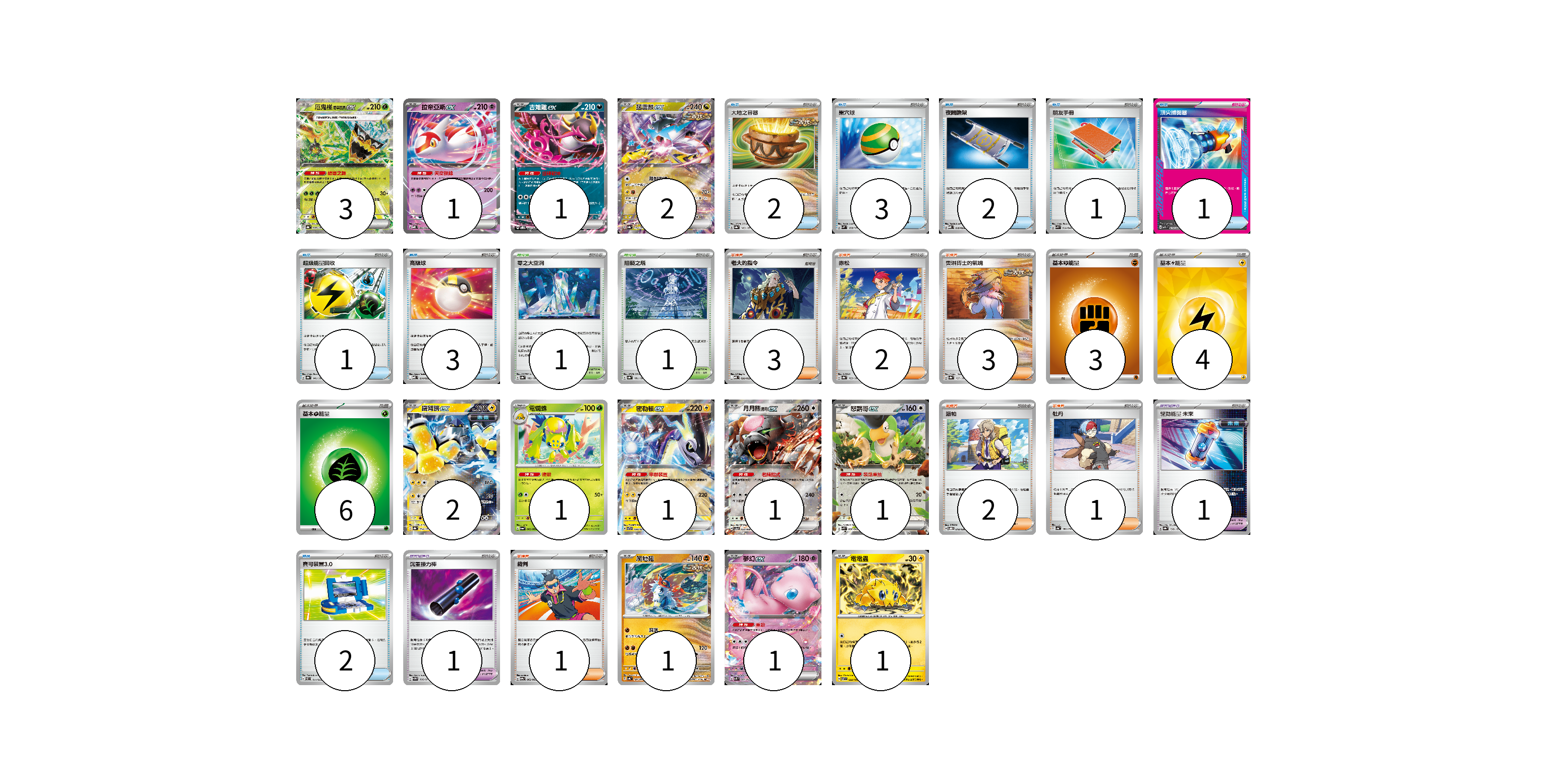 牌組構築方案 以此牌組為基礎新構築牌組 顯示卡面 顯示列表 寶可夢卡(16) 3 1 1 2 2 1 1 1 1 1 1 1 寶可夢道具(2) 1 1 物品卡(15) 2 3 2 1 1 1 3 2 支援者卡(12) 3 2 3 2 1 1 競技場卡(2) 1 1 能量卡(13) 3 4 6 寶可夢卡(16) 卡牌名稱 張數 卡牌名稱 張數 厄鬼椪 碧草面具ex SV8a 020/187 03 拉帝亞斯ex MBD 003/022 01 吉雉雞ex SVOD 004/020 01 猛雷鼓ex SV8a 124/187 02 鐵臂膀ex SV8a 054/187 02 電蜘蛛 SV6a 002/064 01 密勒頓ex SVTR 008/021 01 月月熊 赫月 ex SV5a 052/066 01 怒鸚哥ex SVK 006/042 01 爬地翅 SV4K 041/066 01 夢幻ex SVK 001/042 01 電電蟲 SV7 032/102 01 寶可夢道具(2) 卡牌名稱 張數 卡牌名稱 張數 驅勁能量 未來 SV8a 158/187 01 沉重接力棒 SV5M 066/071 01 物品卡(15) 卡牌名稱 張數 卡牌名稱 張數 大地之容器 SV8a 143/187 02 巢穴球 SVM 133/175 03 夜間擔架 MBD 016/022 02 朋友手冊 SVK 014/042 01 頂尖捕捉器 MBG 014/022 01 超級能量回收 SV8a 141/187 01 高級球 MBD 014/022 03 寶可裝置3.0 SVEL 014/020 02 支援者卡(12) 卡牌名稱 張數 卡牌名稱 張數 老大的指令 MBD 020/022 03 赤松 SV8a 163/187 02 奧琳博士的氣魄 SV8a 167/187 03 派帕 SVOD 018/020 02 牡丹 SV4a 182/190 01 裁判 SV9a 062/063 01 競技場卡(2) 卡牌名稱 張數 卡牌名稱 張數 零之大空洞 SV8a 182/187 01 阻礙之塔 SV8a 181/187 01 能量卡(13) 卡牌名稱 張數 卡牌名稱 張數 基本【鬥】能量 M-P FIG 03 基本【雷】能量 SVQP LIG 04 基本【草】能量 M-P GRA 06 以此牌組為基礎新構築牌組 牌組編碼 QRnJCJ-igwXLW-eClAhg copy 列印牌組單 牌組編碼已複製 分享至SNS