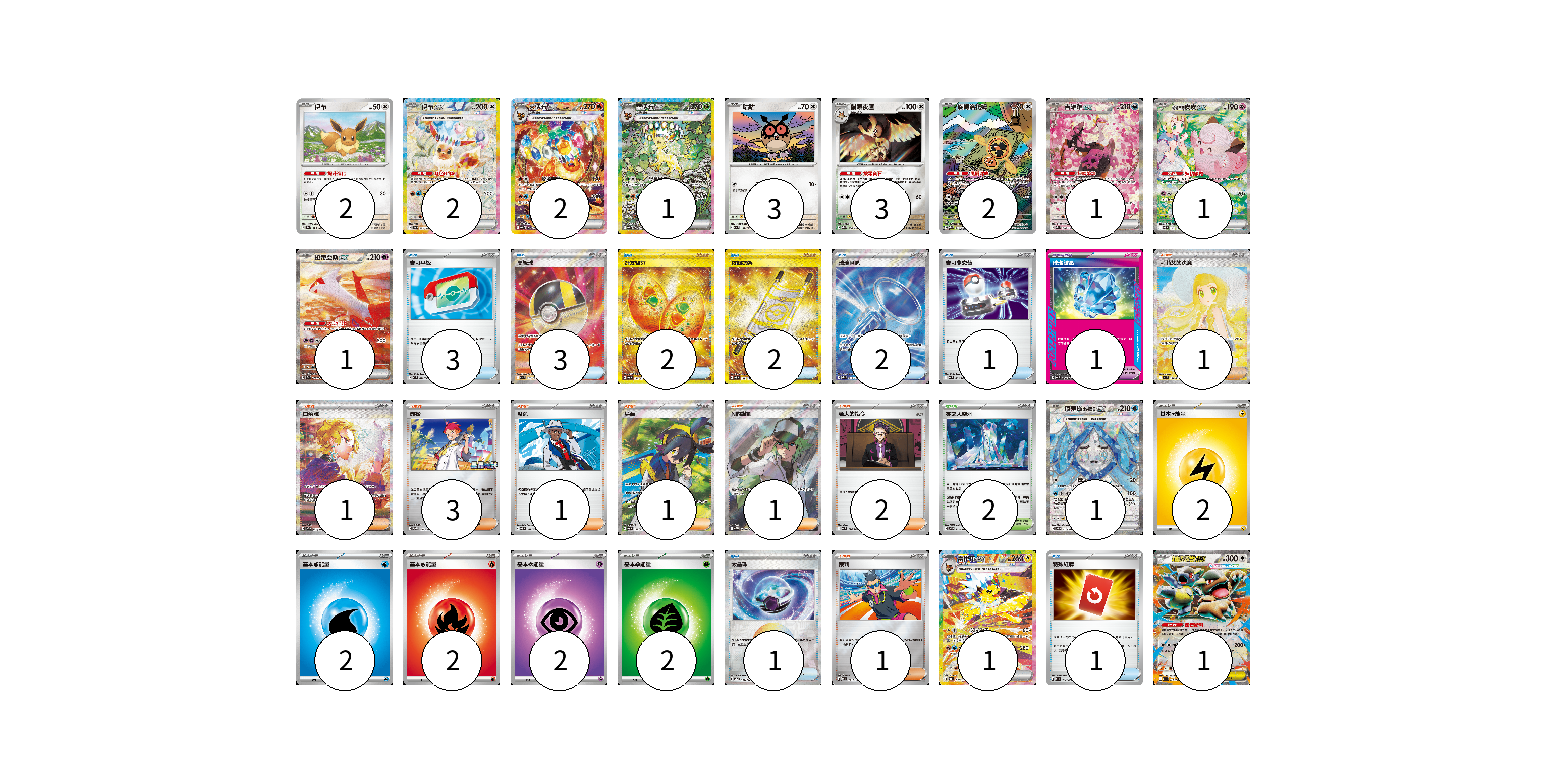 牌組構築方案 以此牌組為基礎新構築牌組 顯示卡面 顯示列表 寶可夢卡(21) 2 2 2 1 3 3 2 1 1 1 1 1 1 寶可夢道具(1) 1 物品卡(15) 3 3 2 2 2 1 1 1 支援者卡(11) 1 1 3 1 1 1 2 1 競技場卡(2) 2 能量卡(10) 2 2 2 2 2 寶可夢卡(21) 卡牌名稱 張數 卡牌名稱 張數 伊布 SV8a 125/187 02 伊布ex SV8a 223/187 02 火伊布ex SV8a 202/187 02 葉伊布ex SV8a 200/187 01 咕咕 M2a 137/193 03 貓頭夜鷹 M2a 138/193 03 旋轉洛托姆 M2a 213/193 02 吉雉雞ex M2a 244/193 01 莉莉艾的皮皮ex SV9 126/100 01 拉帝亞斯ex SV7a 087/064 01 厄鬼椪 水井面具ex SV6 117/101 01 雷伊布ex SV8a 209/187 01 超級袋獸ex M1S 051/063 01 寶可夢道具(1) 卡牌名稱 張數 卡牌名稱 張數 璀璨結晶 MC 680/742 01 物品卡(15) 卡牌名稱 張數 卡牌名稱 張數 寶可平板 M3 070/080 03 高級球 M2a 216/193 03 好友寶芬 SV6 133/101 02 夜間擔架 SV8 137/106 02 玻璃喇叭 M2a 215/193 02 寶可夢交替 MC 663/742 01 太晶珠 SV8a 145/187 01 特殊紅牌 M4 072/083 01 支援者卡(11) 卡牌名稱 張數 卡牌名稱 張數 莉莉艾的決意 M1L 091/063 01 白蕾雅 SV7 132/102 01 赤松 SV-P 150/SV-P 03 席藍 SV8 102/106 01 烏栗 SV6 122/101 01 N的謀劃 SV11B 165/086 01 老大的指令 MC 724/742 02 裁判 MC 711/742 01 競技場卡(2) 卡牌名稱 張數 卡牌名稱 張數 零之大空洞 SV7 102/102 02 能量卡(10) 卡牌名稱 張數 卡牌名稱 張數 基本【雷】能量 MC LIG 02 基本【水】能量 MC WAT 02 基本【火】能量 MC FIR 02 基本【超】能量 MC PSY 02 基本【草】能量 MC GRA 02 以此牌組為基礎新構築牌組 牌組編碼 QSORQX-QeQrAL-pmBSPV copy 列印牌組單 牌組編碼已複製 分享至SNS