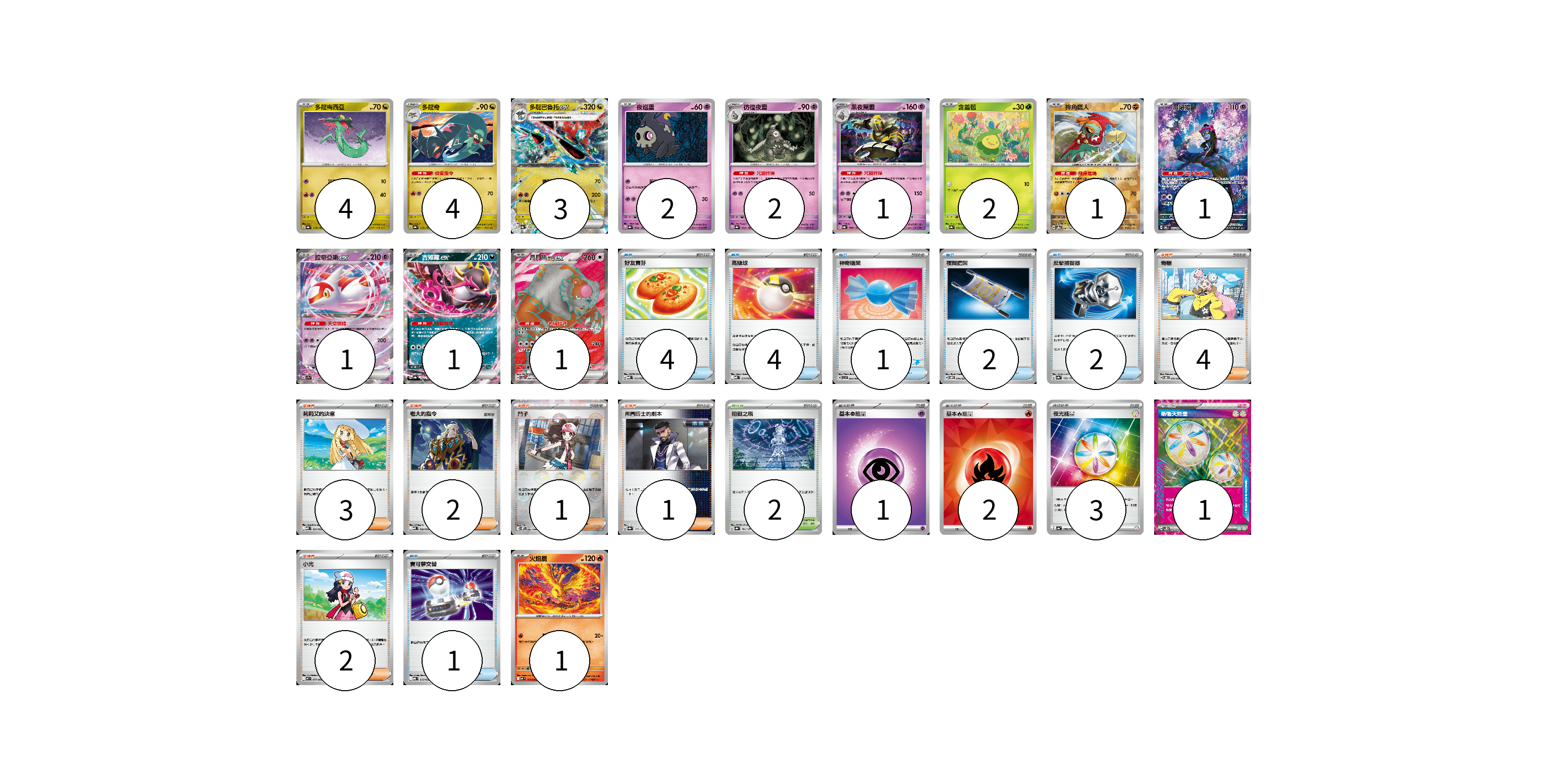 牌組構築方案 以此牌組為基礎新構築牌組 顯示卡面 顯示列表 寶可夢卡(24) 4 4 3 2 2 1 2 1 1 1 1 1 1 物品卡(14) 4 4 1 2 2 1 支援者卡(13) 4 3 2 1 1 2 競技場卡(2) 2 能量卡(7) 1 2 3 1 寶可夢卡(24) 卡牌名稱 張數 卡牌名稱 張數 多龍梅西亞 SV8a 118/187 04 多龍奇 SV8a 119/187 04 多龍巴魯托ex SV8a 120/187 03 夜巡靈 SV8a 064/187 02 彷徨夜靈 SV8a 065/187 02 黑夜魔靈 SV8a 066/187 01 含羞苞 SV8a 001/187 02 摔角鷹人 SV8a 084/187 01 願增猿 SV6 107/101 01 拉帝亞斯ex SV7a 019/064 01 吉雉雞ex SV8a 104/187 01 月月熊 赫月 ex SV5a 084/066 01 火焰鳥 M2 014/080 01 物品卡(14) 卡牌名稱 張數 卡牌名稱 張數 好友寶芬 MBD 013/022 04 高級球 MBD 014/022 04 神奇糖果 SVI 053/066 01 夜間擔架 SVOM 016/021 02 反擊捕捉器 SV8a 139/187 02 寶可夢交替 MBG 015/022 01 支援者卡(13) 卡牌名稱 張數 卡牌名稱 張數 奇樹 SVOD 016/020 04 莉莉艾的決意 MBD 021/022 03 老大的指令 MBD 020/022 02 鬥子 SV11W 085/086 01 弗圖博士的劇本 SV8a 175/187 01 小光 M2 077/080 02 競技場卡(2) 卡牌名稱 張數 卡牌名稱 張數 阻礙之塔 SV8a 181/187 02 能量卡(7) 卡牌名稱 張數 卡牌名稱 張數 基本【超】能量 MBD PSY 01 基本【火】能量 SVQL FIR 02 夜光能量 SV4a 190/190 03 新衝天能量 SV5K 071/071 01 以此牌組為基礎新構築牌組 牌組編碼 QTsJHS-wNVAgK-LYhOuI copy 列印牌組單 牌組編碼已複製 分享至SNS
