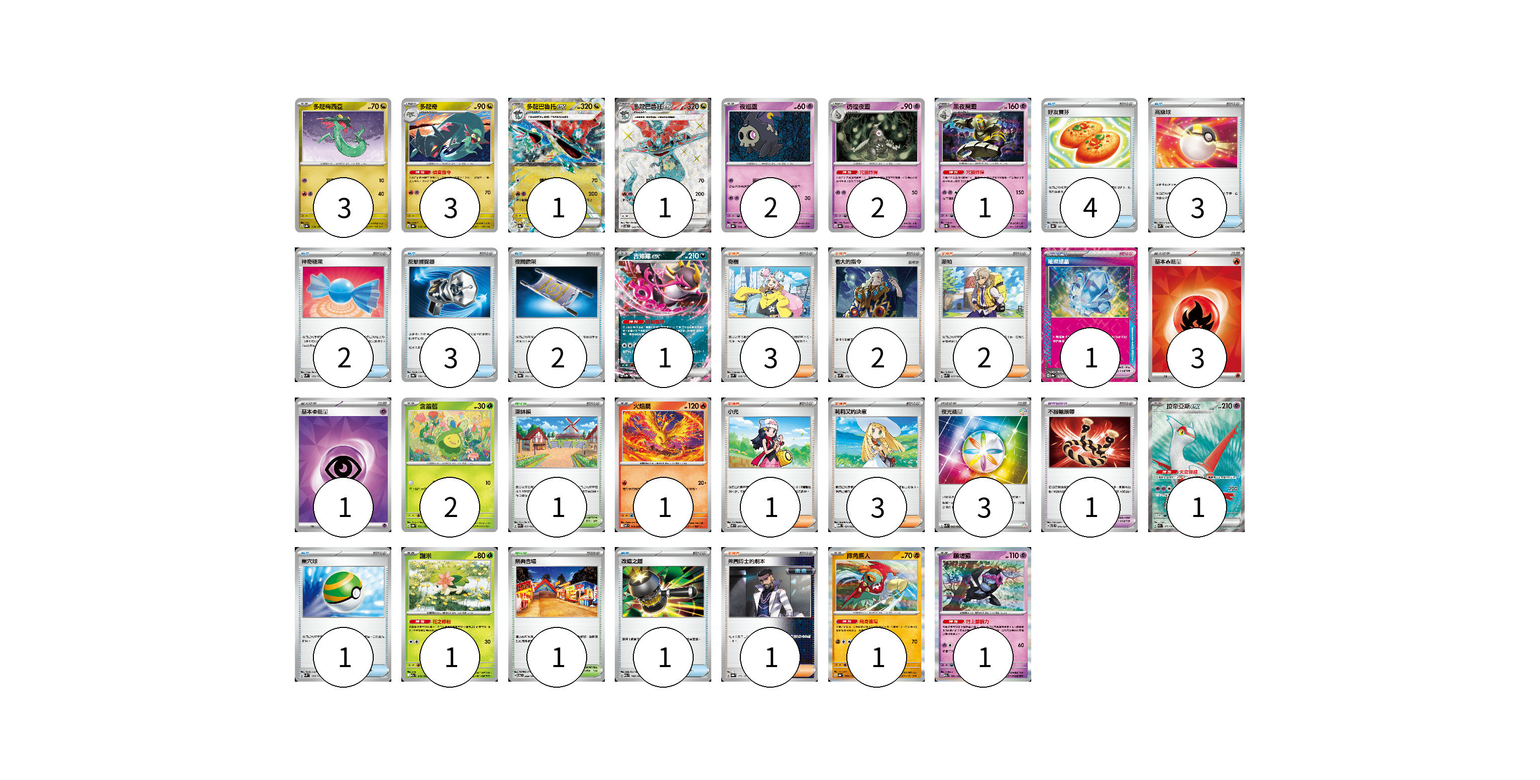牌組構築方案 以此牌組為基礎新構築牌組 顯示卡面 顯示列表 寶可夢卡(21) 3 3 1 1 2 2 1 1 2 1 1 1 1 1 寶可夢道具(2) 1 1 物品卡(16) 4 3 2 3 2 1 1 支援者卡(12) 3 2 2 1 3 1 競技場卡(2) 1 1 能量卡(7) 3 1 3 寶可夢卡(21) 卡牌名稱 張數 卡牌名稱 張數 多龍梅西亞 SV8a 118/187 03 多龍奇 SV8a 119/187 03 多龍巴魯托ex SV8a 120/187 01 多龍巴魯托ex SV6 120/101 01 夜巡靈 SV8a 064/187 02 彷徨夜靈 SV8a 065/187 02 黑夜魔靈 SV8a 066/187 01 吉雉雞ex SV8a 104/187 01 含羞苞 SV8a 001/187 02 火焰鳥 M2 014/080 01 拉帝亞斯ex SV7a 078/064 01 謝米 M2a 012/193 01 摔角鷹人 SV8a 084/187 01 願增猿 M2a 081/193 01 寶可夢道具(2) 卡牌名稱 張數 卡牌名稱 張數 璀璨結晶 SV8a 152/187 01 不服輸頭帶 SVTL 016/021 01 物品卡(16) 卡牌名稱 張數 卡牌名稱 張數 好友寶芬 SV8a 147/187 04 高級球 SVM 134/175 03 神奇糖果 SVM 135/175 02 反擊捕捉器 SV8a 139/187 03 夜間擔架 SV8a 151/187 02 巢穴球 SVM 133/175 01 改造之錘 M2a 148/193 01 支援者卡(12) 卡牌名稱 張數 卡牌名稱 張數 奇樹 SVM 160/175 03 老大的指令 SVM 172/175 02 派帕 SVK 035/042 02 小光 M2 077/080 01 莉莉艾的決意 MBD 021/022 03 弗圖博士的劇本 SV8a 175/187 01 競技場卡(2) 卡牌名稱 張數 卡牌名稱 張數 深缽鎮 SVK 039/042 01 祭典會場 SV6 099/101 01 能量卡(7) 卡牌名稱 張數 卡牌名稱 張數 基本【火】能量 SVK FIR 03 基本【超】能量 SVK PSY 01 夜光能量 SVK 042/042 03 以此牌組為基礎新構築牌組 牌組編碼 QUhYfO-BgOWRB-bFwQUU copy 列印牌組單 牌組編碼已複製 分享至SNS