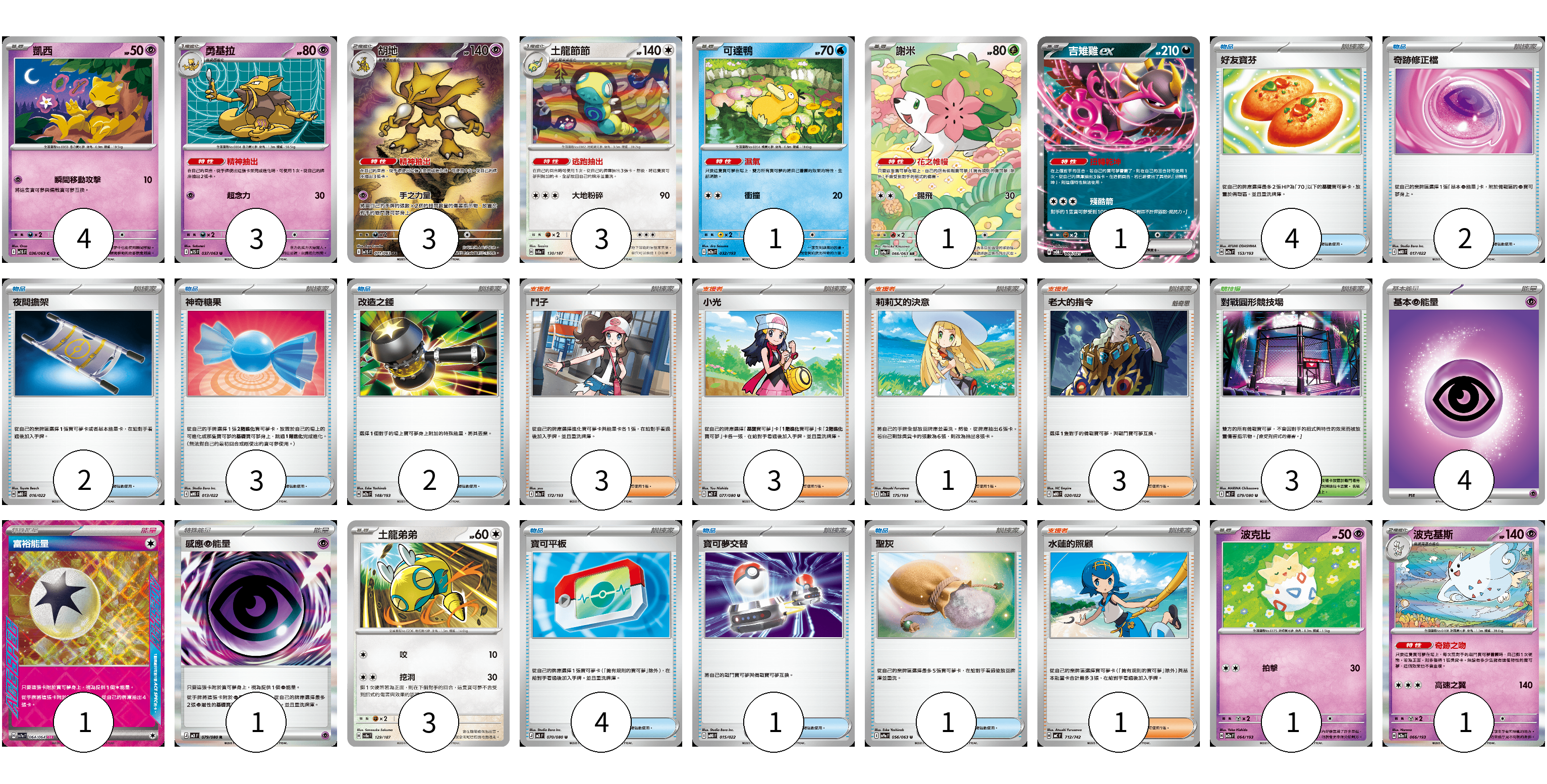 牌組構築方案 以此牌組為基礎新構築牌組 顯示卡面 顯示列表 寶可夢卡(21) 4 3 3 3 1 1 1 3 1 1 物品卡(19) 4 2 2 3 2 4 1 1 支援者卡(11) 3 3 1 3 1 競技場卡(3) 3 能量卡(6) 4 1 1 寶可夢卡(21) 卡牌名稱 張數 卡牌名稱 張數 凱西 M1S 036/063 04 勇基拉 M1S 037/063 03 胡地 M1S 071/063 03 土龍節節 SV8a 130/187 03 可達鴨 M2a 032/193 01 謝米 SV9a 066/063 01 吉雉雞ex SVOM 009/021 01 土龍弟弟 SV8a 129/187 03 波克比 M2a 064/193 01 波克基斯 M2a 066/193 01 物品卡(19) 卡牌名稱 張數 卡牌名稱 張數 好友寶芬 M2a 153/193 04 奇跡修正檔 MBD 017/022 02 夜間擔架 MBD 016/022 02 神奇糖果 MBG 013/022 03 改造之錘 M2a 148/193 02 寶可平板 M3 070/080 04 寶可夢交替 MBG 015/022 01 聖灰 SV9a 056/063 01 支援者卡(11) 卡牌名稱 張數 卡牌名稱 張數 鬥子 M2a 172/193 03 小光 M2 077/080 03 莉莉艾的決意 M2a 175/193 01 老大的指令 MBD 020/022 03 水蓮的照顧 MC 712/742 01 競技場卡(3) 卡牌名稱 張數 卡牌名稱 張數 對戰圓形競技場 M2 079/080 03 能量卡(6) 卡牌名稱 張數 卡牌名稱 張數 基本【超】能量 M-P PSY 04 富裕能量 SV7a 064/064 01 感應【超】能量 M3 079/080 01 以此牌組為基礎新構築牌組 牌組編碼 QXCVXo-xSWiNW-NTcsgy copy 列印牌組單 牌組編碼已複製 分享至SNS