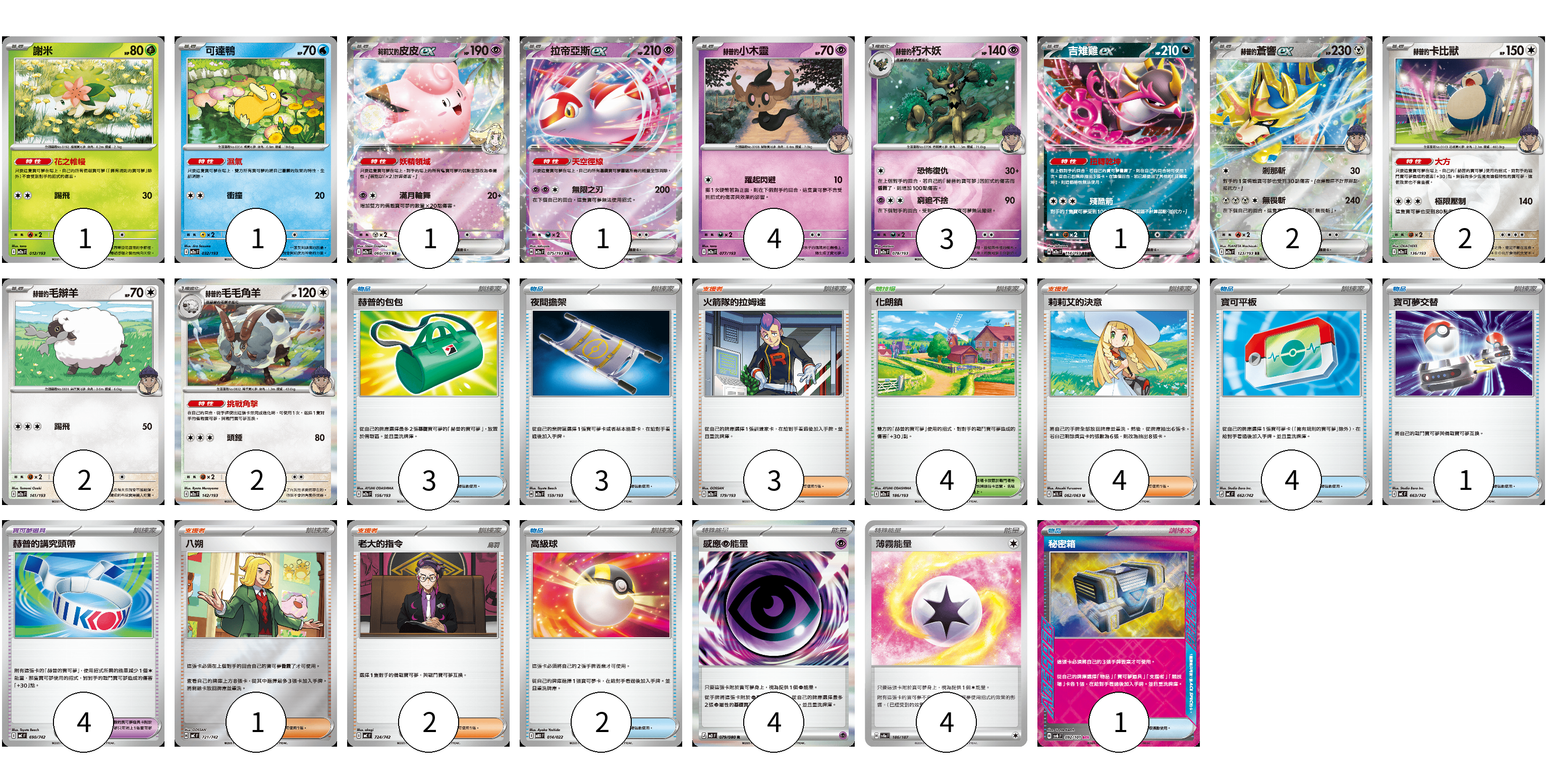 牌組構築方案 以此牌組為基礎新構築牌組 顯示卡面 顯示列表 寶可夢卡(20) 1 1 1 1 4 3 1 2 2 2 2 寶可夢道具(4) 4 物品卡(14) 3 3 4 1 2 1 支援者卡(10) 3 4 1 2 競技場卡(4) 4 能量卡(8) 4 4 寶可夢卡(20) 卡牌名稱 張數 卡牌名稱 張數 謝米 M2a 012/193 01 可達鴨 M2a 032/193 01 莉莉艾的皮皮ex M2a 060/193 01 拉帝亞斯ex M2a 075/193 01 赫普的小木靈 M2a 077/193 04 赫普的朽木妖 M2a 078/193 03 吉雉雞ex M2a 114/193 01 赫普的蒼響ex M2a 123/193 02 赫普的卡比獸 M2a 136/193 02 赫普的毛辮羊 M2a 141/193 02 赫普的毛毛角羊 M2a 142/193 02 寶可夢道具(4) 卡牌名稱 張數 卡牌名稱 張數 赫普的講究頭帶 MC 690/742 04 物品卡(14) 卡牌名稱 張數 卡牌名稱 張數 赫普的包包 M2a 156/193 03 夜間擔架 M2a 159/193 03 寶可平板 MC 662/742 04 寶可夢交替 MC 663/742 01 高級球 MBD 014/022 02 秘密箱 SV6 092/101 01 支援者卡(10) 卡牌名稱 張數 卡牌名稱 張數 火箭隊的拉姆達 M2a 179/193 03 莉莉艾的決意 M1L 062/063 04 八朔 MC 721/742 01 老大的指令 MC 724/742 02 競技場卡(4) 卡牌名稱 張數 卡牌名稱 張數 化朗鎮 M2a 186/193 04 能量卡(8) 卡牌名稱 張數 卡牌名稱 張數 感應【超】能量 M3 079/080 04 薄霧能量 SV8a 186/187 04 以此牌組為基礎新構築牌組 牌組編碼 QYJzXx-ghpRzs-wHInpT copy 列印牌組單 牌組編碼已複製 分享至SNS