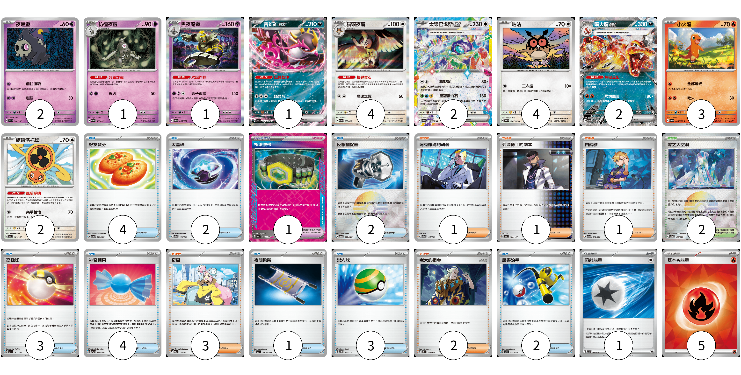 牌組構築方案 以此牌組為基礎新構築牌組 顯示卡面 顯示列表 寶可夢卡(22) 2 1 1 1 4 2 4 2 3 2 寶可夢道具(1) 1 物品卡(21) 4 2 2 3 4 1 3 2 支援者卡(8) 1 1 1 3 2 競技場卡(2) 2 能量卡(6) 1 5 寶可夢卡(22) 卡牌名稱 張數 卡牌名稱 張數 夜巡靈 SV8a 064/187 02 彷徨夜靈 SV8a 065/187 01 黑夜魔靈 SV8a 066/187 01 吉雉雞ex SV8a 104/187 01 貓頭夜鷹 SV8a 128/187 04 太樂巴戈斯ex SV8a 136/187 02 咕咕 SV7 076/102 04 噴火龍ex SV4a 115/190 02 小火龍 SV2a 004/165 03 旋轉洛托姆 SV8a 131/187 02 寶可夢道具(1) 卡牌名稱 張數 卡牌名稱 張數 極限腰帶 SV8a 159/187 01 物品卡(21) 卡牌名稱 張數 卡牌名稱 張數 好友寶芬 SV8a 147/187 04 太晶珠 SV8a 145/187 02 反擊捕捉器 SV8a 139/187 02 高級球 SV4a 161/190 03 神奇糖果 SV4a 163/190 04 夜間擔架 SV6a 056/064 01 巢穴球 SVM 133/175 03 厲害釣竿 SVK 011/042 02 支援者卡(8) 卡牌名稱 張數 卡牌名稱 張數 阿克羅瑪的執著 SV8a 164/187 01 弗圖博士的劇本 SV8a 175/187 01 白蕾雅 SV8a 176/187 01 奇樹 SV4a 174/190 03 老大的指令 SVM 172/175 02 競技場卡(2) 卡牌名稱 張數 卡牌名稱 張數 零之大空洞 SV8a 182/187 02 能量卡(6) 卡牌名稱 張數 卡牌名稱 張數 噴射能量 SVK 040/042 01 基本【火】能量 SVK FIR 05 以此牌組為基礎新構築牌組 牌組編碼 QZRVNy-LoVZoc-eQxrwB copy 列印牌組單 牌組編碼已複製 分享至SNS