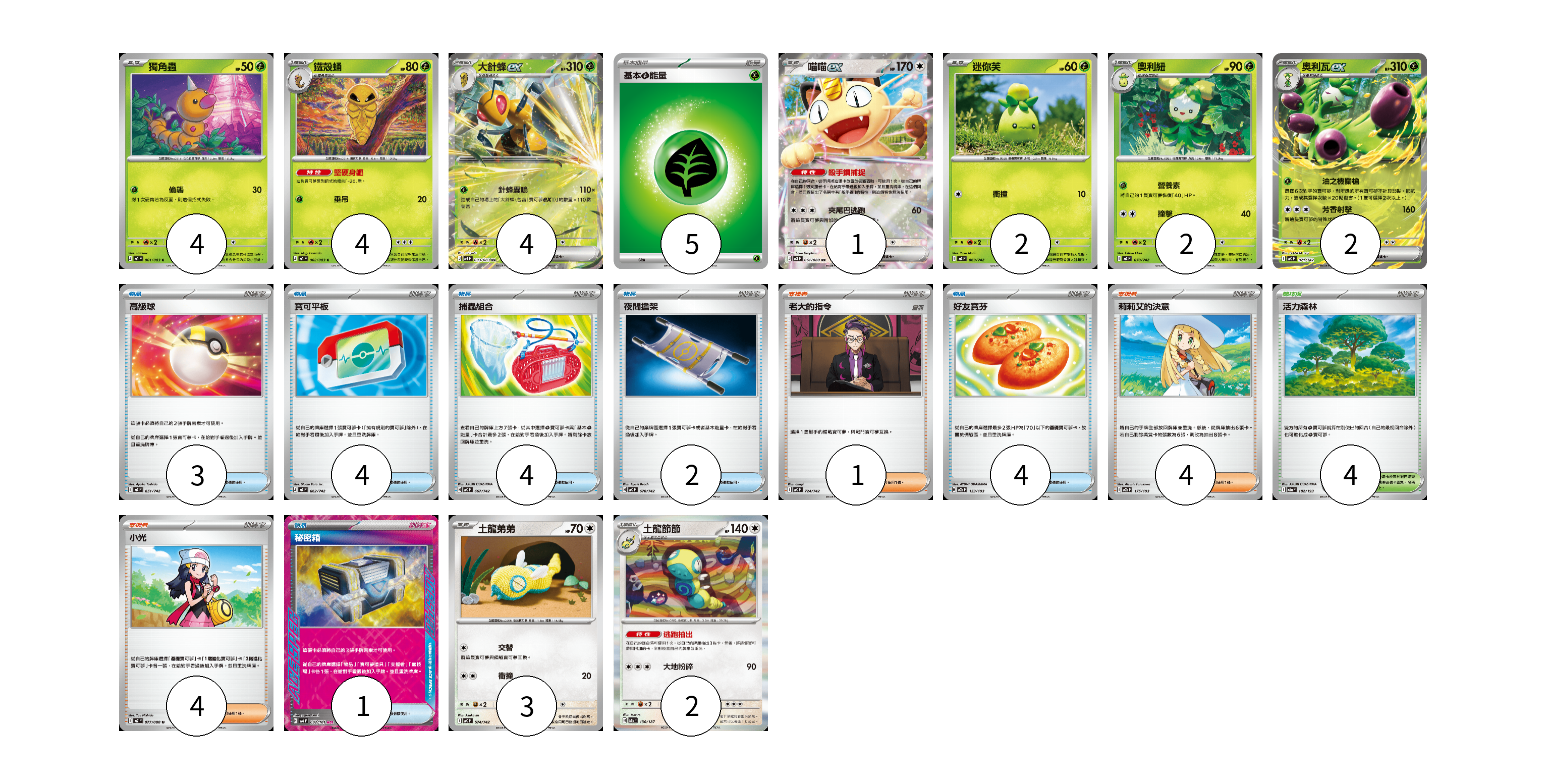牌組構築方案 以此牌組為基礎新構築牌組 顯示卡面 顯示列表 寶可夢卡(24) 4 4 4 1 2 2 2 3 2 物品卡(18) 3 4 4 2 4 1 支援者卡(9) 1 4 4 競技場卡(4) 4 能量卡(5) 5 寶可夢卡(24) 卡牌名稱 張數 卡牌名稱 張數 獨角蟲 M4 001/083 04 鐵殼蛹 M4 002/083 04 大針蜂ex M4 003/083 04 喵喵ex M3 061/080 01 迷你芙 MC 069/742 02 奧利紐 MC 070/742 02 奧利瓦ex MC 071/742 02 土龍弟弟 MC 574/742 03 土龍節節 SV8a 130/187 02 物品卡(18) 卡牌名稱 張數 卡牌名稱 張數 高級球 MC 651/742 03 寶可平板 MC 662/742 04 捕蟲組合 MC 667/742 04 夜間擔架 MC 670/742 02 好友寶芬 M2a 153/193 04 秘密箱 SV6 092/101 01 支援者卡(9) 卡牌名稱 張數 卡牌名稱 張數 老大的指令 MC 724/742 01 莉莉艾的決意 M2a 175/193 04 小光 M2 077/080 04 競技場卡(4) 卡牌名稱 張數 卡牌名稱 張數 活力森林 M2a 182/193 04 能量卡(5) 卡牌名稱 張數 卡牌名稱 張數 基本【草】能量 MJ GRA 05 以此牌組為基礎新構築牌組 牌組編碼 Qbppsi-aeOewd-mhXvpA copy 列印牌組單 牌組編碼已複製 分享至SNS