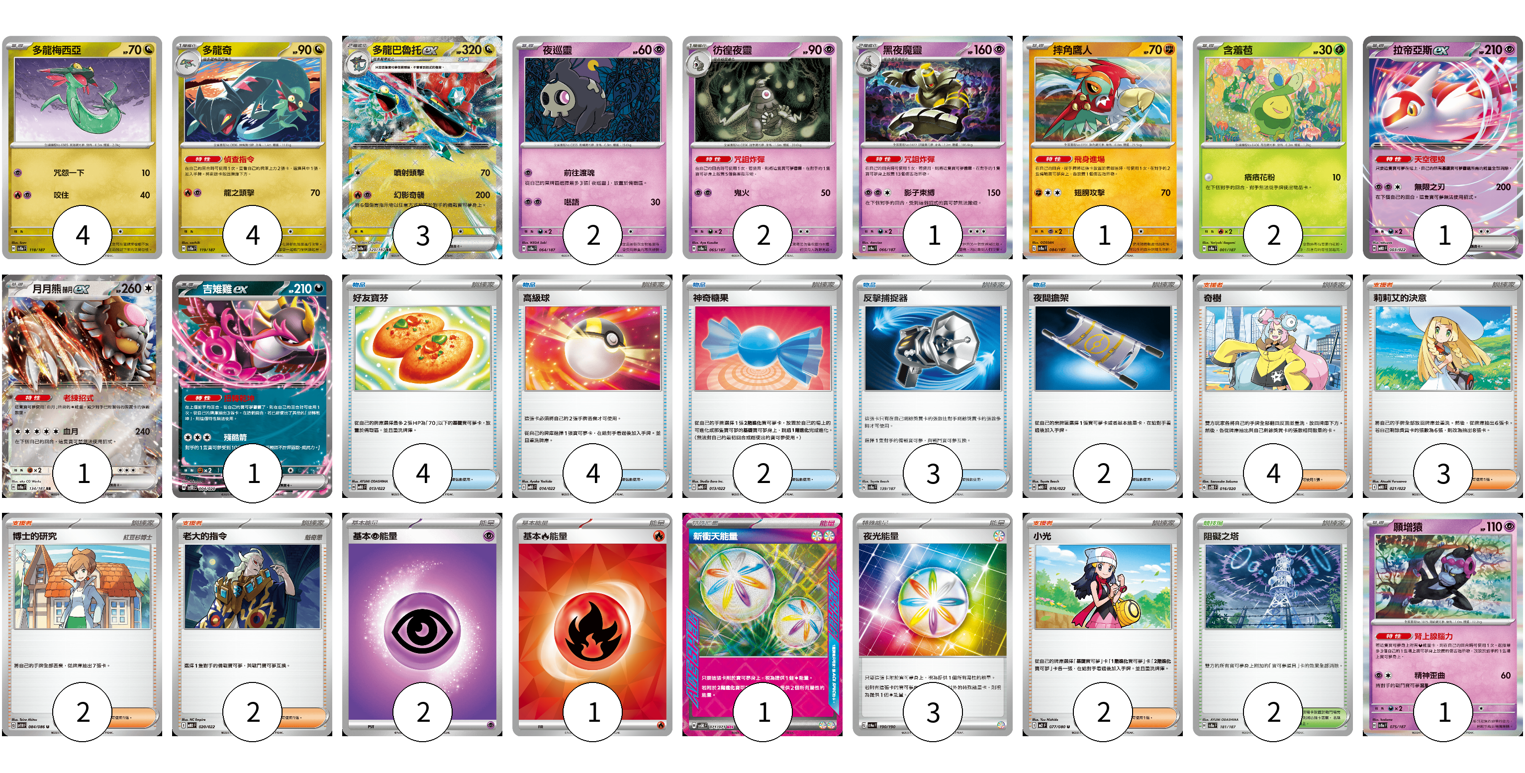 牌組構築方案 以此牌組為基礎新構築牌組 顯示卡面 顯示列表 寶可夢卡(23) 4 4 3 2 2 1 1 2 1 1 1 1 物品卡(15) 4 4 2 3 2 支援者卡(13) 4 3 2 2 2 競技場卡(2) 2 能量卡(7) 2 1 1 3 寶可夢卡(23) 卡牌名稱 張數 卡牌名稱 張數 多龍梅西亞 SV8a 118/187 04 多龍奇 SV8a 119/187 04 多龍巴魯托ex SV8a 120/187 03 夜巡靈 SV8a 064/187 02 彷徨夜靈 SV8a 065/187 02 黑夜魔靈 SV8a 066/187 01 摔角鷹人 SV8a 084/187 01 含羞苞 SV8a 001/187 02 拉帝亞斯ex MBD 003/022 01 月月熊 赫月ex SV8a 134/187 01 吉雉雞ex SVOD 004/020 01 願增猿 SV8a 075/187 01 物品卡(15) 卡牌名稱 張數 卡牌名稱 張數 好友寶芬 MBD 013/022 04 高級球 MBD 014/022 04 神奇糖果 MBG 013/022 02 反擊捕捉器 SV8a 139/187 03 夜間擔架 MBD 016/022 02 支援者卡(13) 卡牌名稱 張數 卡牌名稱 張數 奇樹 SVOD 016/020 04 莉莉艾的決意 MBD 021/022 03 博士的研究 SV11B 084/086 02 老大的指令 MBD 020/022 02 小光 M2 077/080 02 競技場卡(2) 卡牌名稱 張數 卡牌名稱 張數 阻礙之塔 SV8a 181/187 02 能量卡(7) 卡牌名稱 張數 卡牌名稱 張數 基本【超】能量 MBD PSY 02 基本【火】能量 SVQL FIR 01 新衝天能量 SV5K 071/071 01 夜光能量 SV4a 190/190 03 以此牌組為基礎新構築牌組 牌組編碼 QdcUkh-JvXbqY-RwSyrQ copy 列印牌組單 牌組編碼已複製 分享至SNS