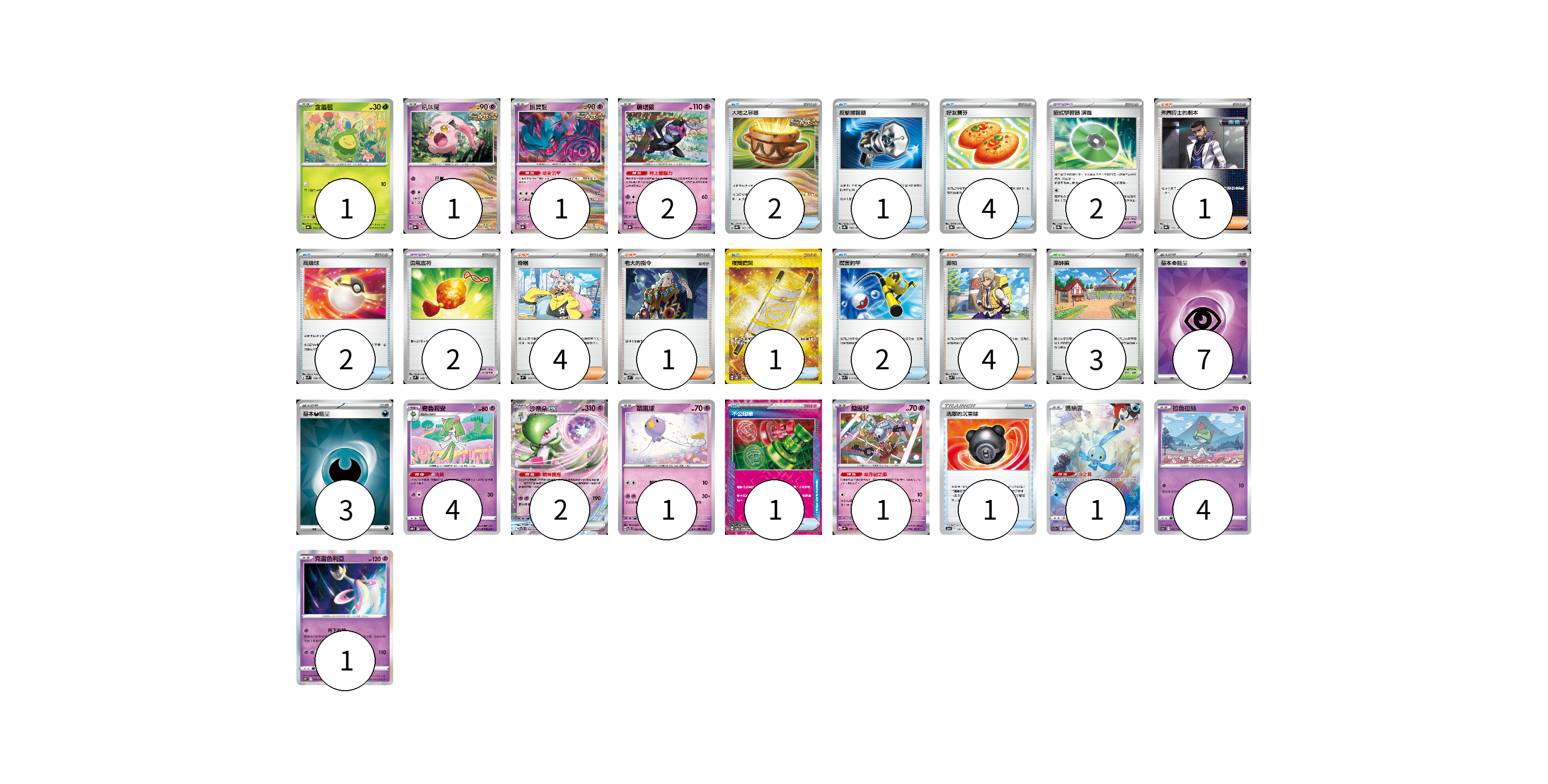牌組構築方案 以此牌組為基礎新構築牌組 顯示卡面 顯示列表 寶可夢卡(19) 1 1 1 2 4 2 1 1 1 4 1 寶可夢道具(4) 2 2 物品卡(14) 2 1 4 2 1 2 1 1 支援者卡(10) 1 4 1 4 競技場卡(3) 3 能量卡(10) 7 3 寶可夢卡(19) 卡牌名稱 張數 卡牌名稱 張數 含羞苞 SV8a 001/187 01 吼叫尾 SV8a 071/187 01 振翼髮 SV8a 072/187 01 願增猿 SV8a 075/187 02 奇魯莉安 SVTS 003/022 04 沙奈朵ex SVTS 004/022 02 飄飄球 SVTS 005/022 01 鑰圈兒 SV4a 087/190 01 瑪納霏 S12a 178/172 01 拉魯拉絲 S9a 032/067 04 克雷色利亞 S10D 028/067 01 寶可夢道具(4) 卡牌名稱 張數 卡牌名稱 張數 招式學習器 演進 SV8a 160/187 02 勇氣護符 SVM 142/175 02 物品卡(14) 卡牌名稱 張數 卡牌名稱 張數 大地之容器 SV8a 143/187 02 反擊捕捉器 SV8a 139/187 01 好友寶芬 SV8a 147/187 04 高級球 SVM 134/175 02 夜間擔架 SV8 137/106 01 厲害釣竿 SVK 011/042 02 不公印章 SV5a 053/066 01 洗翠的沉重球 S12a 140/172 01 支援者卡(10) 卡牌名稱 張數 卡牌名稱 張數 弗圖博士的劇本 SV8a 175/187 01 奇樹 SVM 160/175 04 老大的指令 SVM 172/175 01 派帕 SVK 035/042 04 競技場卡(3) 卡牌名稱 張數 卡牌名稱 張數 深缽鎮 SVK 039/042 03 能量卡(10) 卡牌名稱 張數 卡牌名稱 張數 基本【超】能量 SVK PSY 07 基本【惡】能量 SVK DAR 03 以此牌組為基礎新構築牌組 牌組編碼 QhZVvH-ijdhqG-sDQCwy copy 列印牌組單 牌組編碼已複製 分享至SNS