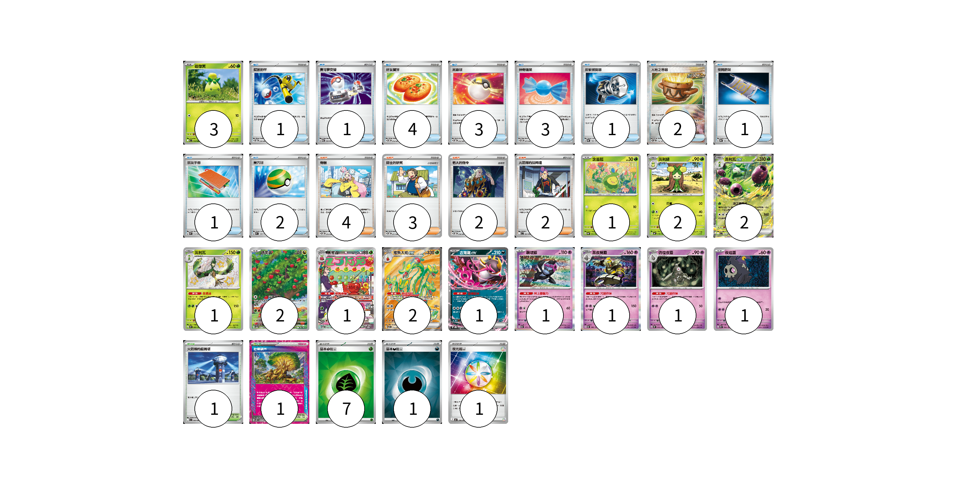 牌組構築方案 以此牌組為基礎新構築牌組 顯示卡面 顯示列表 寶可夢卡(19) 3 1 2 2 1 2 1 2 1 1 1 1 1 物品卡(19) 1 1 4 3 3 1 2 1 1 2 支援者卡(11) 4 3 2 2 競技場卡(2) 1 1 能量卡(9) 7 1 1 寶可夢卡(19) 卡牌名稱 張數 卡牌名稱 張數 迷你芙 SV10 010/098 03 含羞苞 SV8a 001/187 01 奧利紐 SV4a 016/190 02 奧利瓦ex SV10 012/098 02 奧利瓦 SV4a 205/190 01 啃果蟲 SV5a 077/066 02 裹蜜蟲 SV6 103/101 01 蜜集大蛇ex SV7 115/102 02 吉雉雞ex SVOD 004/020 01 願增猿 SV8a 075/187 01 黑夜魔靈 SV8a 066/187 01 彷徨夜靈 SV8a 065/187 01 夜巡靈 SV8a 064/187 01 物品卡(19) 卡牌名稱 張數 卡牌名稱 張數 厲害釣竿 SVOD 010/020 01 寶可夢交替 SV9a 058/063 01 好友寶芬 SVOM 012/021 04 高級球 SVOD 012/020 03 神奇糖果 SVOM 014/021 03 反擊捕捉器 SV8a 139/187 01 大地之容器 SV8a 143/187 02 夜間擔架 SV8a 151/187 01 朋友手冊 SVK 014/042 01 巢穴球 SVM 133/175 02 支援者卡(11) 卡牌名稱 張數 卡牌名稱 張數 奇樹 SVOD 016/020 04 博士的研究 SVOD 017/020 03 老大的指令 SVOD 019/020 02 火箭隊的拉姆達 SV10 094/098 02 競技場卡(2) 卡牌名稱 張數 卡牌名稱 張數 火箭隊的監視塔 SV10 096/098 01 壯偉碩木 SV7 101/102 01 能量卡(9) 卡牌名稱 張數 卡牌名稱 張數 基本【草】能量 SVM GRA 07 基本【惡】能量 SVM DAR 01 夜光能量 SV4a 190/190 01 以此牌組為基礎新構築牌組 牌組編碼 QhtRaz-HyVBmq-SECCoH copy 列印牌組單 牌組編碼已複製 分享至SNS