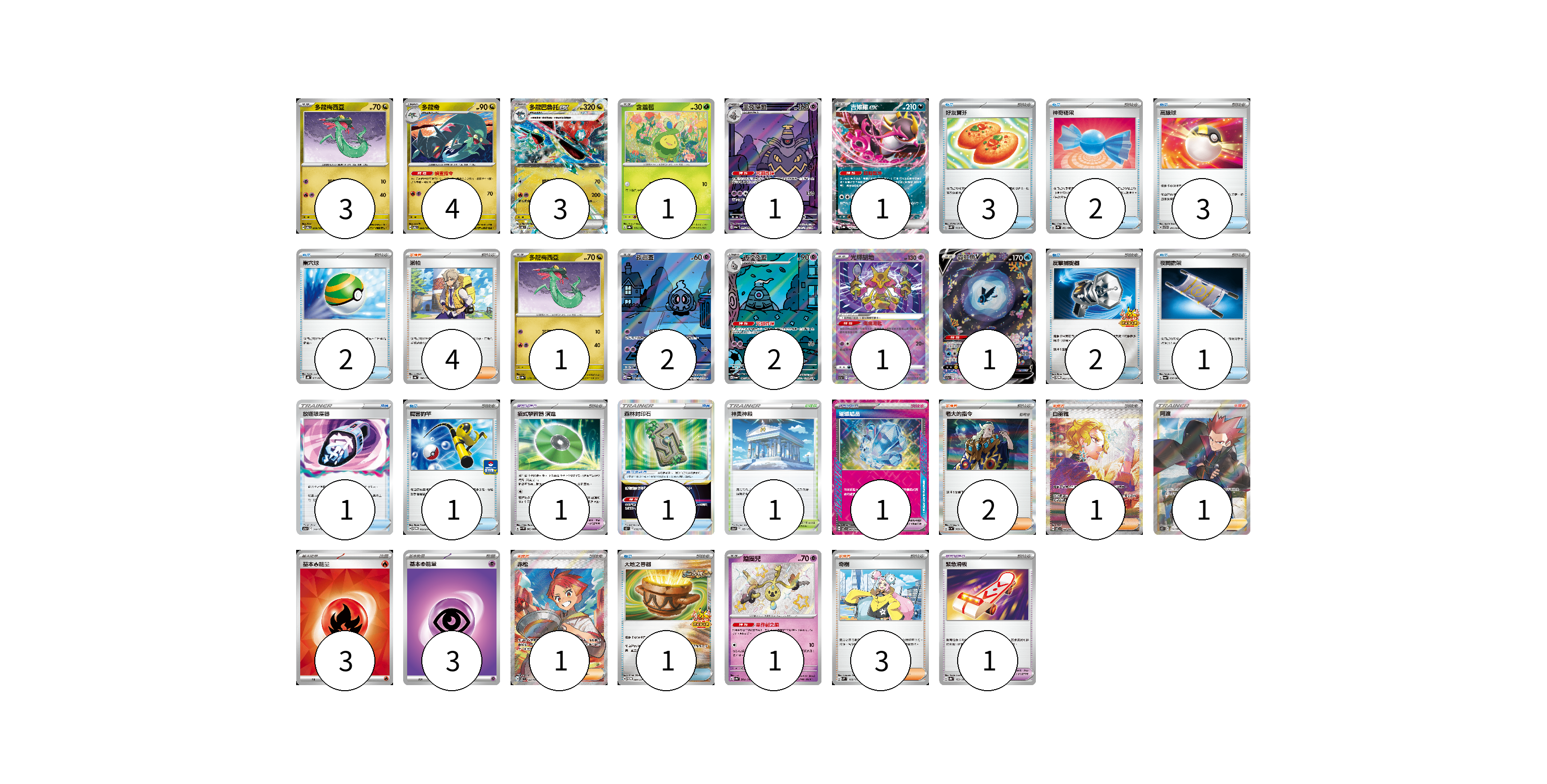 牌組構築方案 以此牌組為基礎新構築牌組 顯示卡面 顯示列表 寶可夢卡(21) 3 4 3 1 1 1 1 2 2 1 1 1 寶可夢道具(4) 1 1 1 1 物品卡(16) 3 2 3 2 2 1 1 1 1 支援者卡(12) 4 2 1 1 1 3 競技場卡(1) 1 能量卡(6) 3 3 寶可夢卡(21) 卡牌名稱 張數 卡牌名稱 張數 多龍梅西亞 SV6 079/101 03 多龍奇 SV6 080/101 04 多龍巴魯托ex SV6 081/101 03 含羞苞 SV8a 001/187 01 黑夜魔靈 SV6a 070/064 01 吉雉雞ex SV8a 104/187 01 多龍梅西亞 SV8a 118/187 01 夜巡靈 SV6a 068/064 02 彷徨夜靈 SV6a 069/064 02 光輝胡地 S11a 031/068 01 霓虹魚V S12a 216/172 01 鑰圈兒 SV4a 264/190 01 寶可夢道具(4) 卡牌名稱 張數 卡牌名稱 張數 招式學習器 演進 SV4M 063/066 01 森林封印石 S12 092/098 01 璀璨結晶 SV7 094/102 01 緊急滑板 SV8a 153/187 01 物品卡(16) 卡牌名稱 張數 卡牌名稱 張數 好友寶芬 SV5K 063/071 03 神奇糖果 SV3a 053/062 02 高級球 SVTH 011/018 03 巢穴球 SVHK 012/022 02 反擊捕捉器 SV-P 083/SV-P 02 夜間擔架 SV6a 056/064 01 放逐吸塵器 S12a 144/172 01 厲害釣竿 SV-P 112/SV-P 01 大地之容器 SV-P 084/SV-P 01 支援者卡(12) 卡牌名稱 張數 卡牌名稱 張數 派帕 SV4a 180/190 04 老大的指令 SV1a 069/073 02 白蕾雅 SV7 132/102 01 阿渡 S12 114/098 01 赤松 SV7 123/102 01 奇樹 SVM 160/175 03 競技場卡(1) 卡牌名稱 張數 卡牌名稱 張數 神奧神殿 S12a 169/172 01 能量卡(6) 卡牌名稱 張數 卡牌名稱 張數 基本【火】能量 SVM FIR 03 基本【超】能量 SVAW PSY 03 以此牌組為基礎新構築牌組 牌組編碼 QkYDdA-eecdvm-bRfuvh copy 列印牌組單 牌組編碼已複製 分享至SNS
