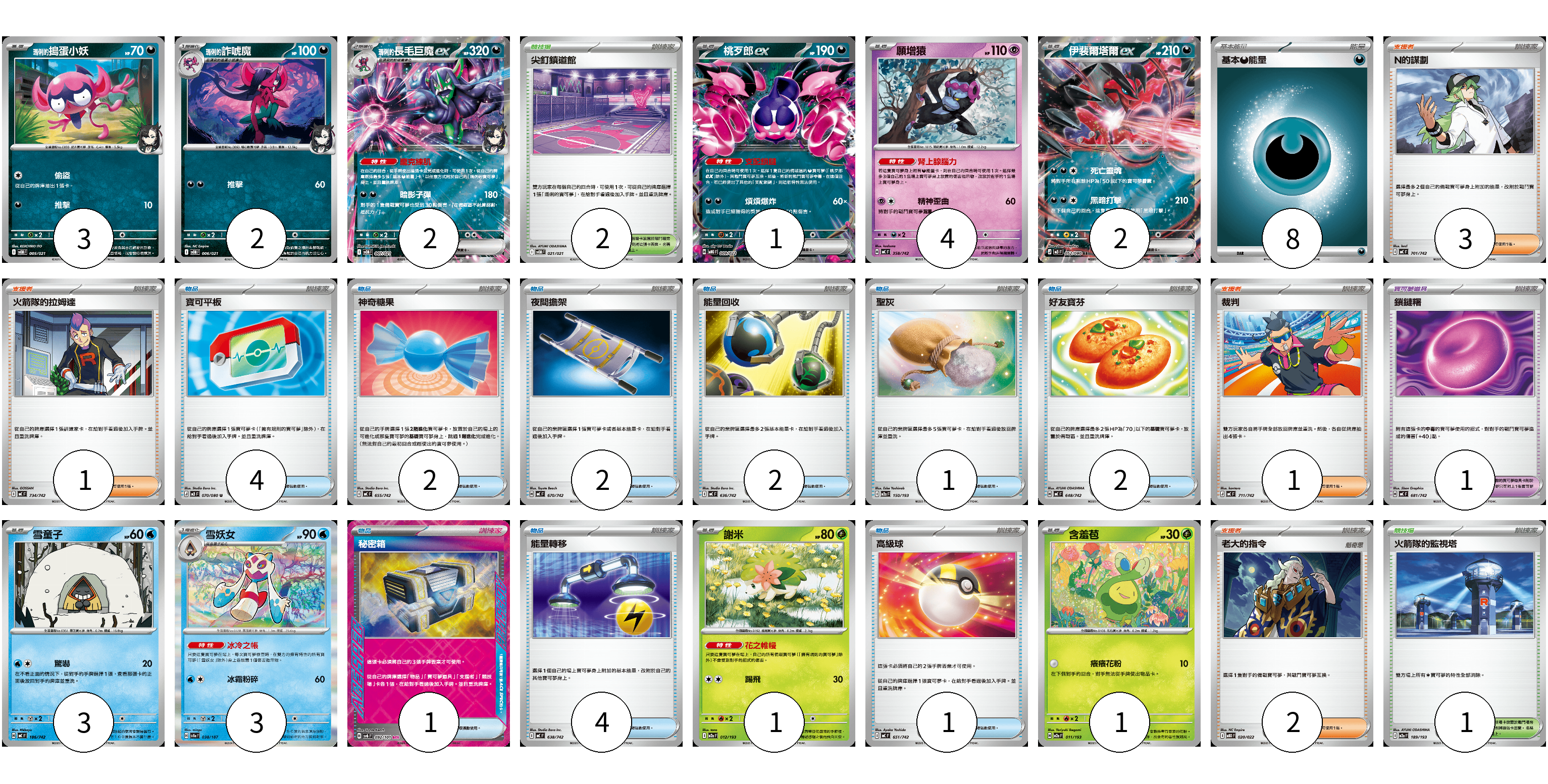 牌組構築方案 以此牌組為基礎新構築牌組 顯示卡面 顯示列表 寶可夢卡(22) 3 2 2 1 4 2 3 3 1 1 寶可夢道具(1) 1 物品卡(19) 4 2 2 2 1 2 1 4 1 支援者卡(7) 3 1 1 2 競技場卡(3) 2 1 能量卡(8) 8 寶可夢卡(22) 卡牌名稱 張數 卡牌名稱 張數 <瑪俐的>搗蛋小妖 SVOM 005/021 03 <瑪俐的>詐唬魔 SVOM 006/021 02 <瑪俐的>長毛巨魔ex SVOM 007/021 02 桃歹郎ex MBG 009/022 01 願增猿 MC 358/742 04 伊裴爾塔爾ex M3 052/080 02 雪童子 MC 186/742 03 雪妖女 SV8a 038/187 03 謝米 M2a 012/193 01 含羞苞 M2a 011/193 01 寶可夢道具(1) 卡牌名稱 張數 卡牌名稱 張數 鎖鏈糬 MC 681/742 01 物品卡(19) 卡牌名稱 張數 卡牌名稱 張數 寶可平板 M3 070/080 04 神奇糖果 MC 655/742 02 夜間擔架 MC 670/742 02 能量回收 MC 636/742 02 聖灰 M2a 150/193 01 好友寶芬 MC 648/742 02 秘密箱 SV6 092/101 01 能量轉移 MC 638/742 04 高級球 MC 651/742 01 支援者卡(7) 卡牌名稱 張數 卡牌名稱 張數 N的謀劃 MC 701/742 03 火箭隊的拉姆達 MC 734/742 01 裁判 MC 711/742 01 老大的指令 MBD 020/022 02 競技場卡(3) 卡牌名稱 張數 卡牌名稱 張數 尖釘鎮道館 SVOM 021/021 02 火箭隊的監視塔 M2a 189/193 01 能量卡(8) 卡牌名稱 張數 卡牌名稱 張數 基本【惡】能量 MC DAR 08 以此牌組為基礎新構築牌組 牌組編碼 QprtkM-GKJeyH-KGQbOP copy 列印牌組單 牌組編碼已複製 分享至SNS