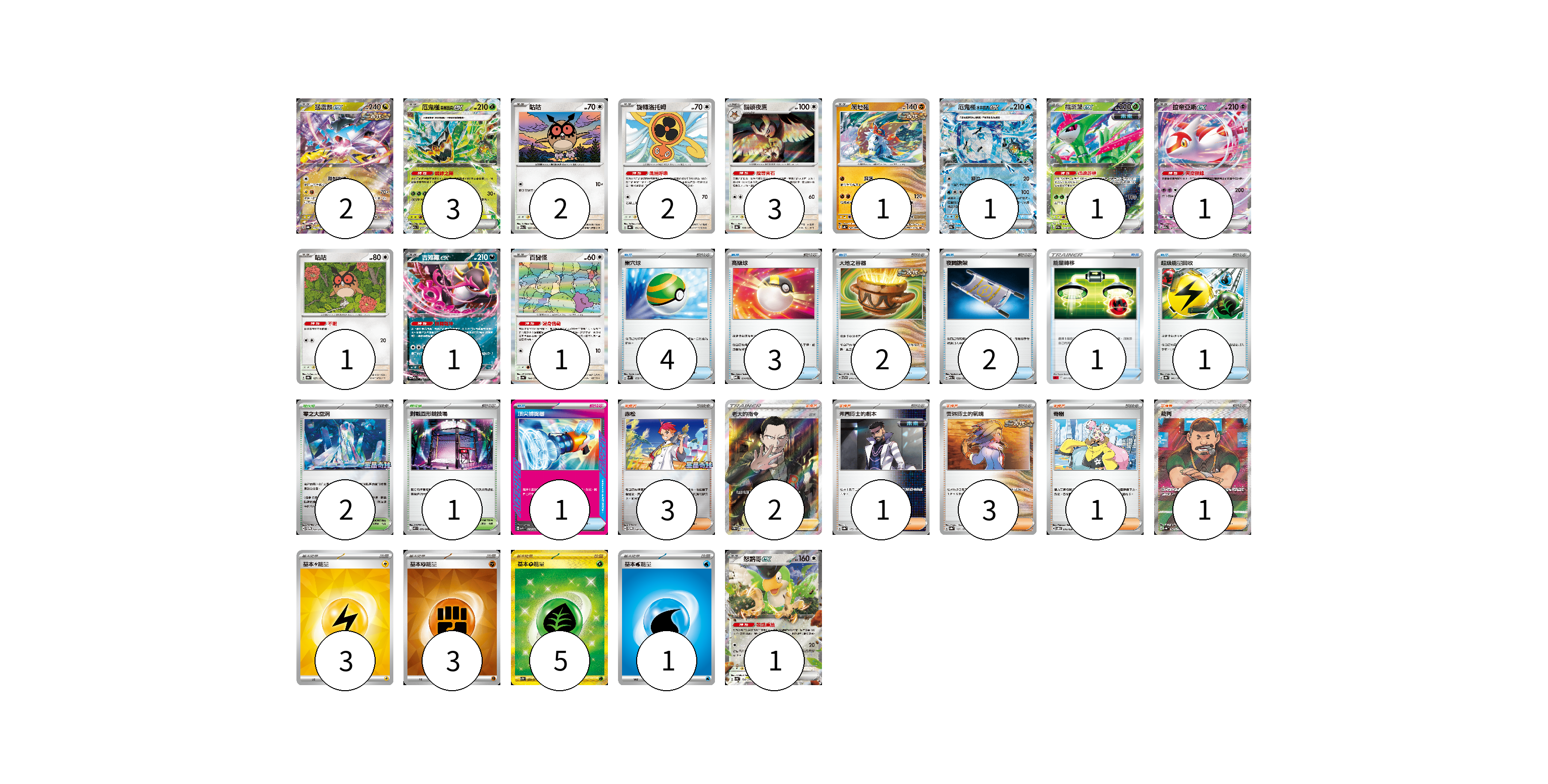 牌組構築方案 以此牌組為基礎新構築牌組 顯示卡面 顯示列表 寶可夢卡(20) 2 3 2 2 3 1 1 1 1 1 1 1 1 物品卡(14) 4 3 2 2 1 1 1 支援者卡(11) 3 2 1 3 1 1 競技場卡(3) 2 1 能量卡(12) 3 3 5 1 寶可夢卡(20) 卡牌名稱 張數 卡牌名稱 張數 猛雷鼓ex SV8a 124/187 02 厄鬼椪 碧草面具ex M2a 017/193 03 咕咕 M2a 137/193 02 旋轉洛托姆 SV8a 131/187 02 貓頭夜鷹 SV8a 128/187 03 爬地翅 SV4K 041/066 01 厄鬼椪 水井面具ex SV8a 050/187 01 鐵斑葉ex SV5M 016/071 01 拉帝亞斯ex M2a 075/193 01 咕咕 SV8a 127/187 01 吉雉雞ex M2a 114/193 01 百變怪 SV4a 144/190 01 怒鸚哥ex SV4a 154/190 01 物品卡(14) 卡牌名稱 張數 卡牌名稱 張數 巢穴球 SVM 133/175 04 高級球 MBD 014/022 03 大地之容器 SVTG 010/019 02 夜間擔架 M2a 159/193 02 能量轉移 SDL 011/021 01 超級能量回收 SV8a 141/187 01 頂尖捕捉器 MBG 014/022 01 支援者卡(11) 卡牌名稱 張數 卡牌名稱 張數 赤松 SV-P 150/SV-P 03 老大的指令(坂木) SC1b 170/153 02 弗圖博士的劇本 SV8a 175/187 01 奧琳博士的氣魄 SV8a 167/187 03 奇樹 SVOD 016/020 01 裁判 SV4a 342/190 01 競技場卡(3) 卡牌名稱 張數 卡牌名稱 張數 零之大空洞 SV-P 151/SV-P 02 對戰圓形競技場 M2 079/080 01 能量卡(12) 卡牌名稱 張數 卡牌名稱 張數 基本【雷】能量 SVQP LIG 03 基本【鬥】能量 SVM FIG 03 基本【草】能量 SV2D 099/071 05 基本水能量 sv-p WAT 01 以此牌組為基礎新構築牌組 牌組編碼 QtGHbU-tnvvTU-RipbHH copy 列印牌組單 牌組編碼已複製 分享至SNS