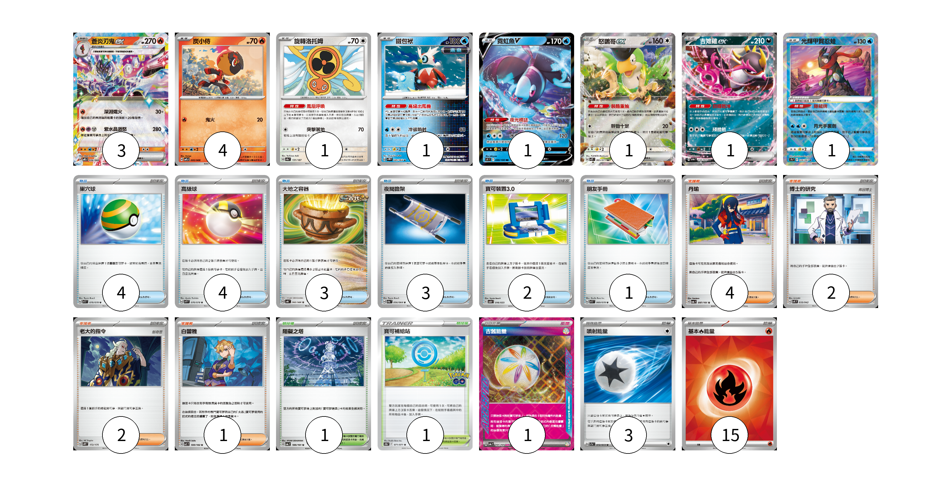 牌組構築方案 以此牌組為基礎新構築牌組 顯示卡面 顯示列表 寶可夢卡(13) 3 4 1 1 1 1 1 1 物品卡(17) 4 4 3 3 2 1 支援者卡(9) 4 2 2 1 競技場卡(2) 1 1 能量卡(19) 1 3 15 寶可夢卡(13) 卡牌名稱 張數 卡牌名稱 張數 蒼炎刃鬼ex SVPS 006/008 03 炭小侍 SVPS 005/008 04 旋轉洛托姆 SV8a 131/187 01 鐵包袱 SV4M 020/066 01 霓虹魚V S9 030/100 01 怒鸚哥ex SV2P 065/071 01 吉雉雞ex SV6a 038/064 01 光輝甲賀忍蛙 S9a 026/067 01 物品卡(17) 卡牌名稱 張數 卡牌名稱 張數 巢穴球 SV1S 070/078 04 高級球 SV1V 070/078 04 大地之容器 SV4K 060/066 03 夜間擔架 SV6a 056/064 03 寶可裝置3.0 SVAW 016/023 02 朋友手冊 SV1S 069/078 01 支援者卡(9) 卡牌名稱 張數 卡牌名稱 張數 丹瑜 SV6 097/101 04 博士的研究 SVK 033/042 02 老大的指令 SVM 172/175 02 白蕾雅 SV7 100/102 01 競技場卡(2) 卡牌名稱 張數 卡牌名稱 張數 阻礙之塔 SV6 100/101 01 寶可補給站 S10b 071/071 01 能量卡(19) 卡牌名稱 張數 卡牌名稱 張數 古舊能量 SV6 101/101 01 噴射能量 SV1a 072/073 03 基本【火】能量 SVK FIR 15 以此牌組為基礎新構築牌組 牌組編碼 QvtJST-IUfVsc-DMfGgX copy 列印牌組單 牌組編碼已複製 分享至SNS